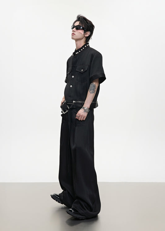 Glossy Double Collar Fake Layered Short Sleeve T-Shirt & Wide Leg Pants Setup WN18371