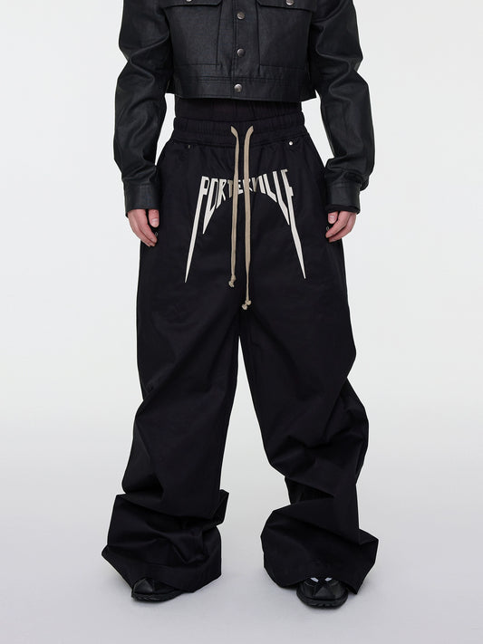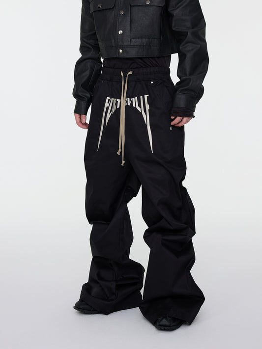 Coated Fabric Embroidery Drawstring Stacked Flare Wide Leg Pants WN16950