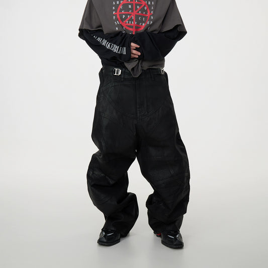 Waxed Coated Biker Armor Pleats Wide Leg Dragging Denim Jeans WN17003