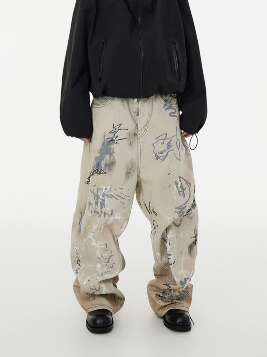 Paint Washed Hand-Drawn Graffiti Design Baggy Dragging Denim Jeans WN16997