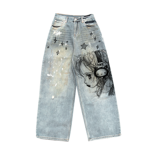 Cross Print Damage Wide Leg Denim Jeans WN22227