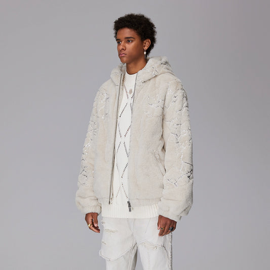 Paint Damage Stand Neck Fake Fur Coat WN22640