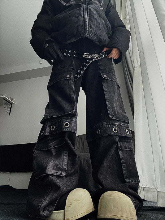 Large Pocket Ring Detail Wide Leg Cargo Denim Jeans WN18151