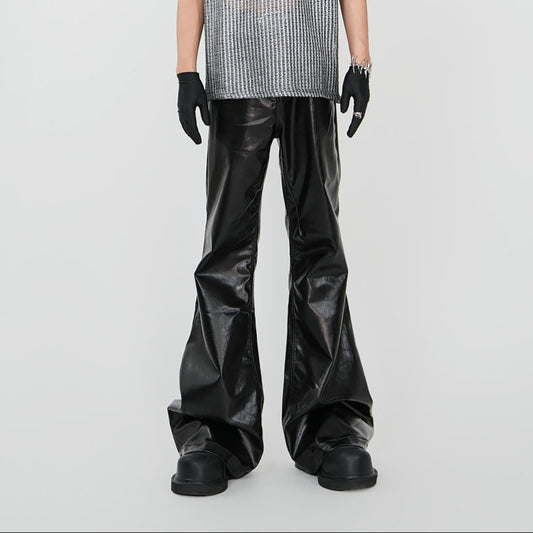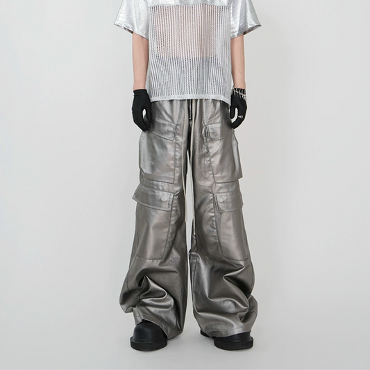 Matte Coated Wide Leg Cargo Pants & Cutout PU Leather Short Sleeve T-Shirt Set WN17389