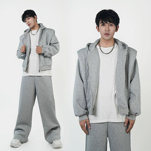 Heavyweight Oversize Fake Layered Zipper Hoodie & Wide Leg Pants Setup WN17413