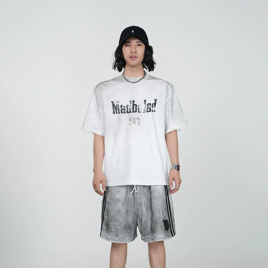 Washed Letter Design Short Sleeve T-Shirt & Heavyweight Half Pants Set WN17379