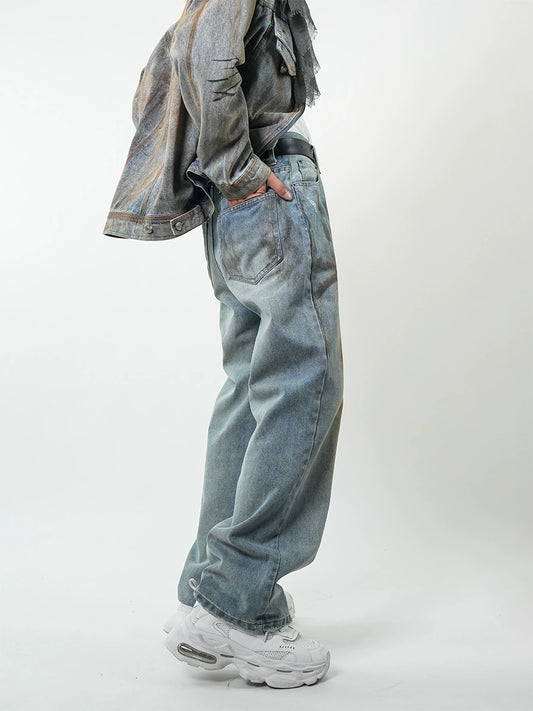Stain Washed Design Wide Leg Denim Jeans WN17275