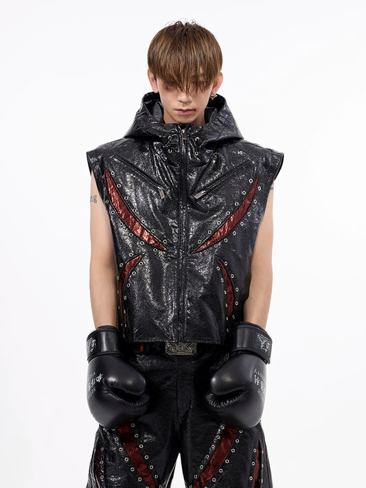 Frayed Denim Patch Rivet PU Leather Short Jacket & PU Leather Pants Setup WN22123