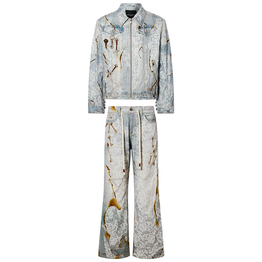 Deconstructed Metal Rivet Washed Damage Straight Denim Jeans & Denim Jacket Setup WN21968