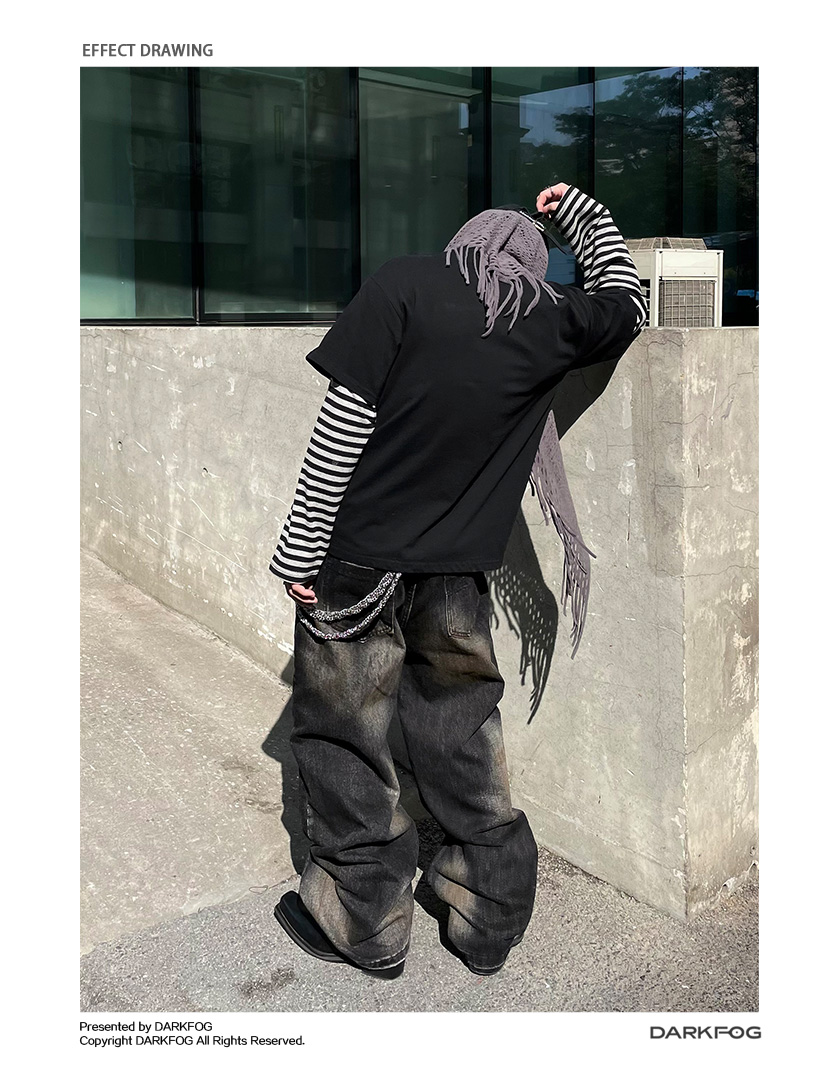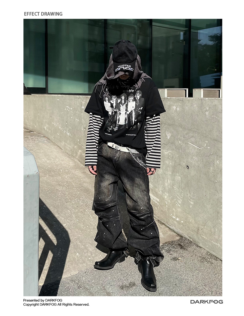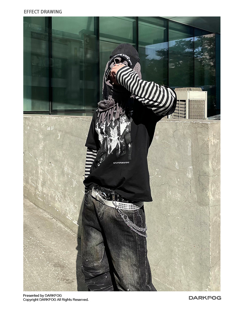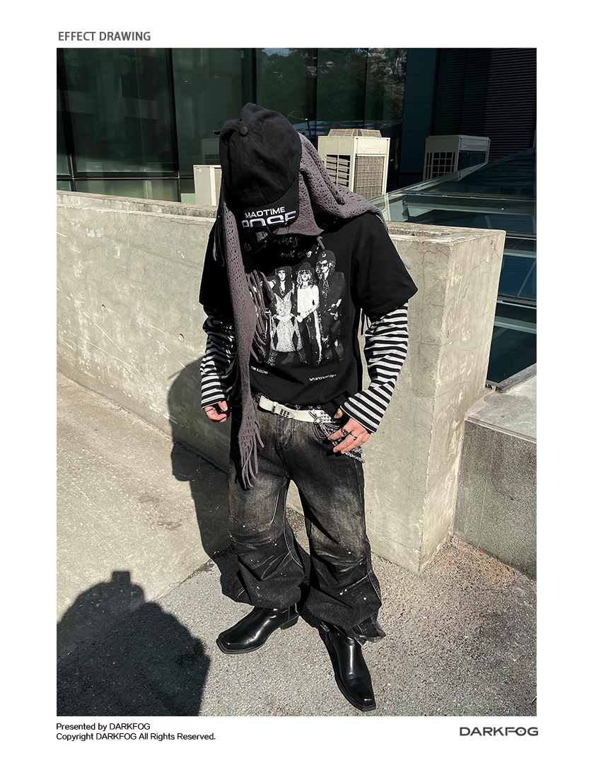 Rock Graphic Fake Layered Striped Long Sleeve T-Shirt WN12876