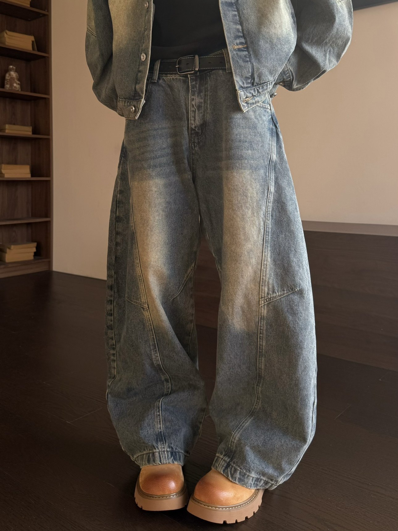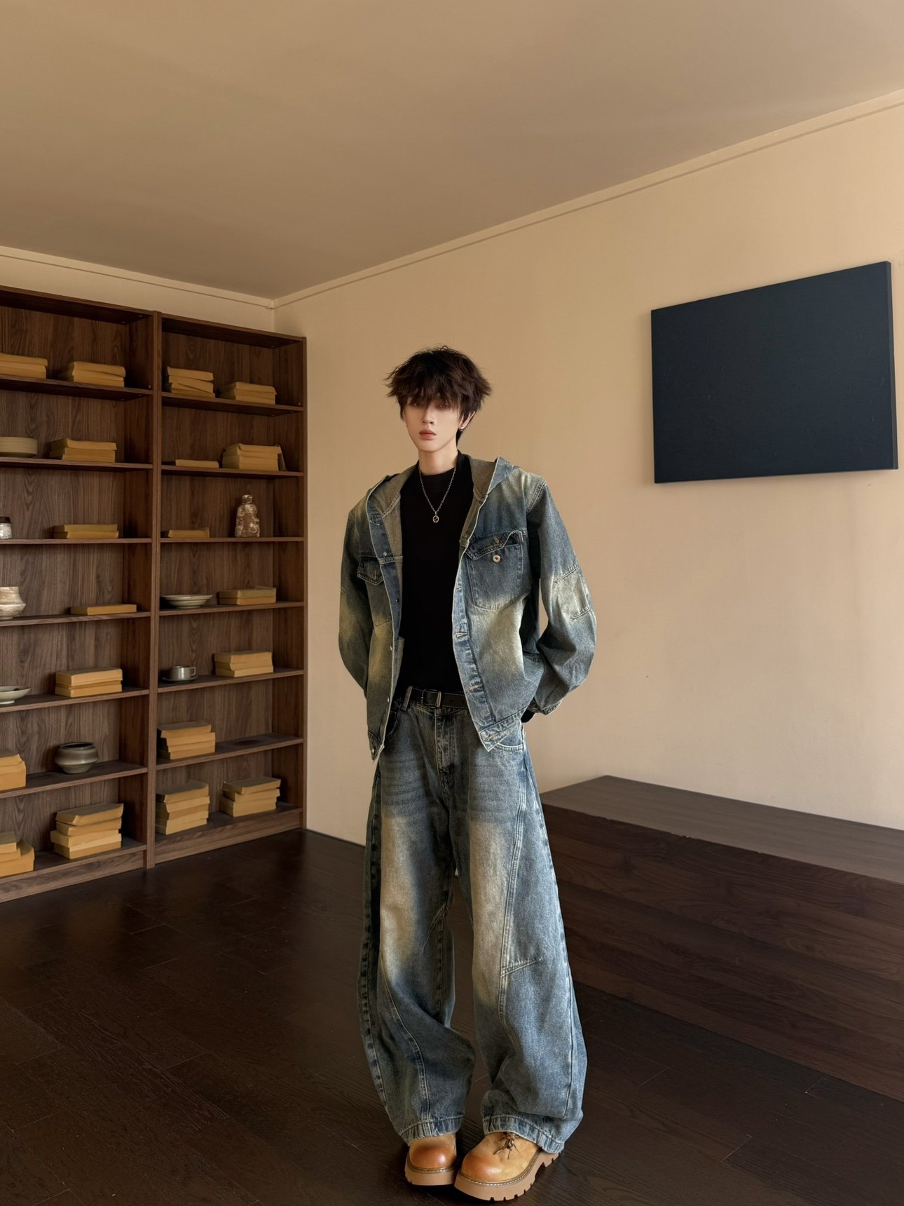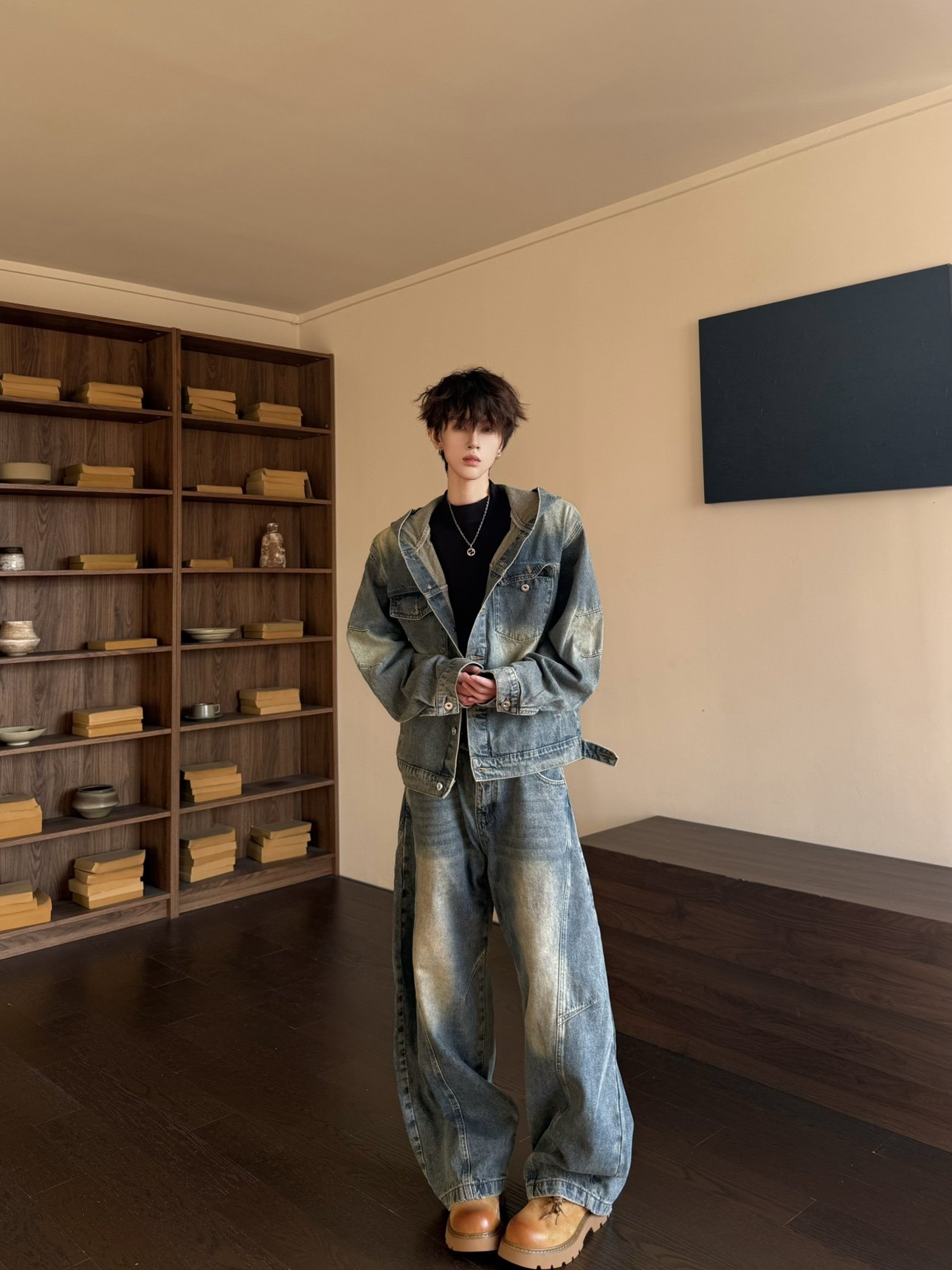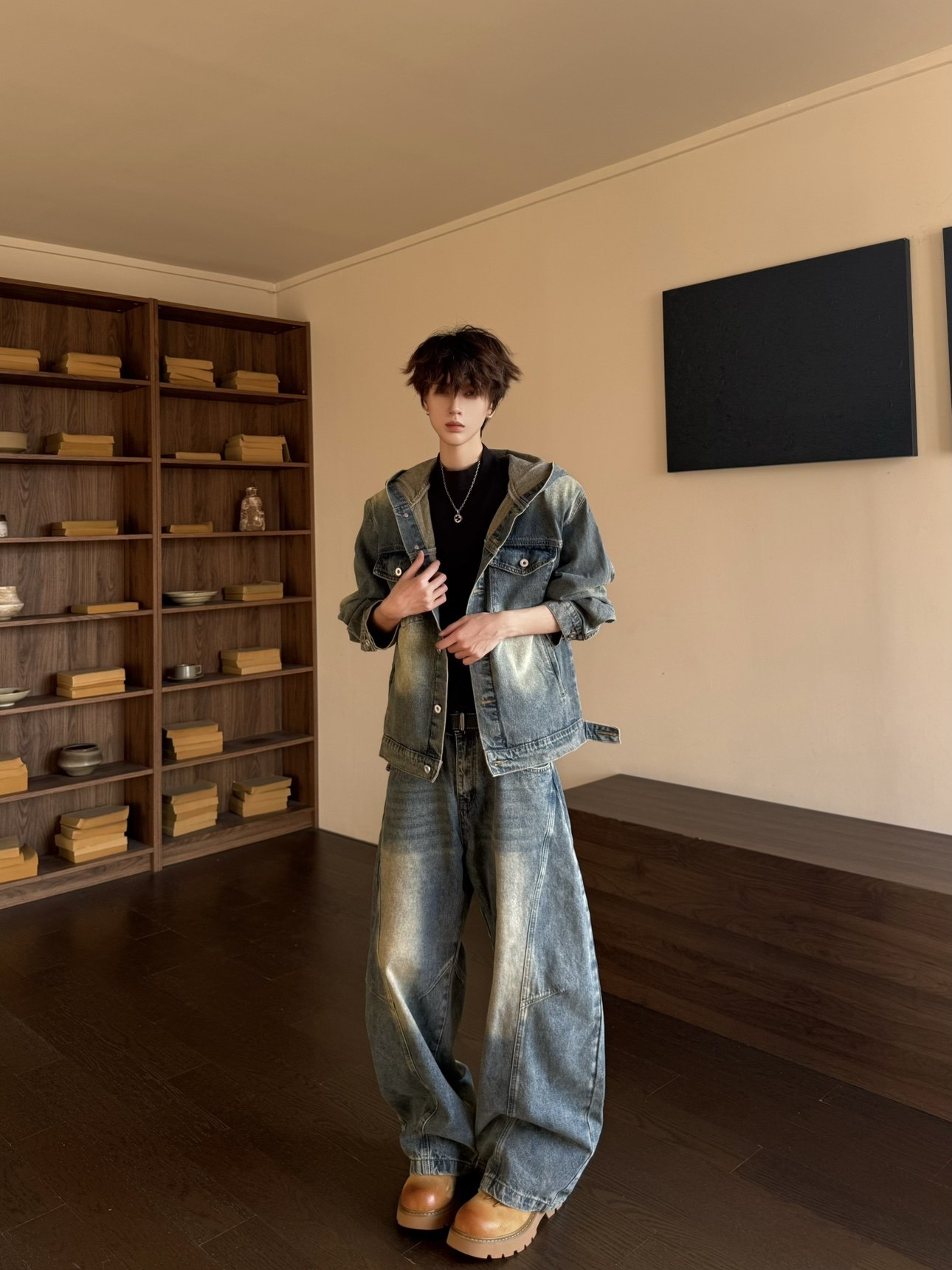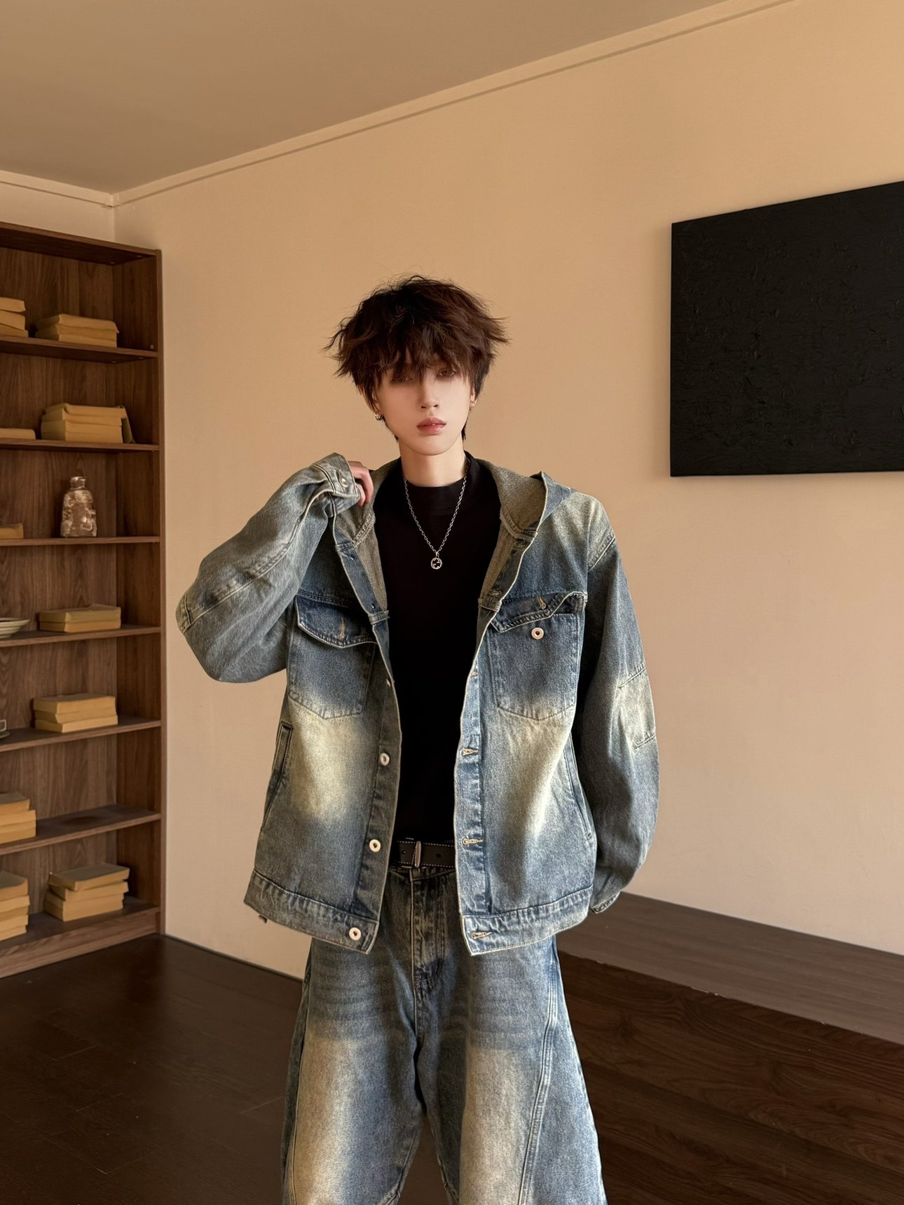 Washed Deconstructed Hooded Jacket & Curved Denim Jeans Setup WN23149