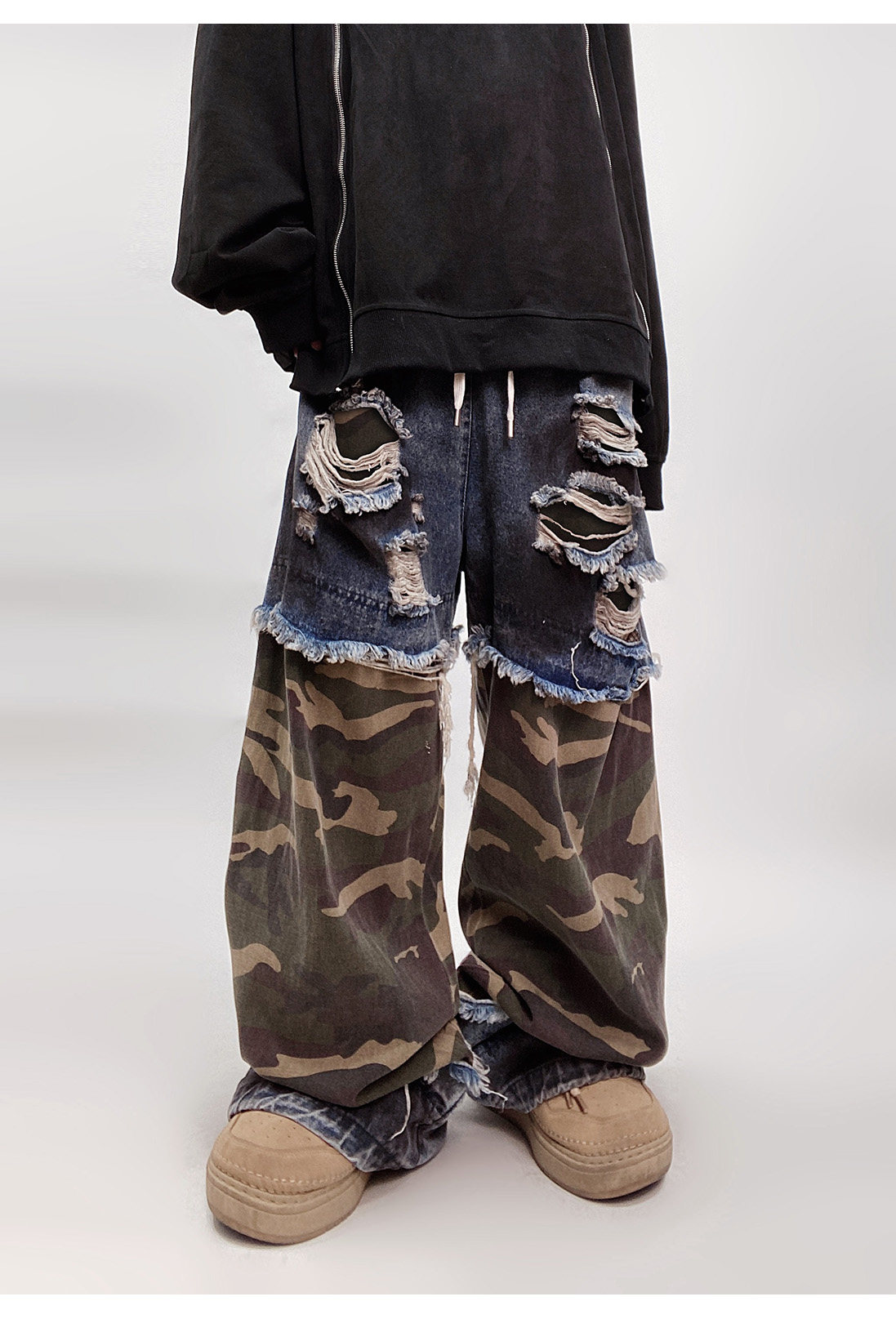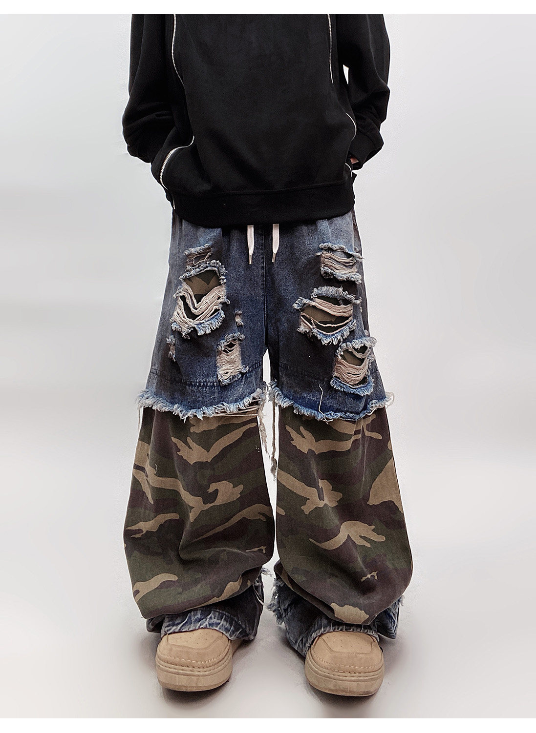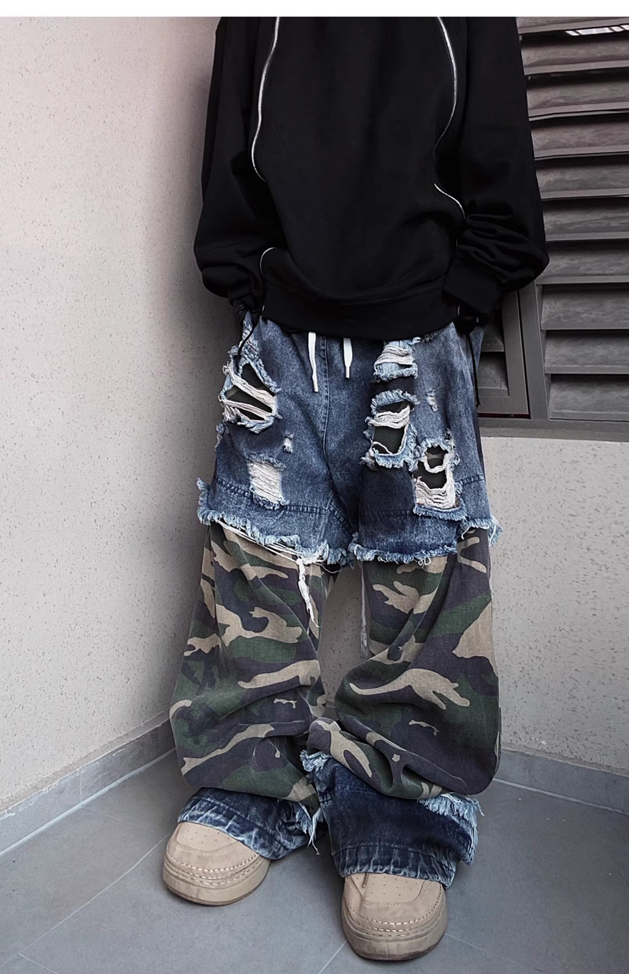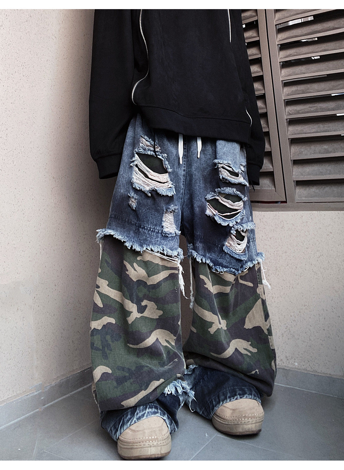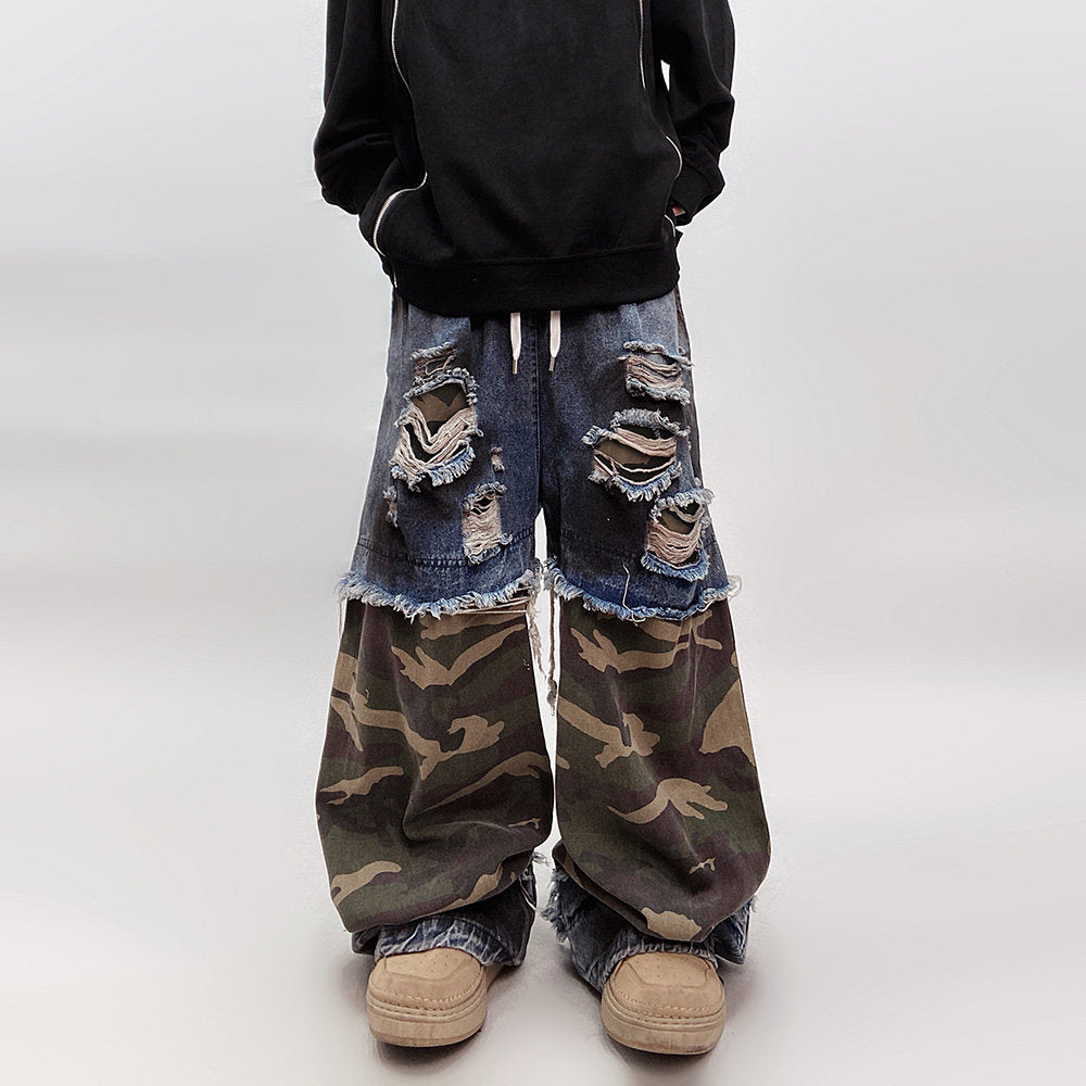 Camouflage Ripped Wide Leg Denim Jeans WN23993