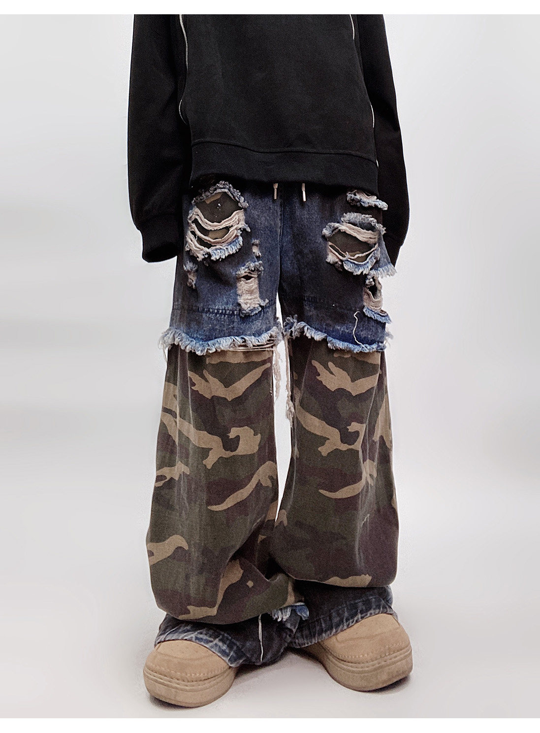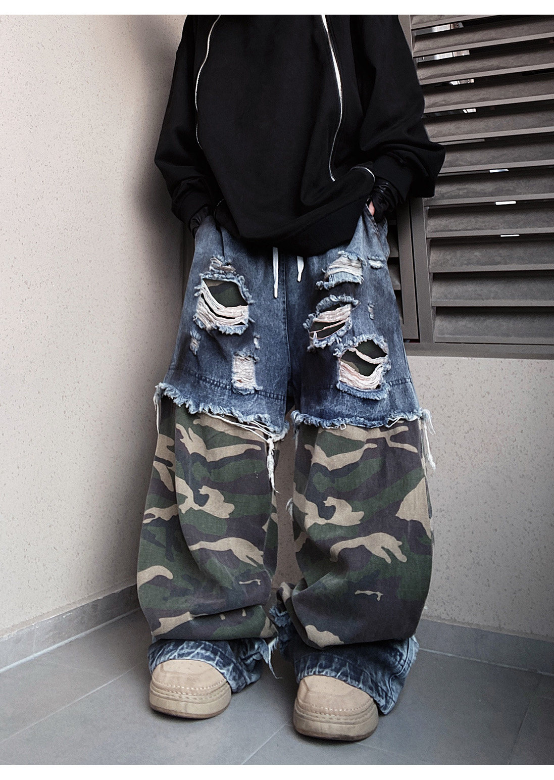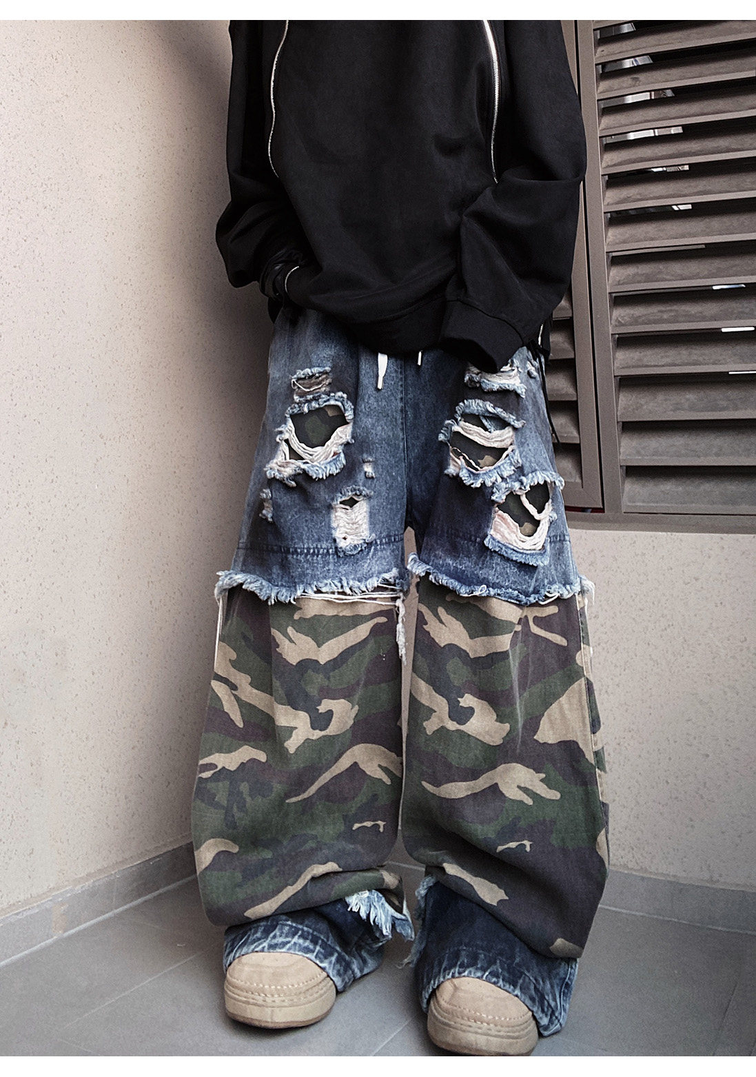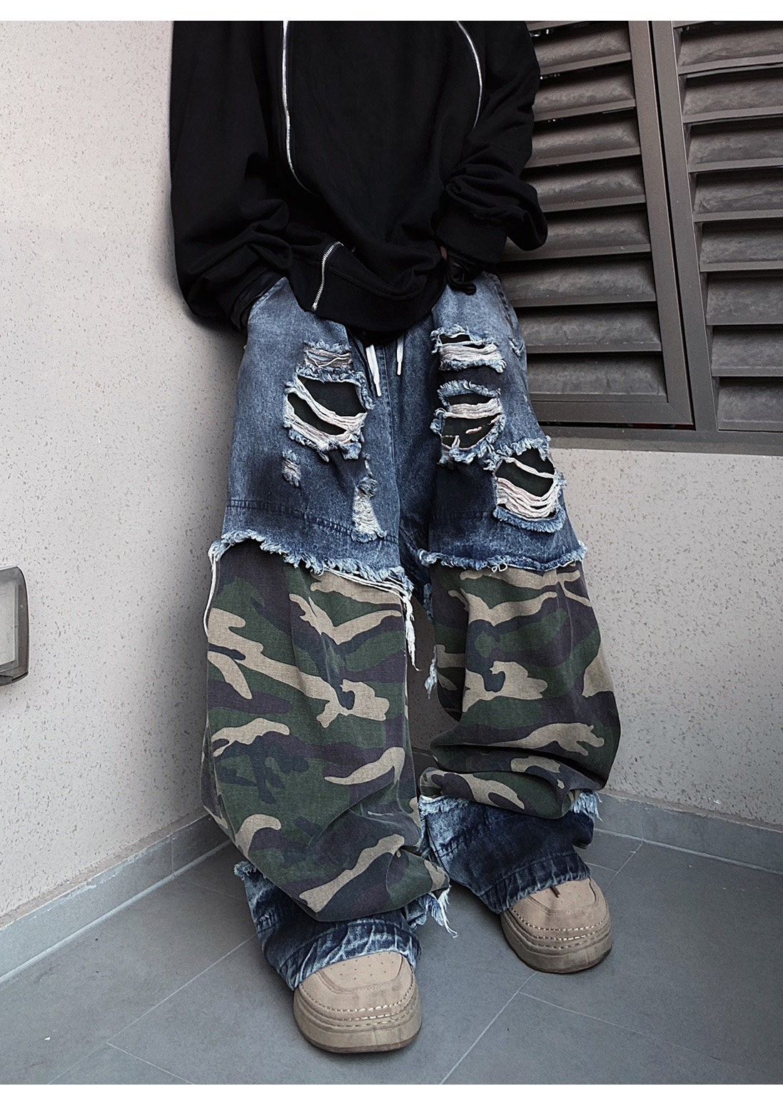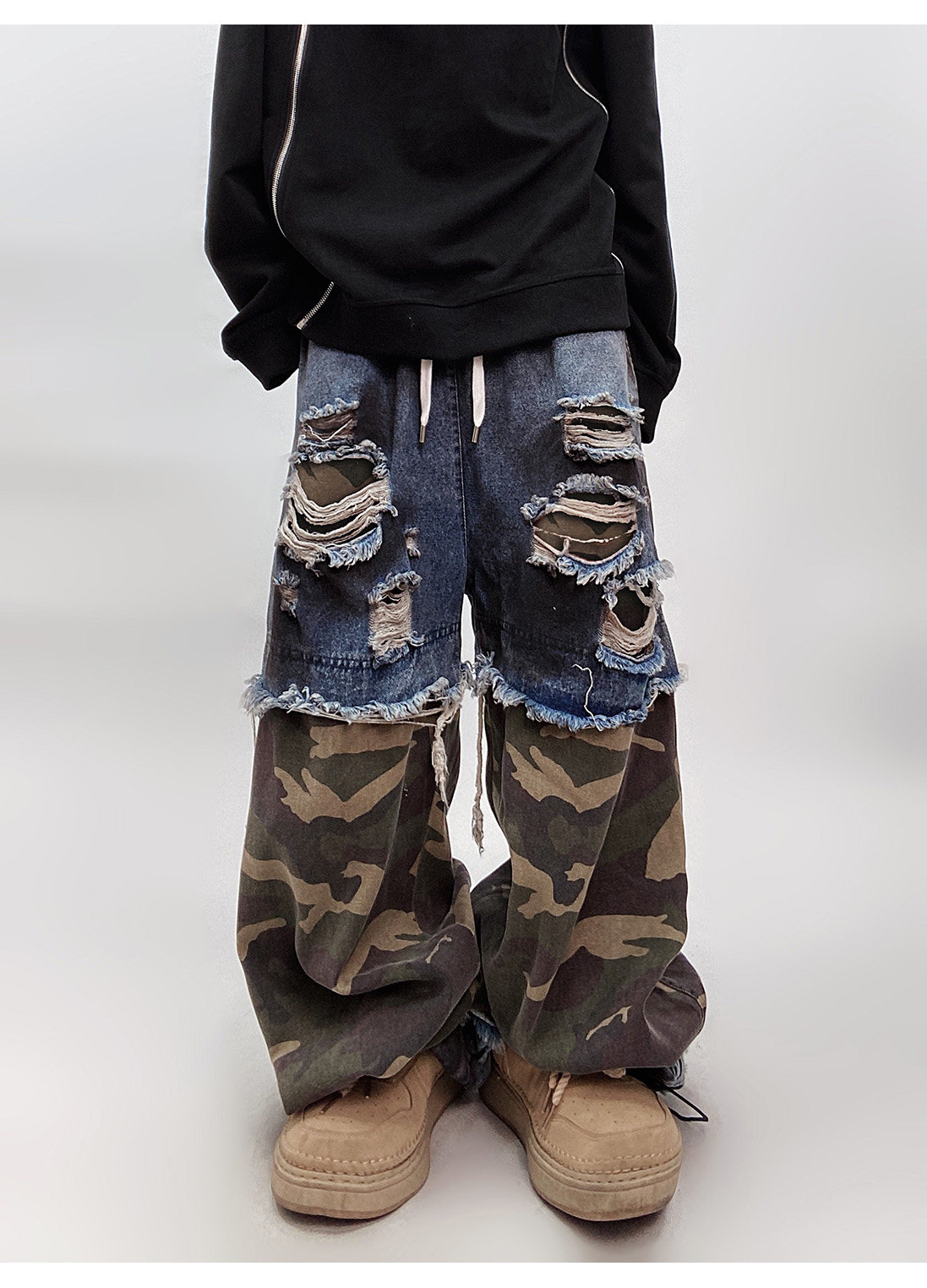 Camouflage Ripped Wide Leg Denim Jeans WN23993