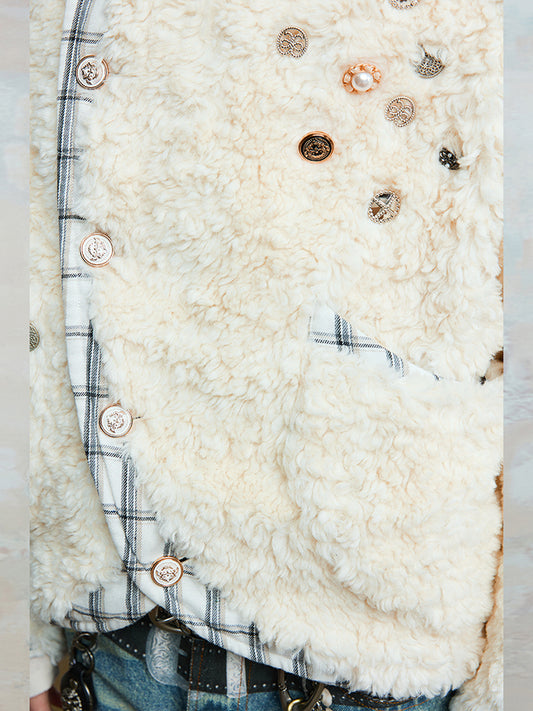 Tweed Plaid Lining Patchwork Fleece Decorated Button Jacket WN17839