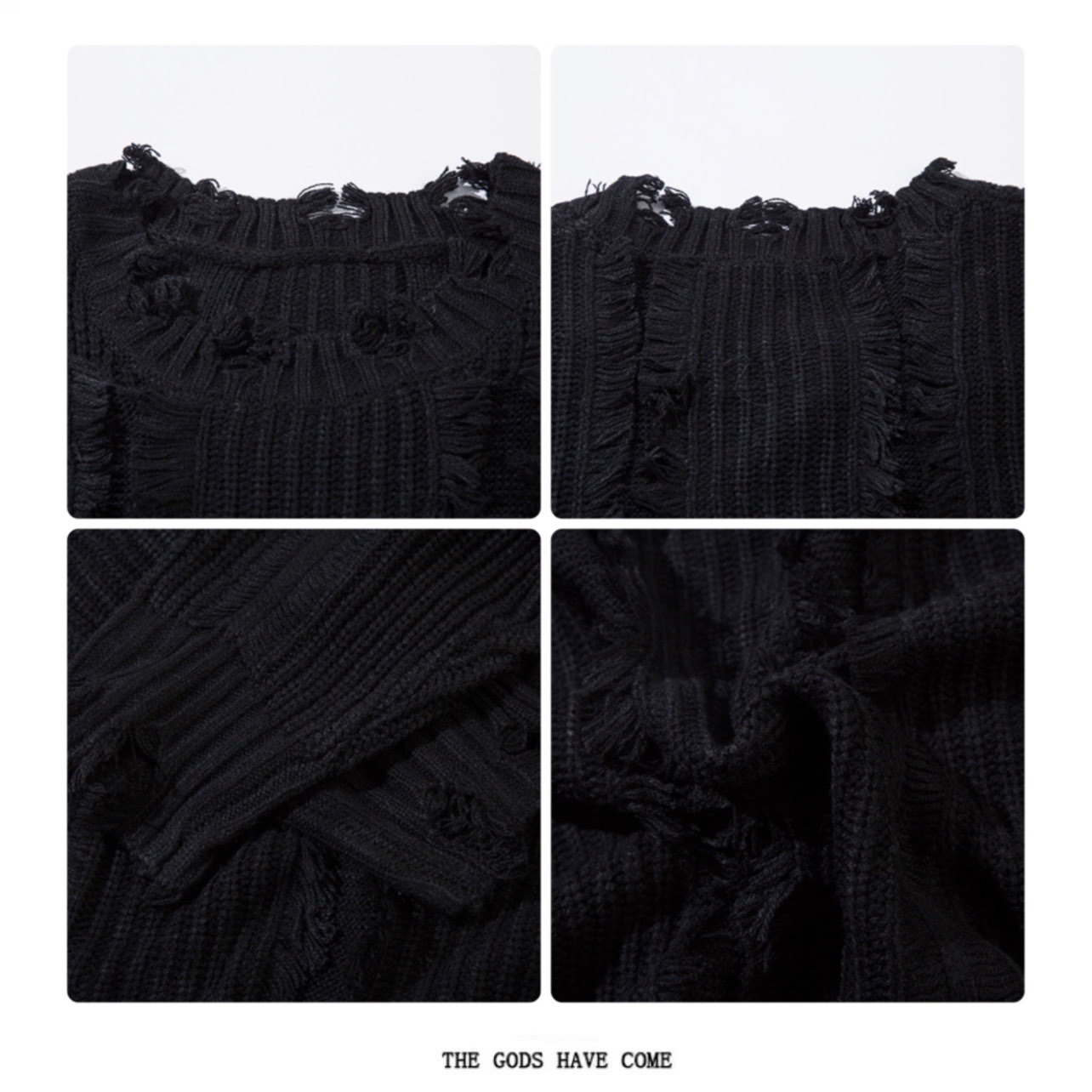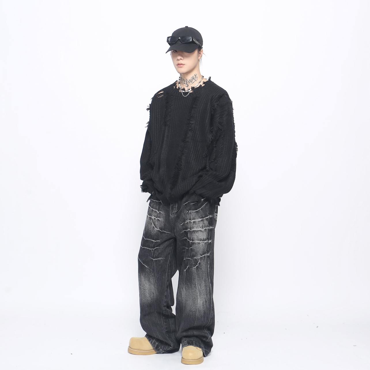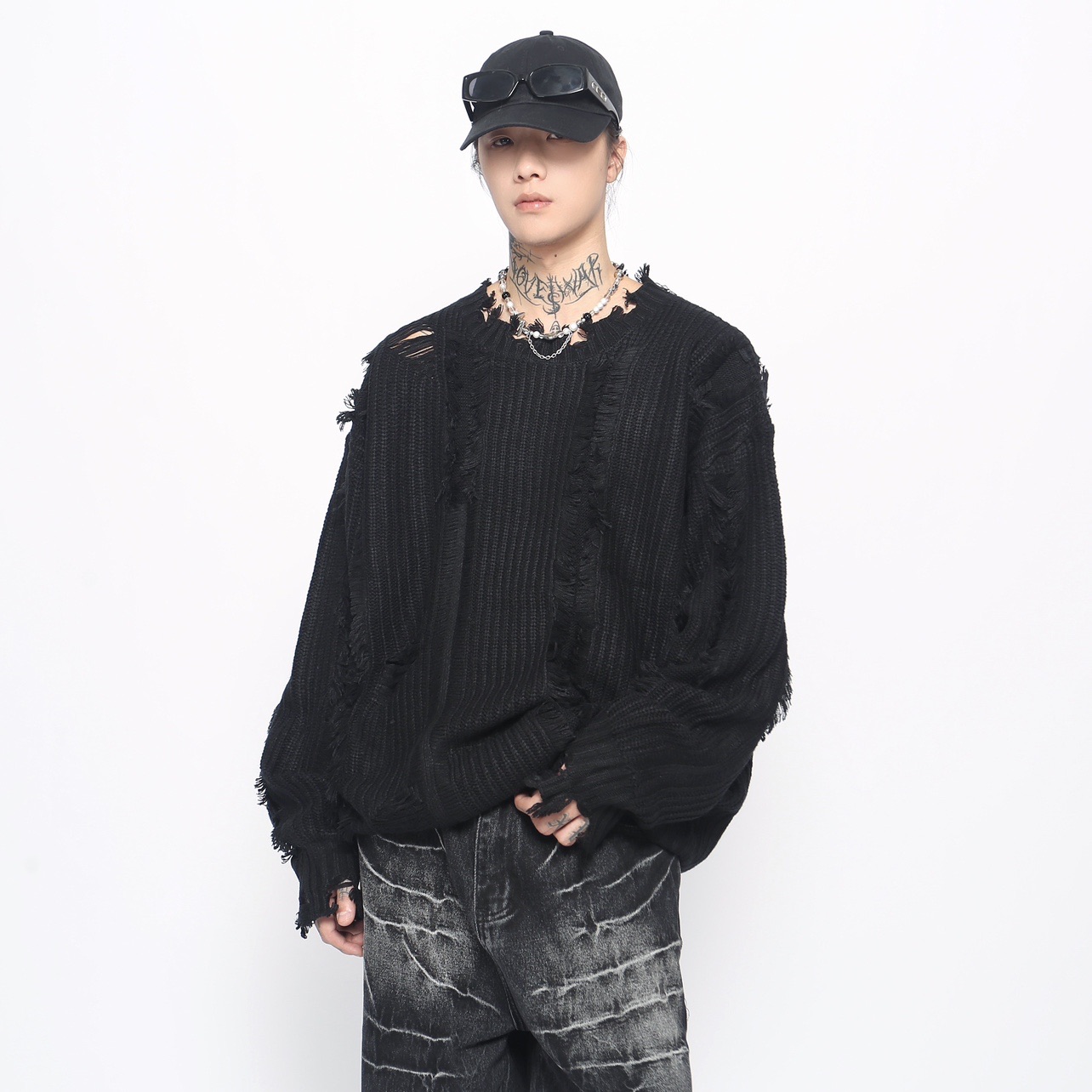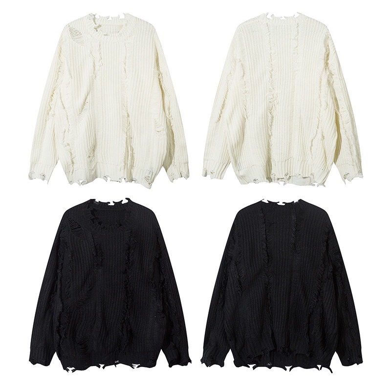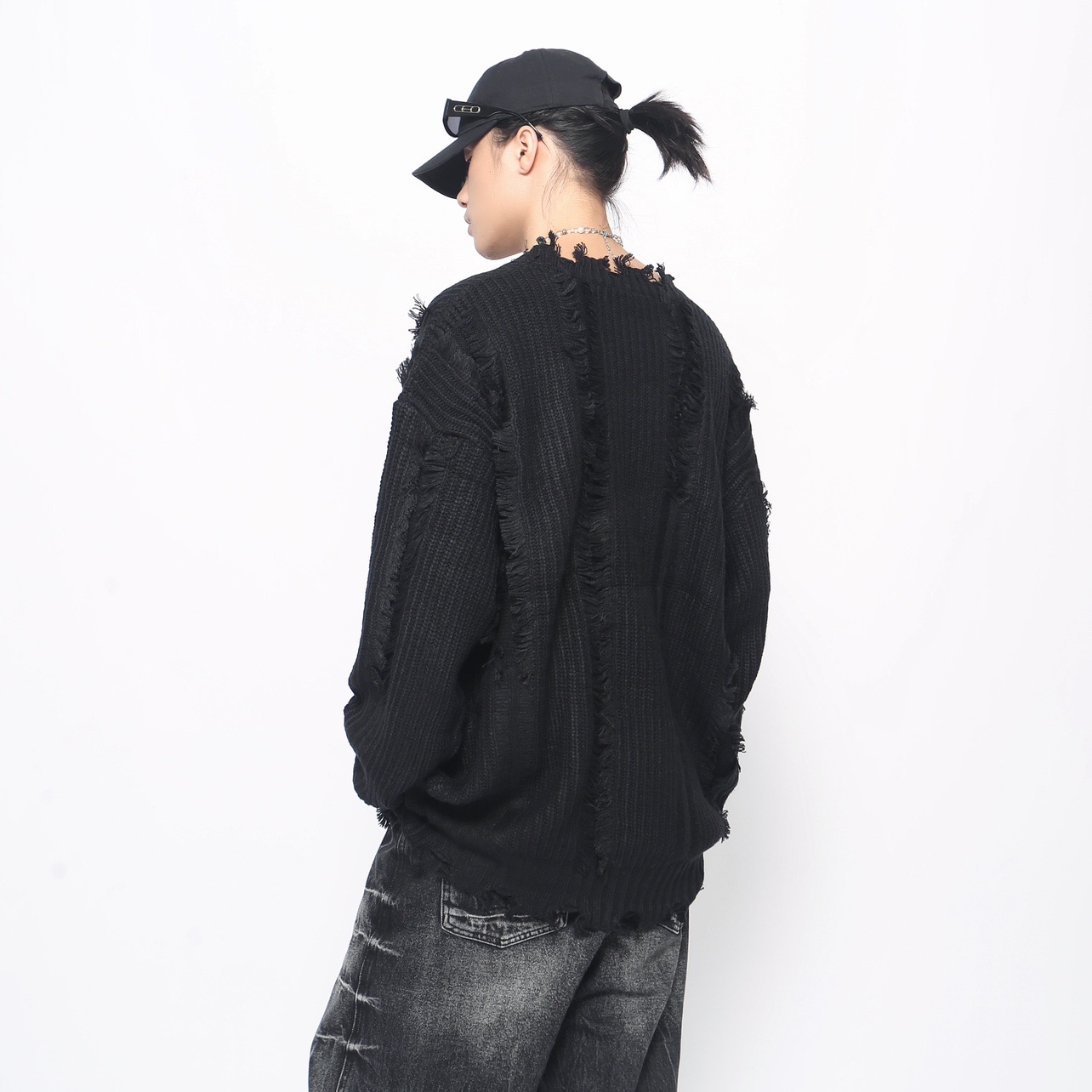 Damage Fringe Detail Asymmetric Oversize Knit Sweater WN10905