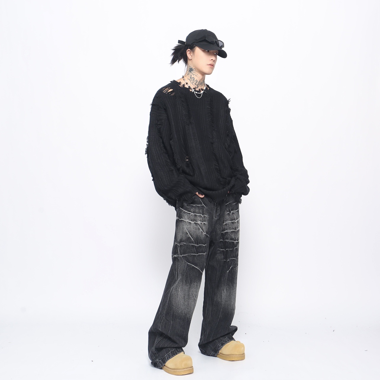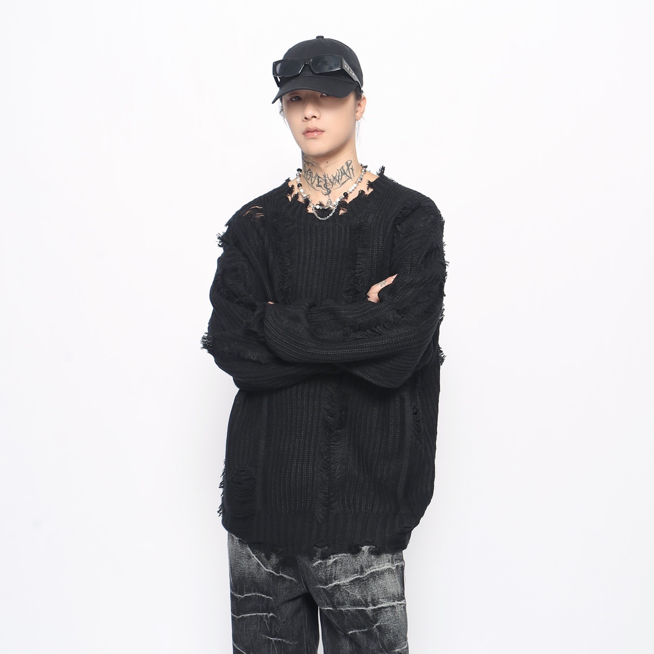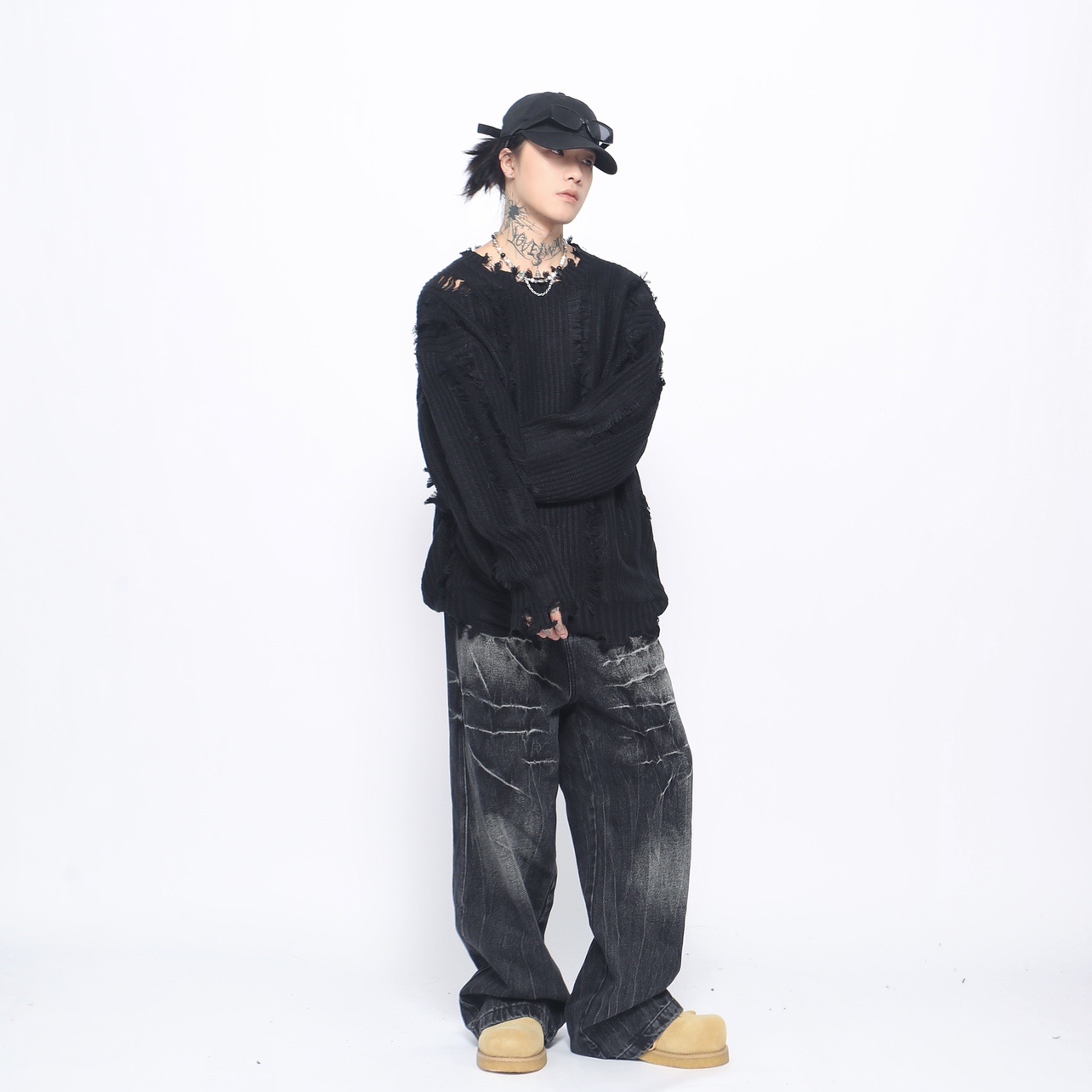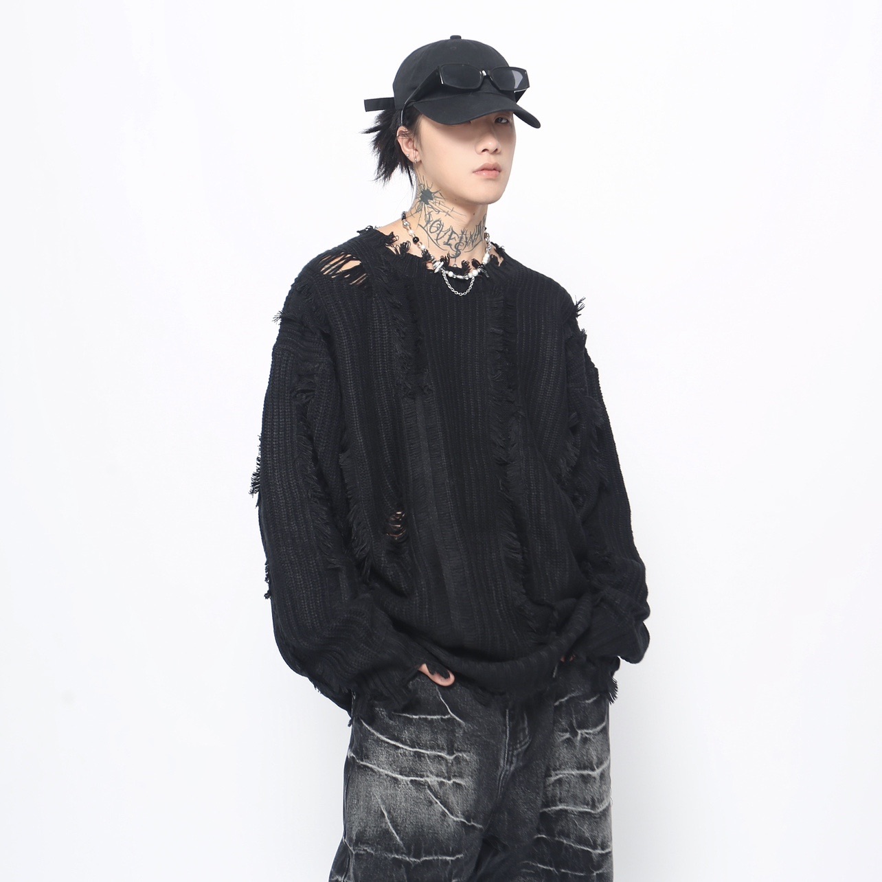 Damage Fringe Detail Asymmetric Oversize Knit Sweater WN10905