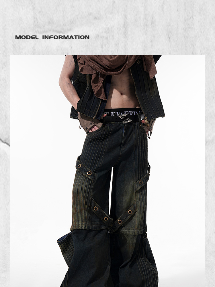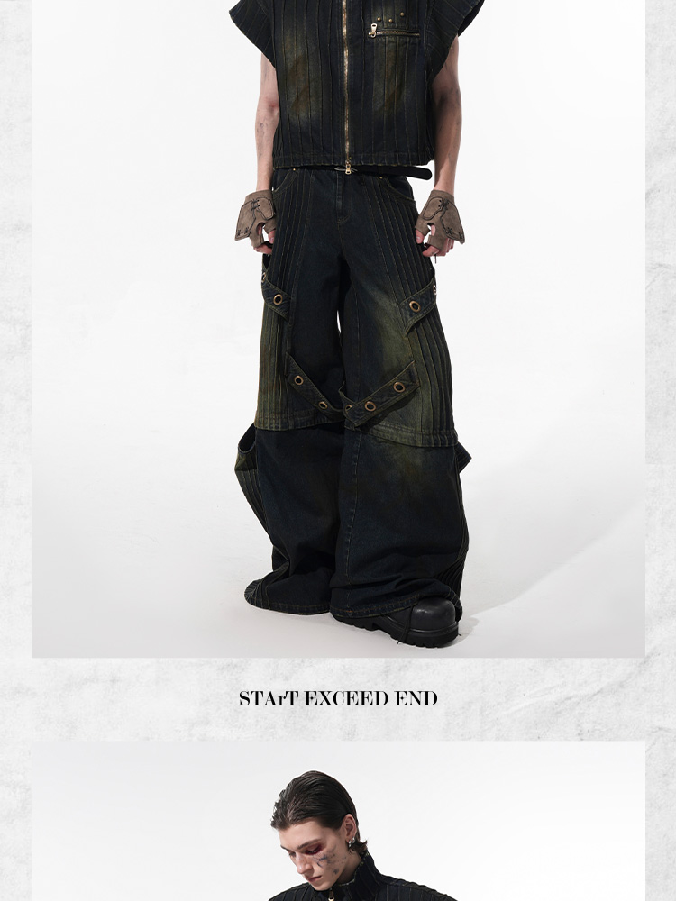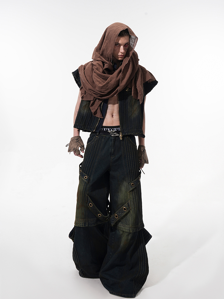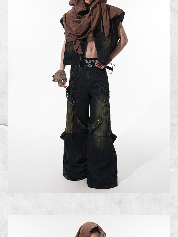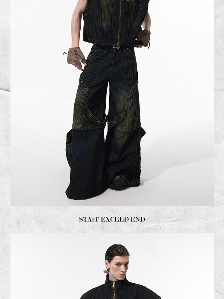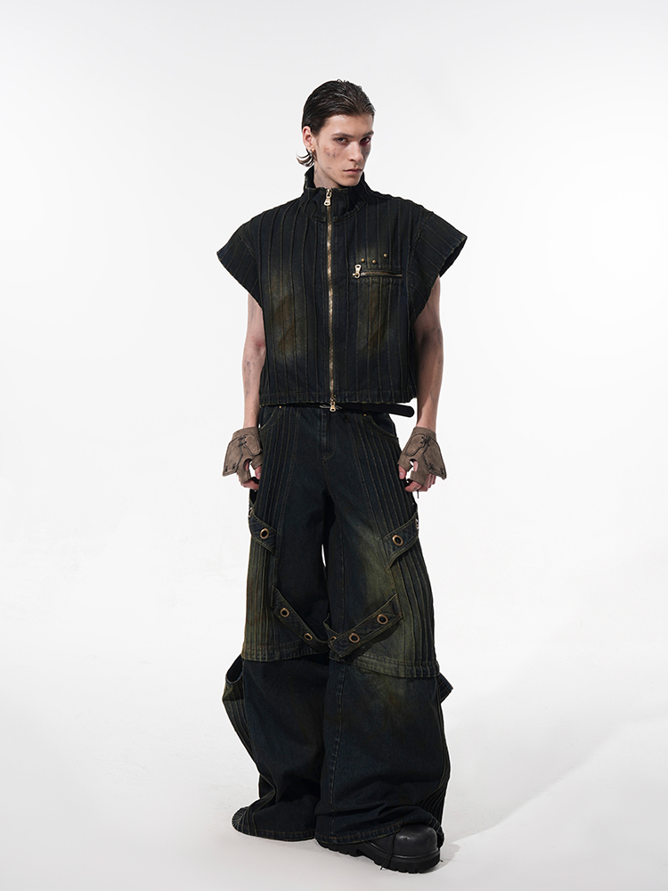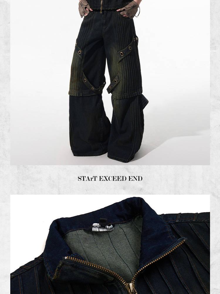 Standing-Neck Wash Damage Denim Short Jacket & Damage Wide-leg Denim Jeans Setup WN14874