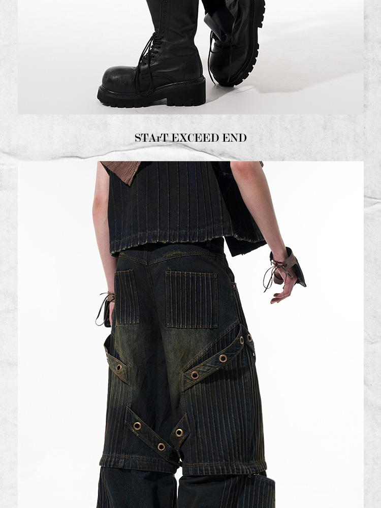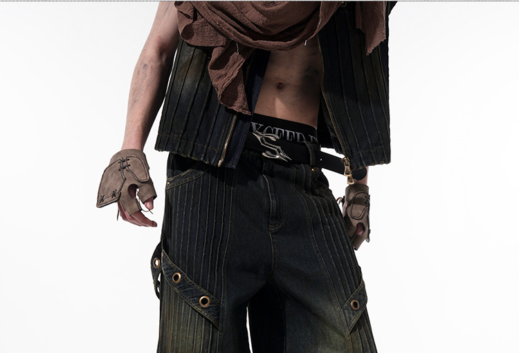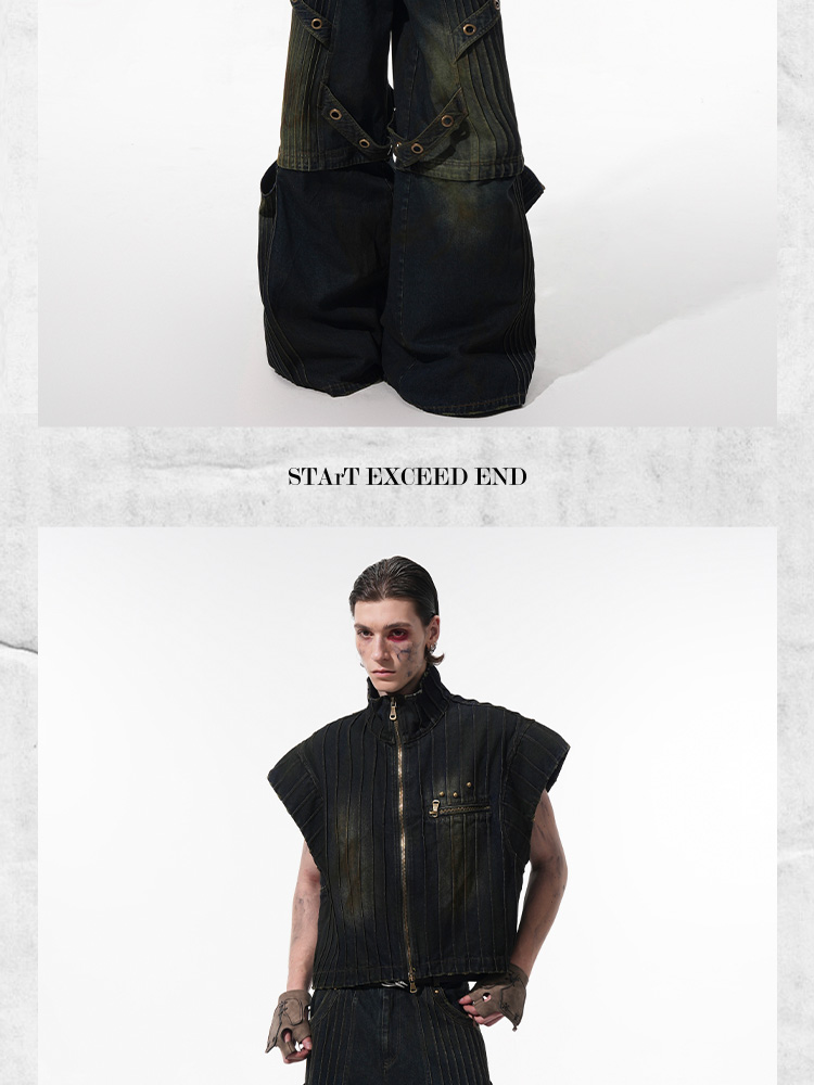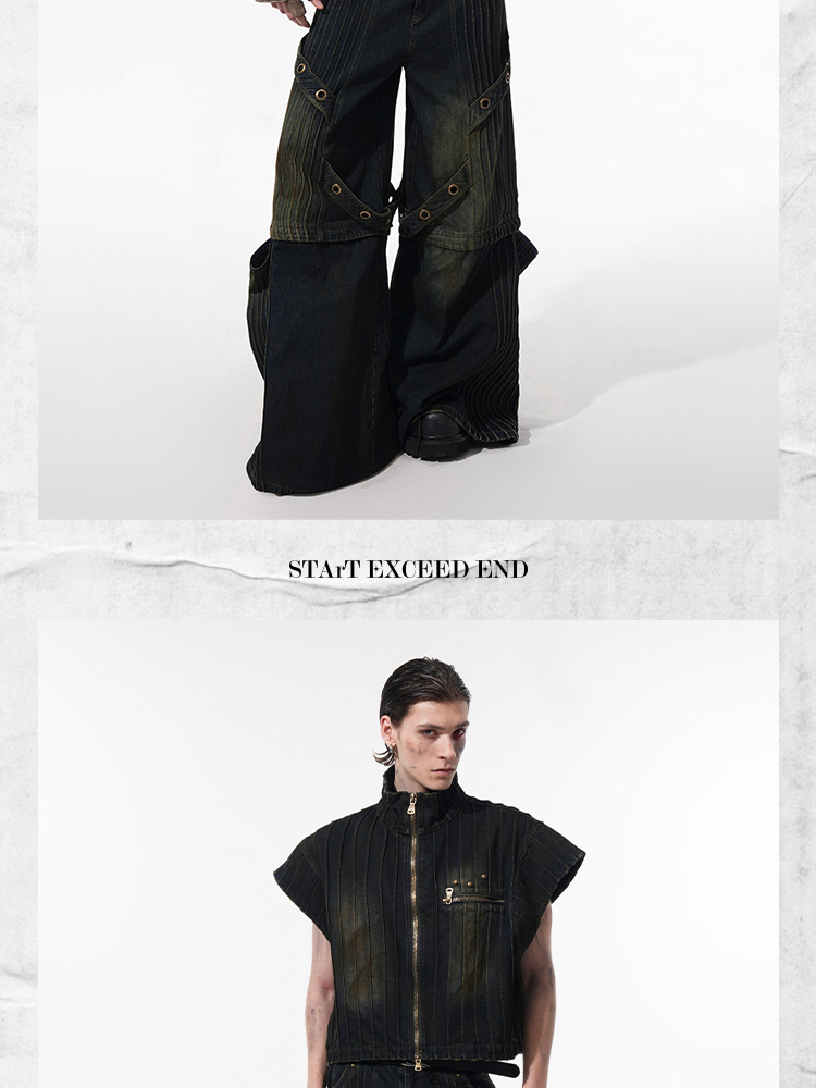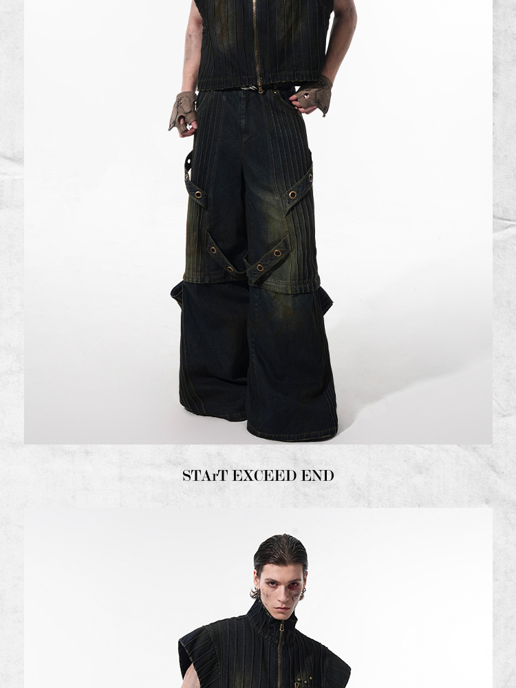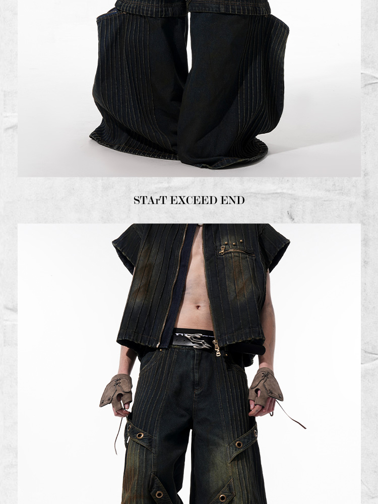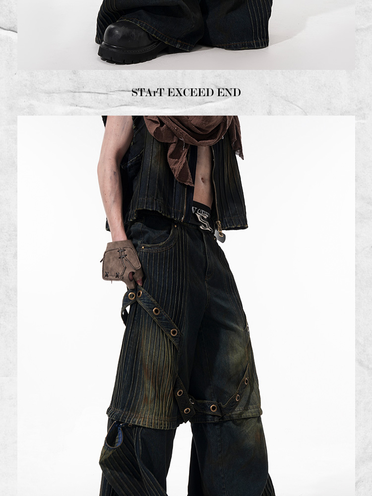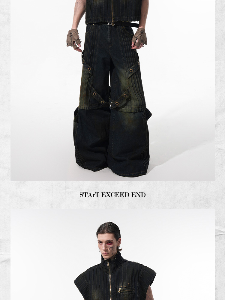Standing-Neck Wash Damage Denim Short Jacket & Damage Wide-leg Denim Jeans Setup WN14874