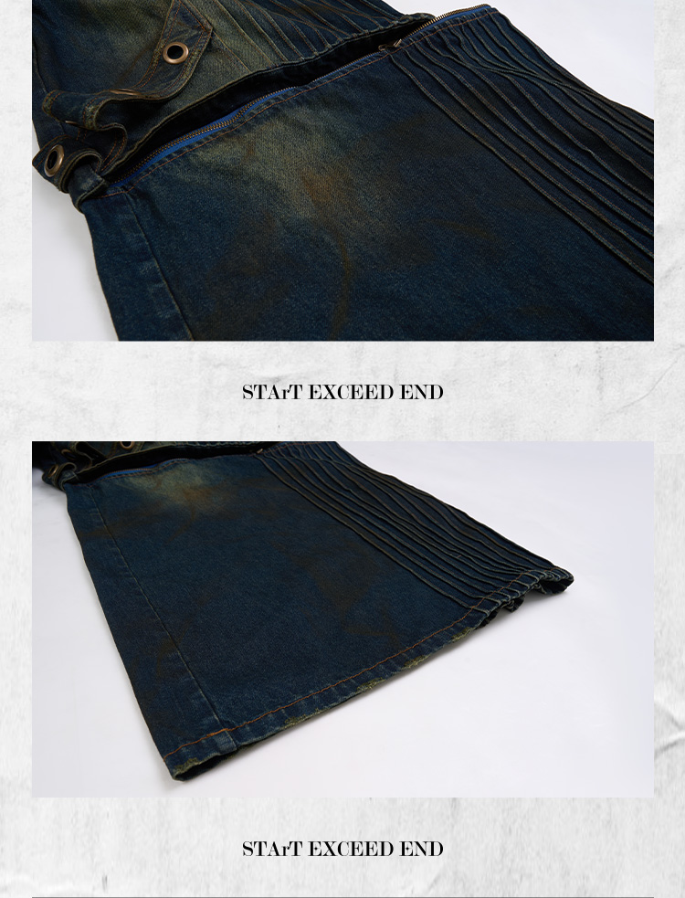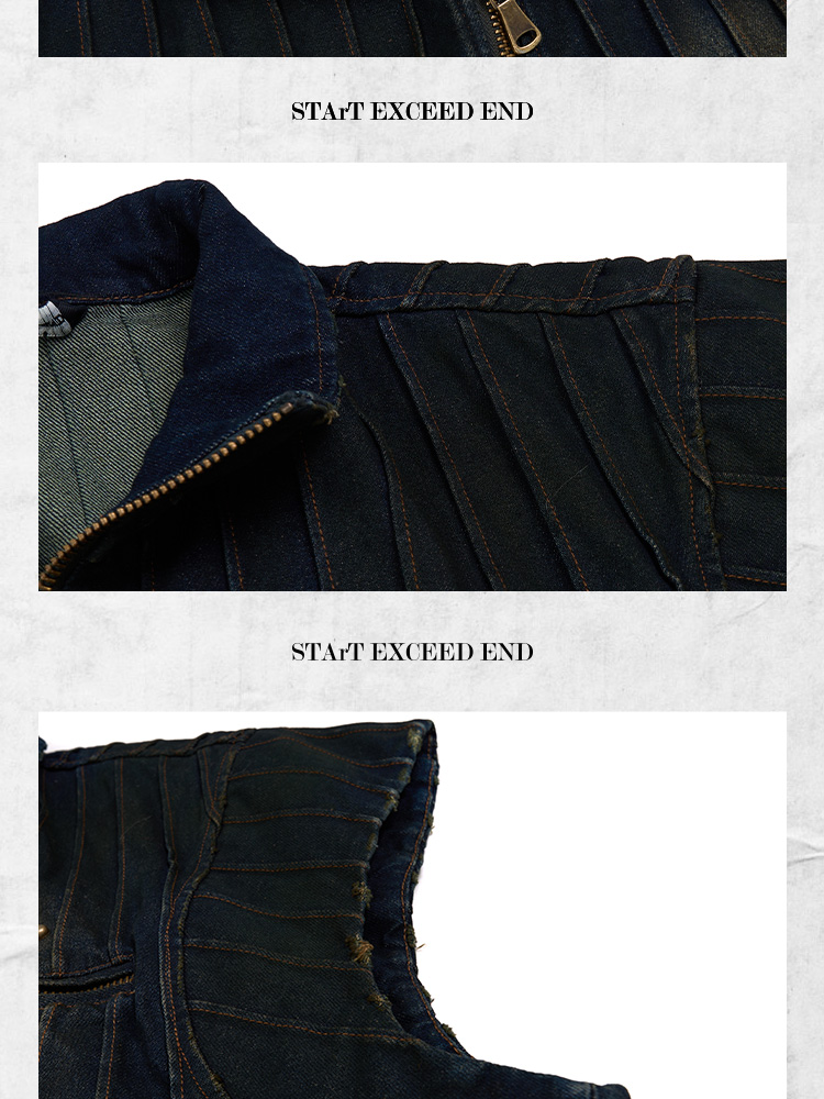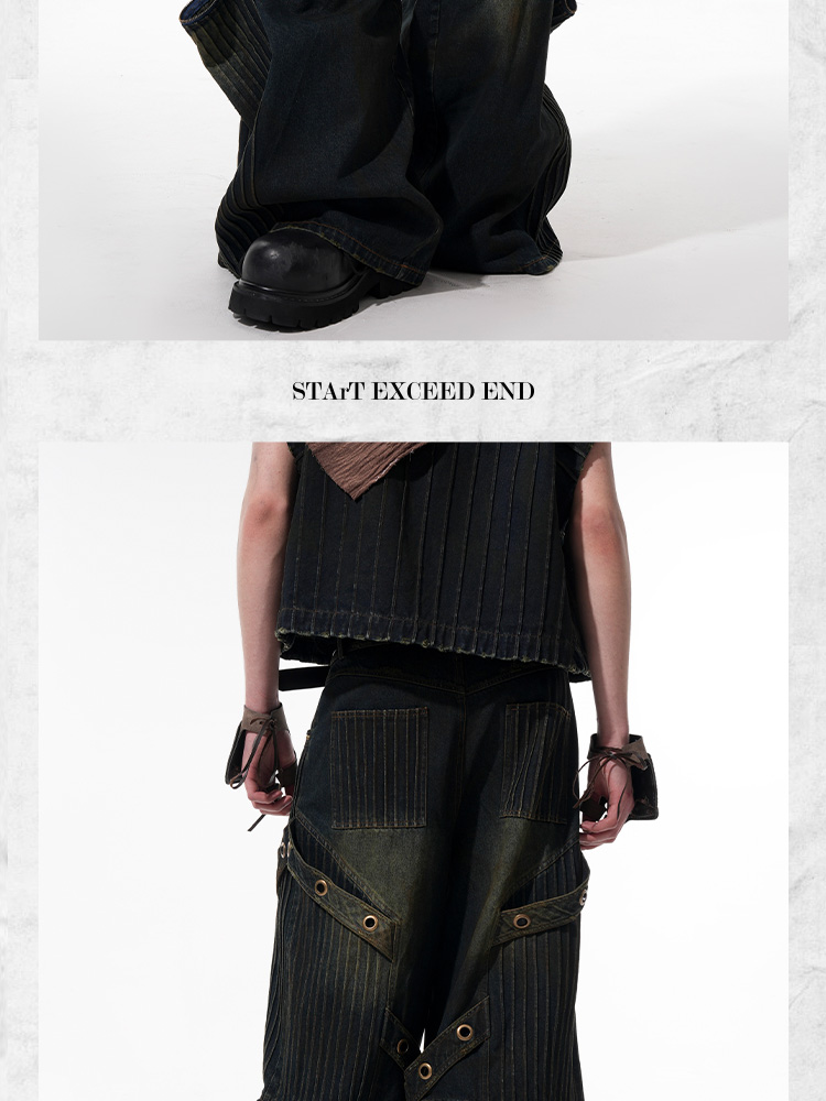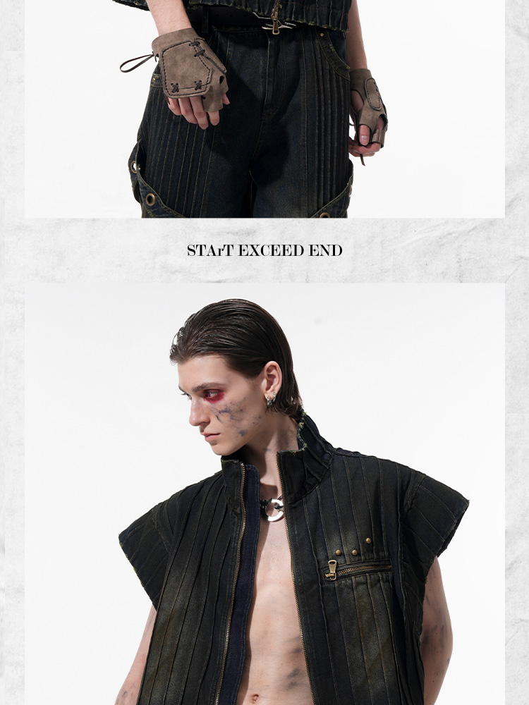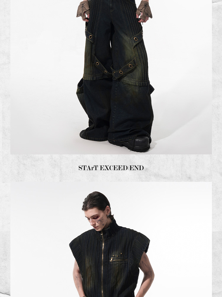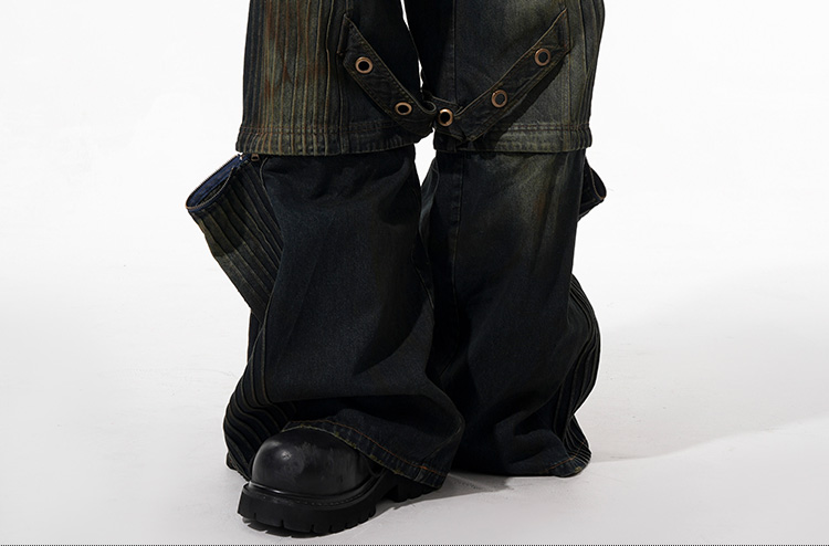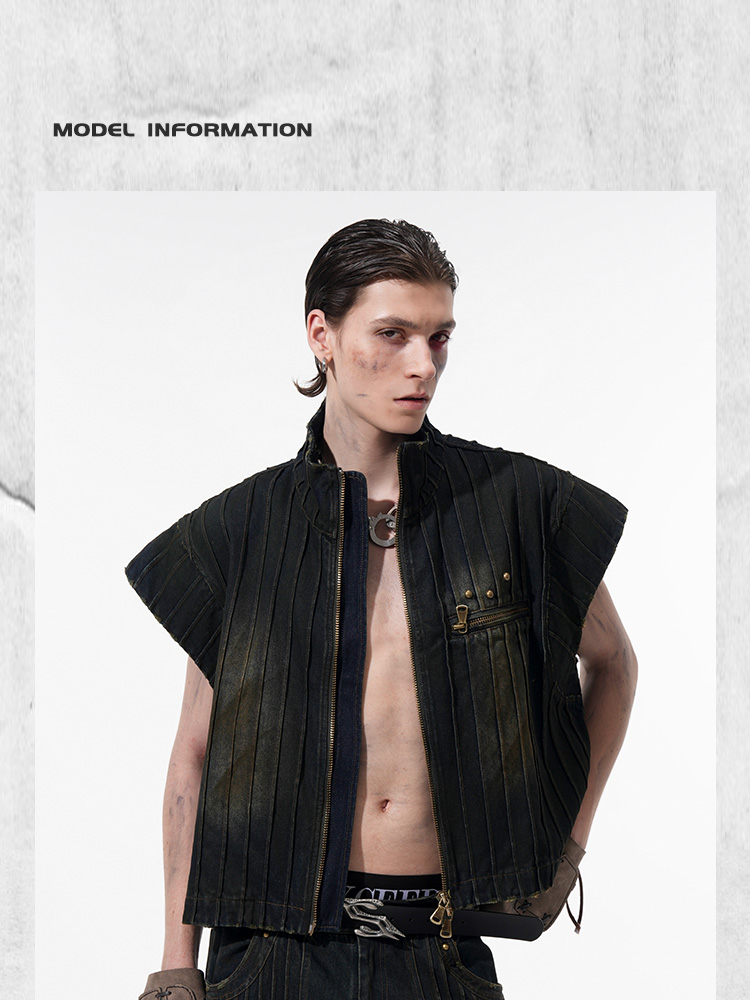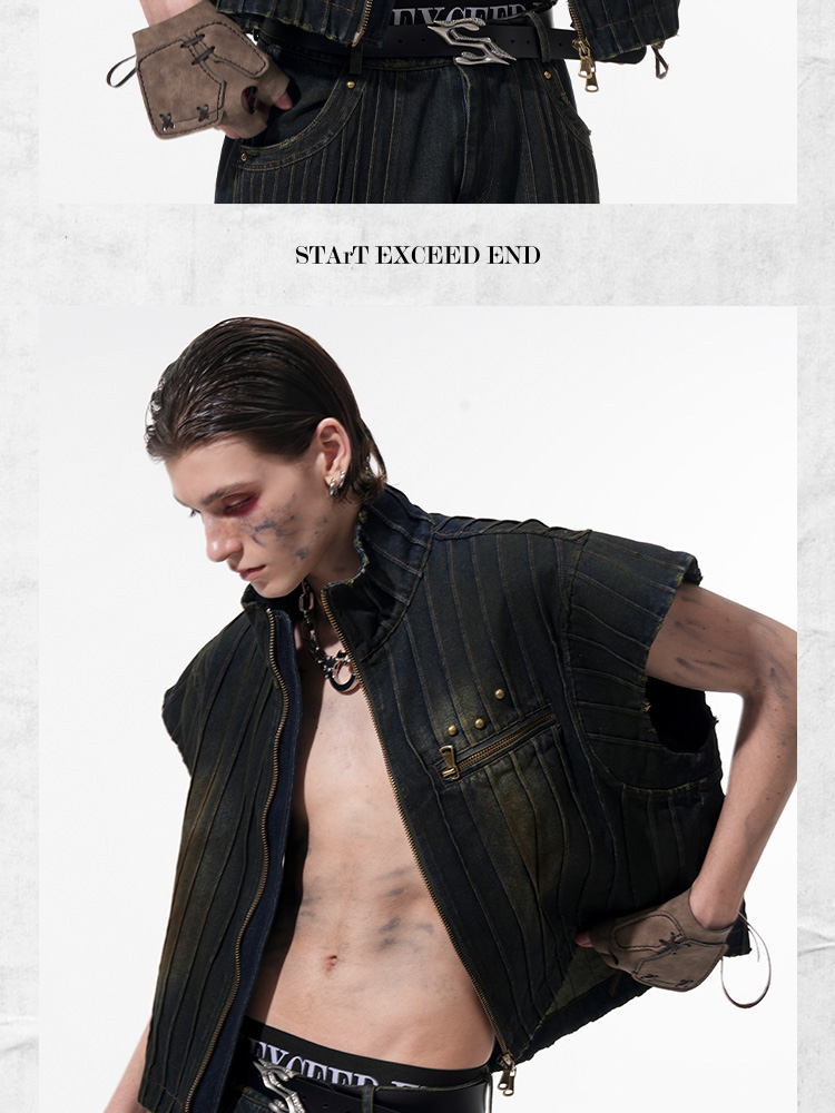 Standing-Neck Wash Damage Denim Short Jacket & Damage Wide-leg Denim Jeans Setup WN14874