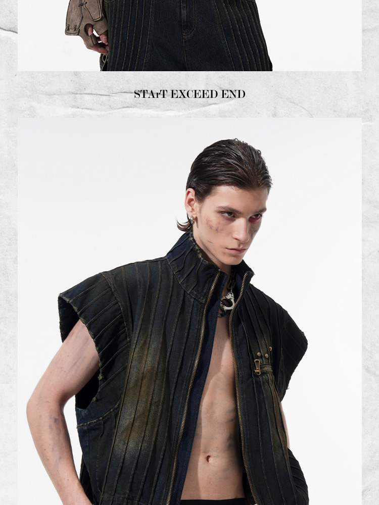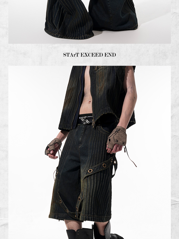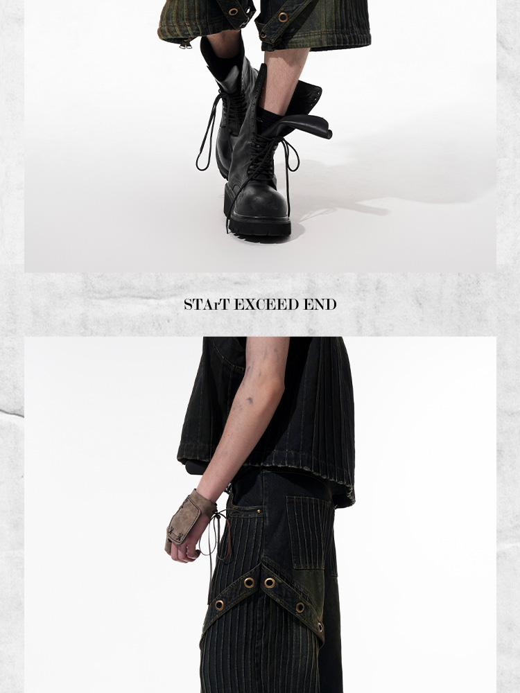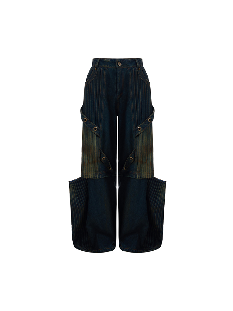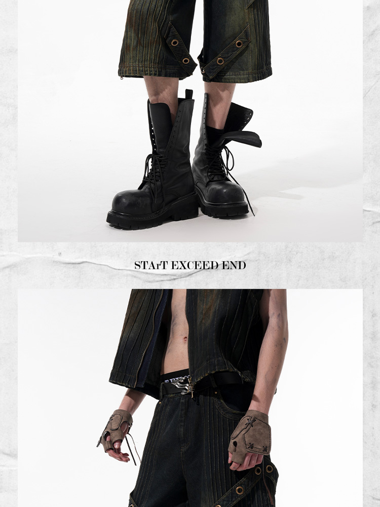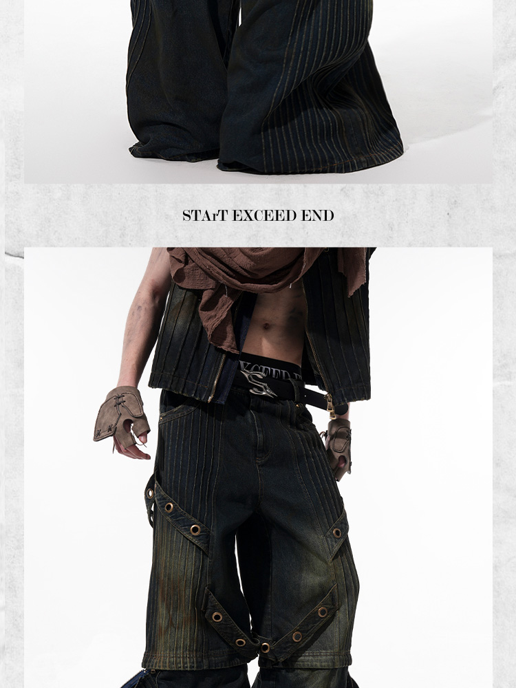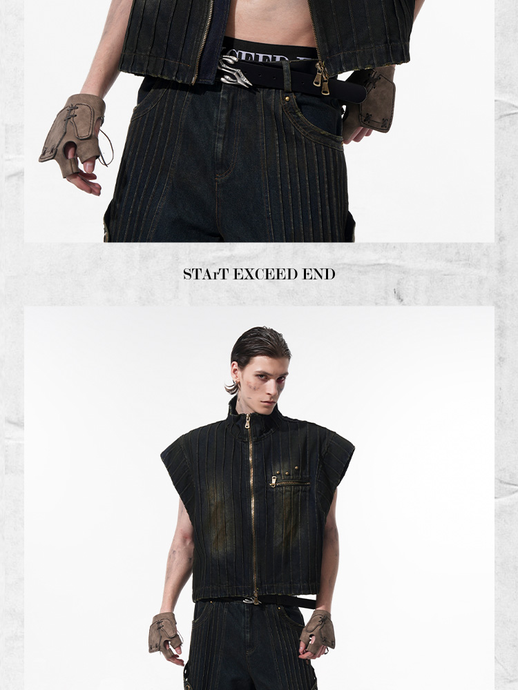 Standing-Neck Wash Damage Denim Short Jacket & Damage Wide-leg Denim Jeans Setup WN14874