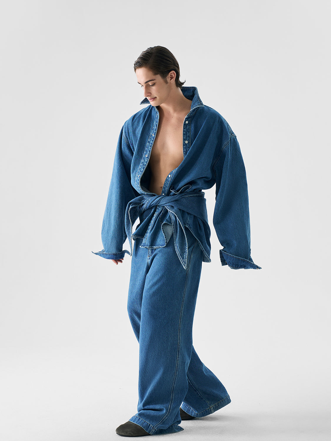 High-Quality Denim Jacket & Wide-Leg Denim Jeans & Scarf Setup WN15176