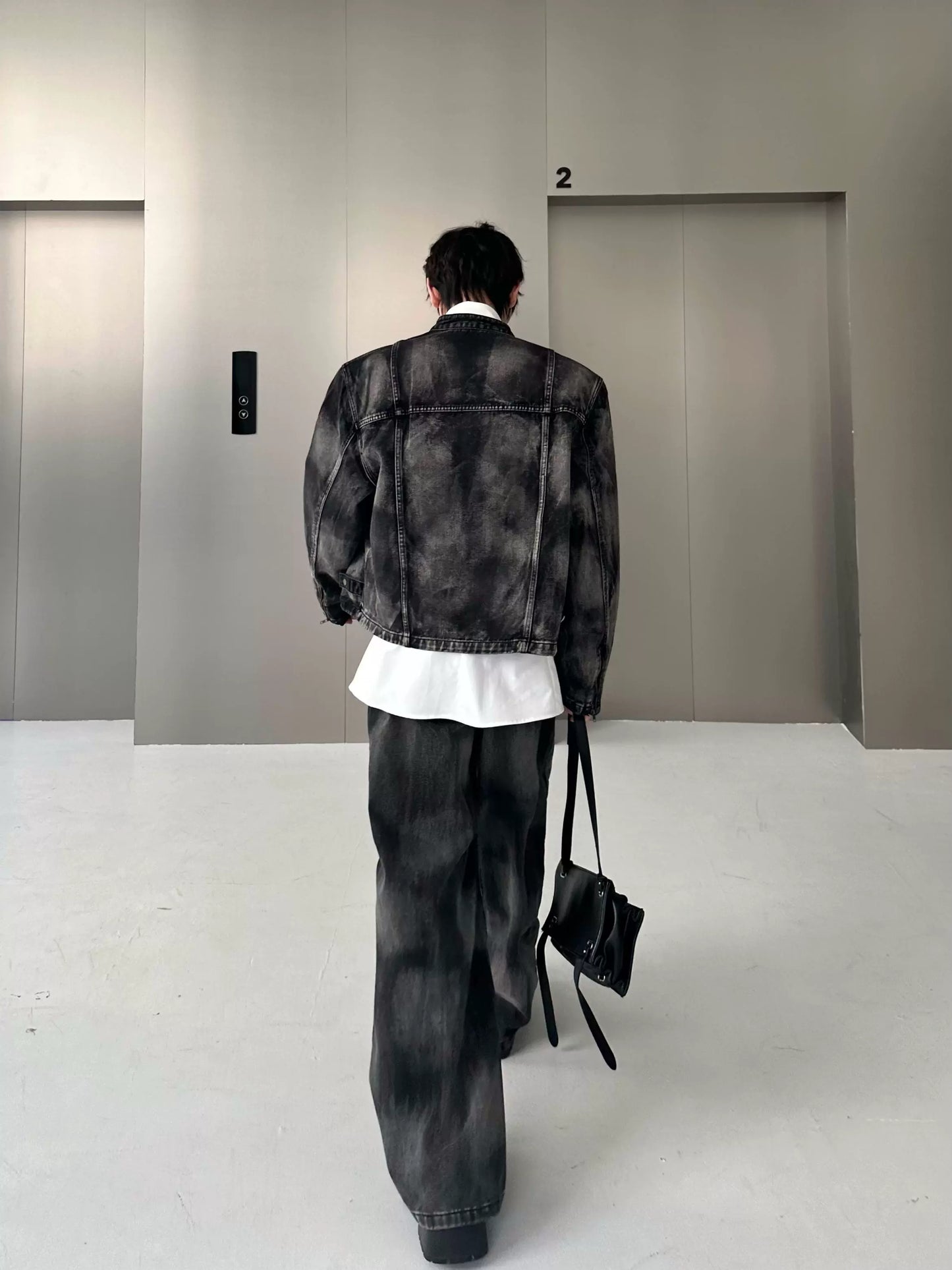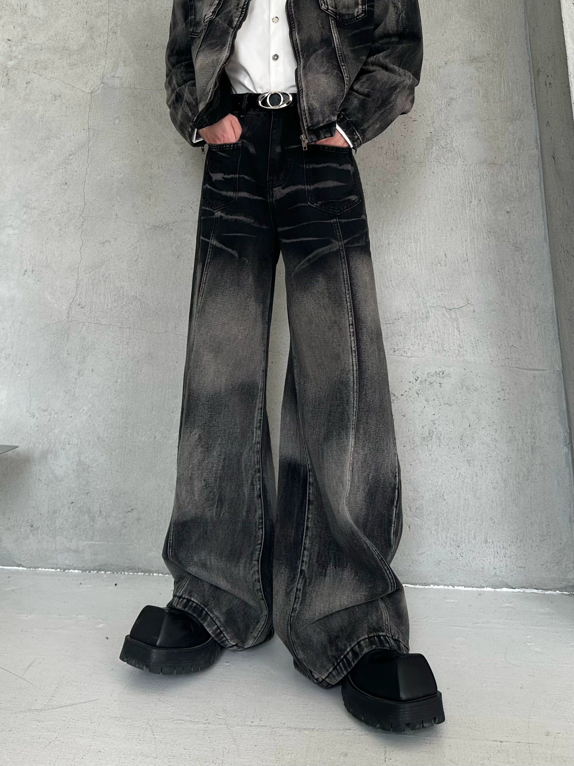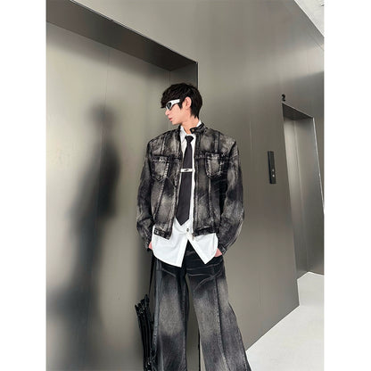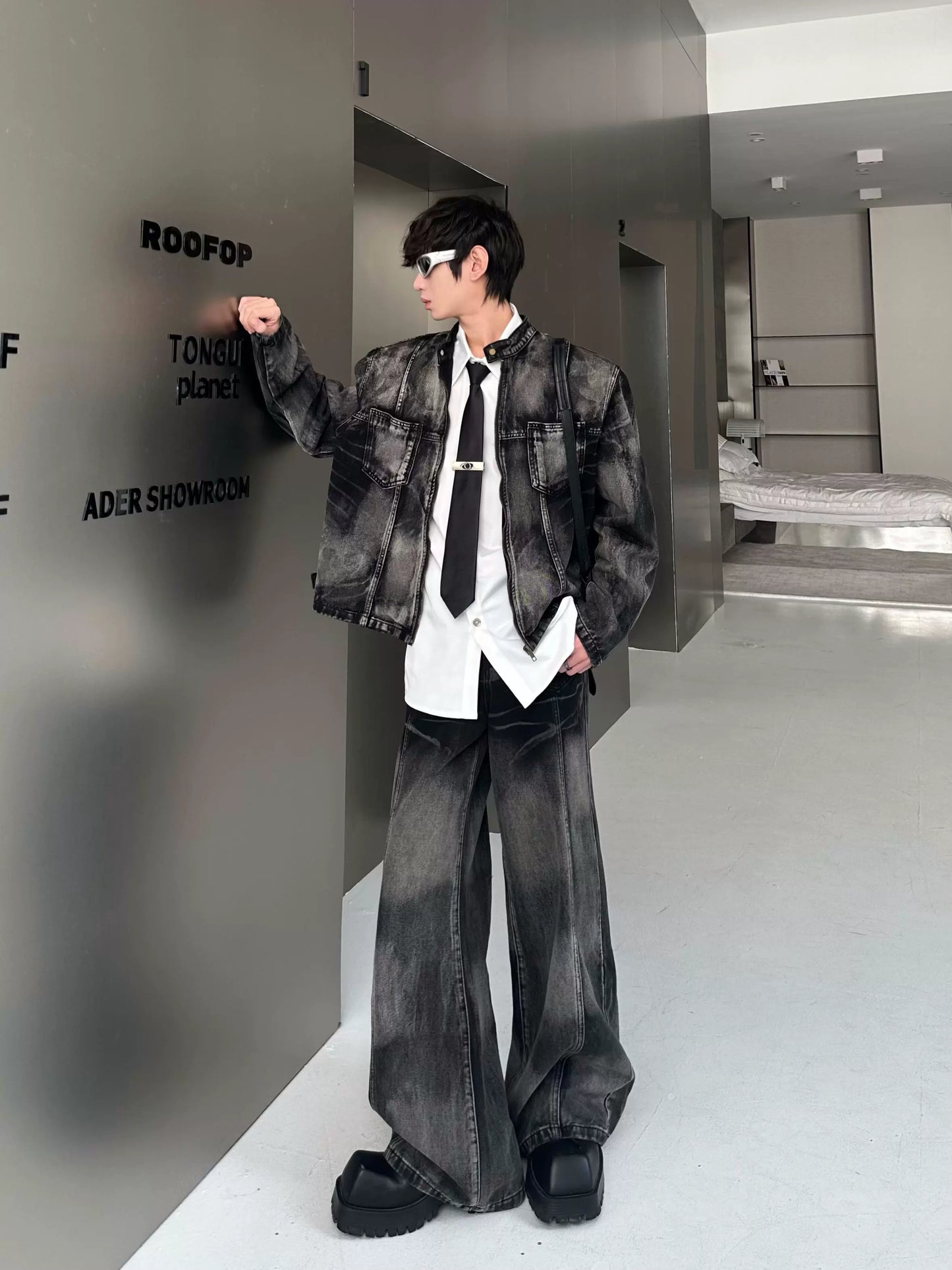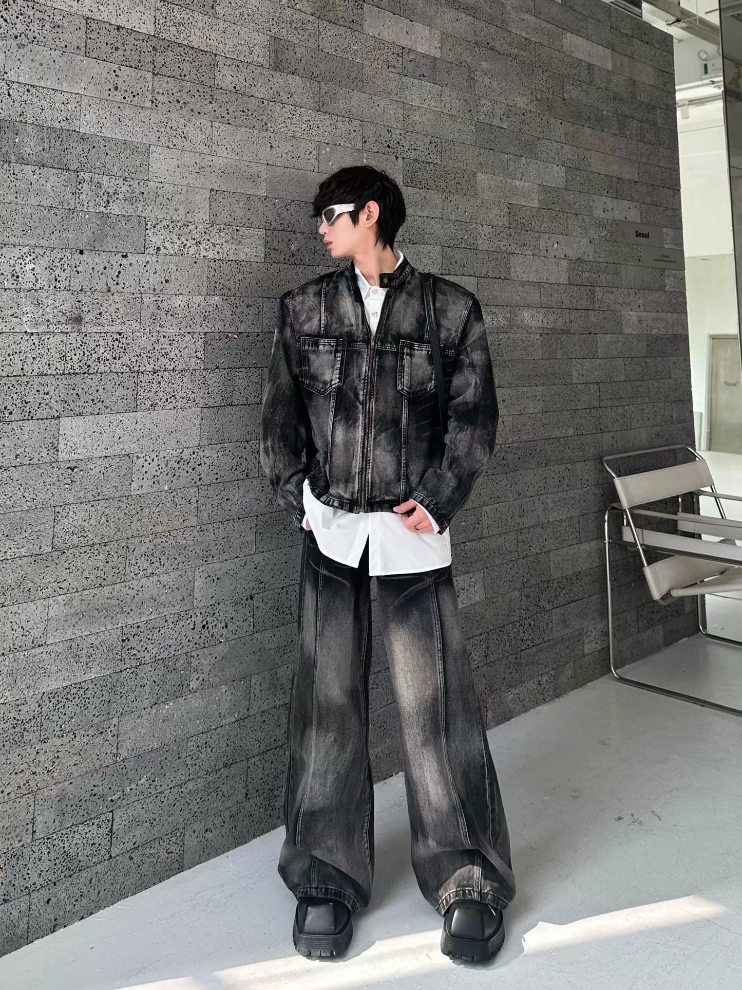 Shoulder-Pad Washed Jacket & Wide-Leg Straight Denim Jeans Setup WN16761