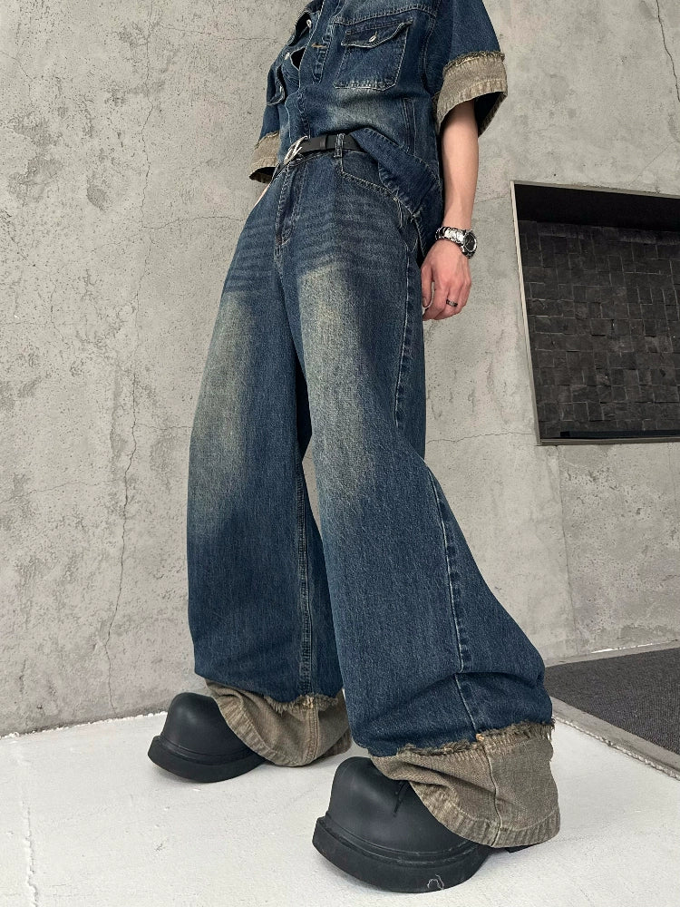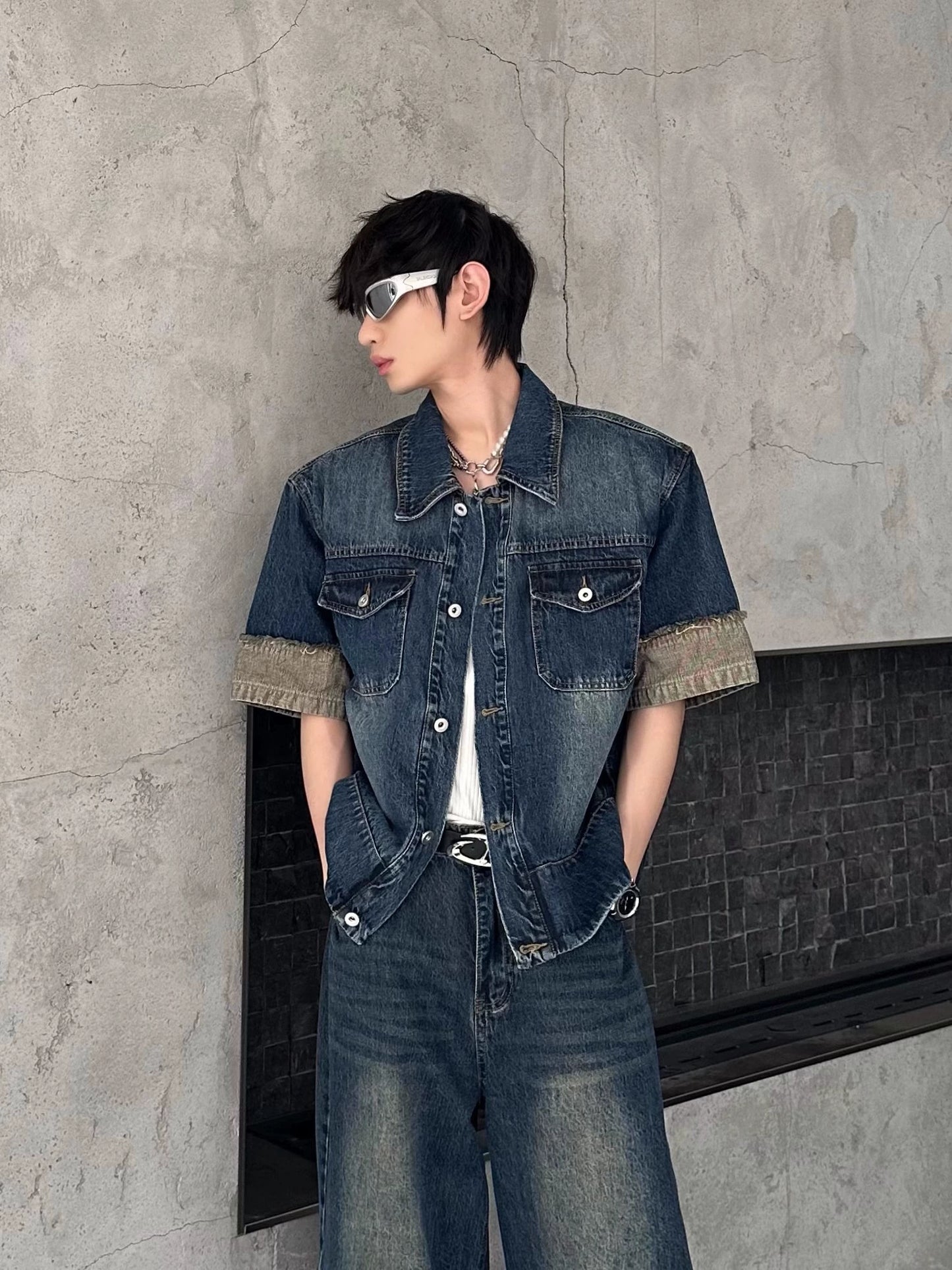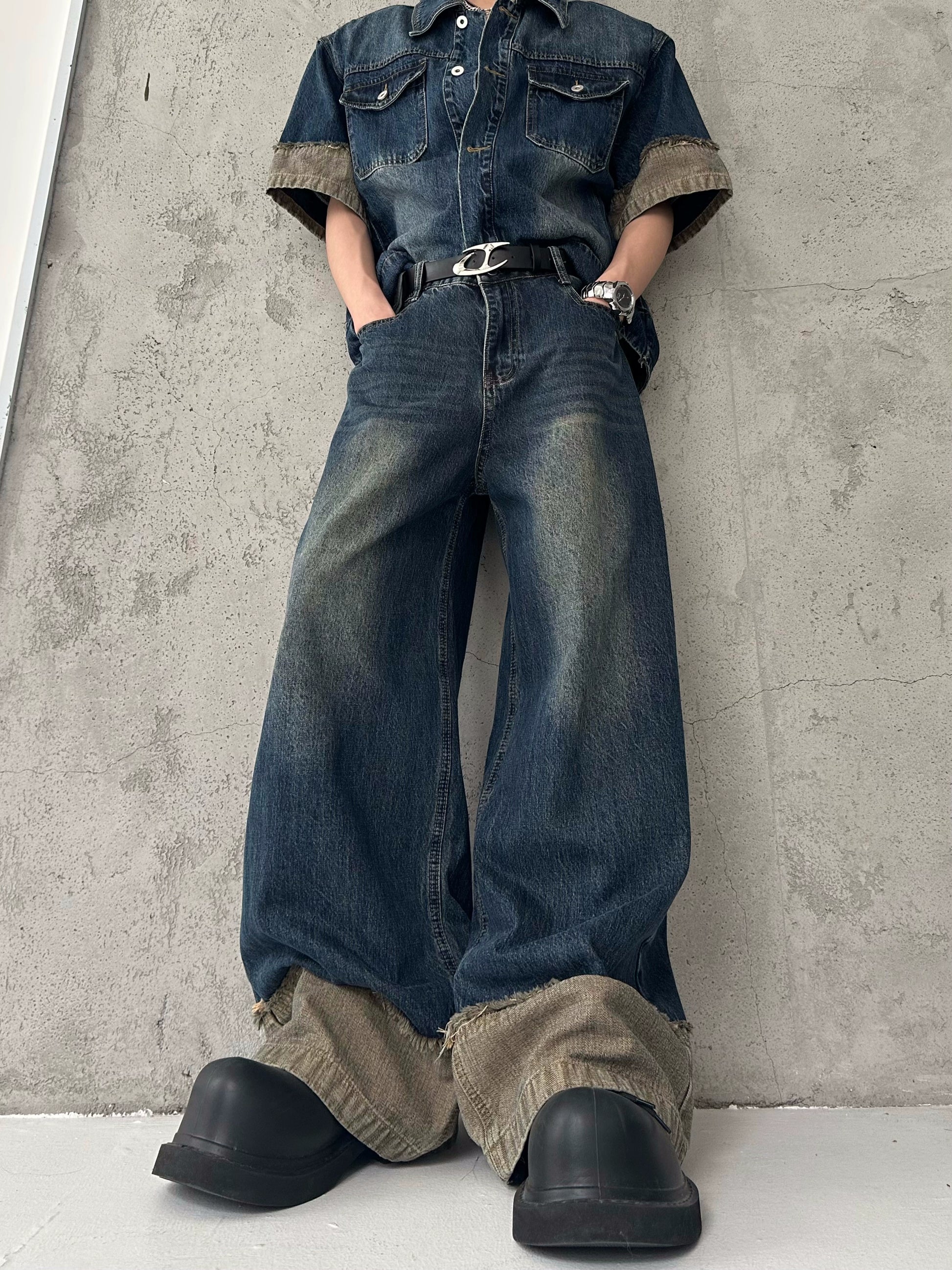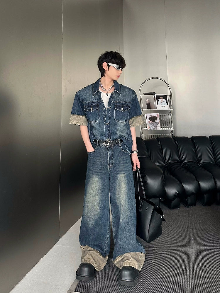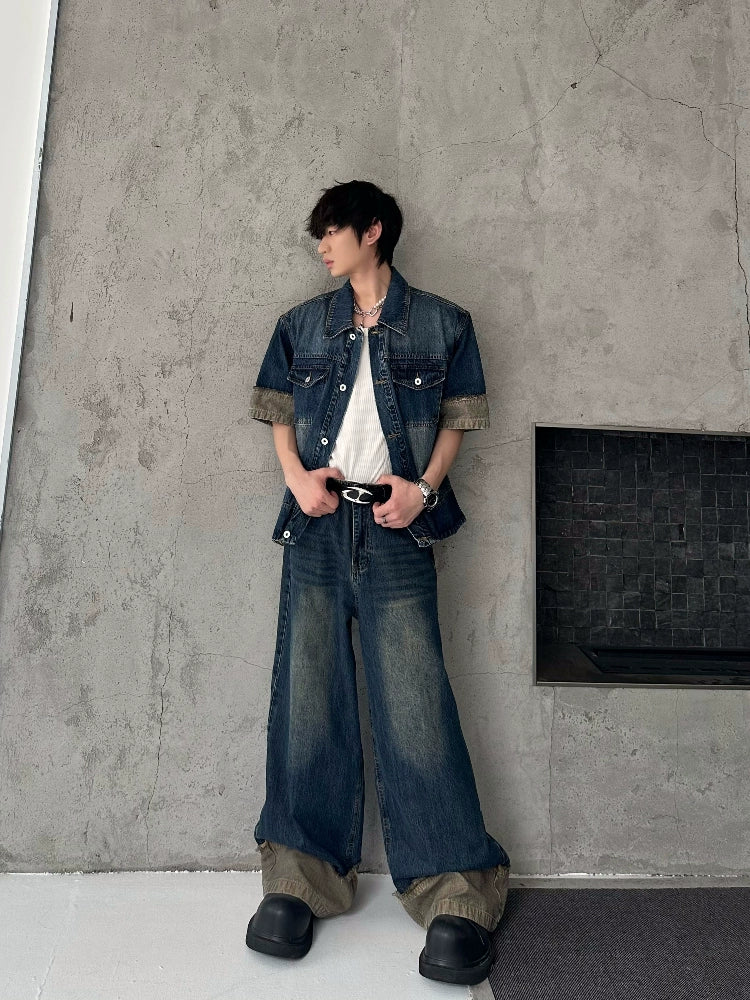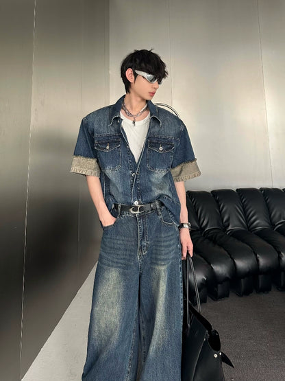 Washed Short Sleeve Denim Jacket & Wide Leg Denim Jeans Setup WN16782