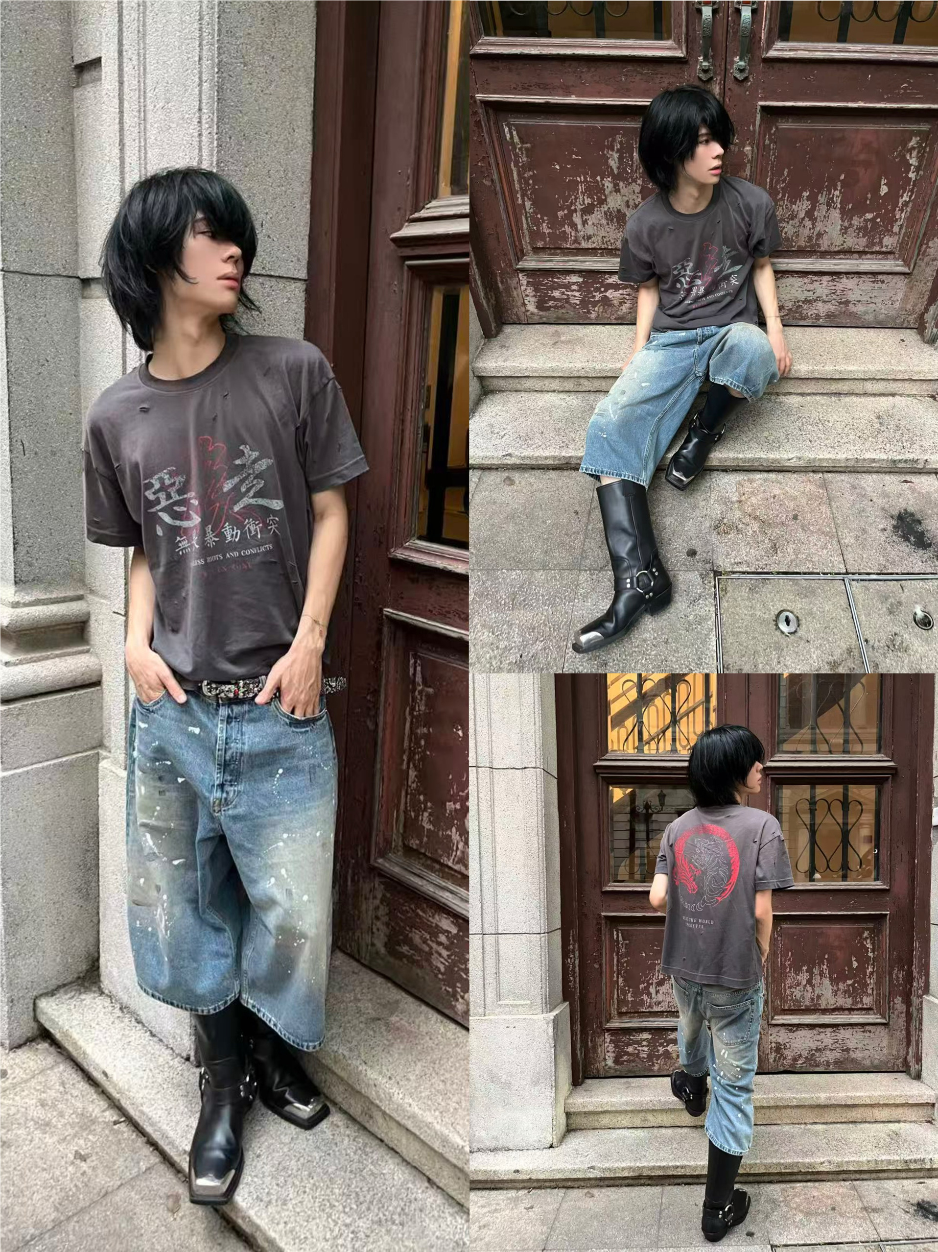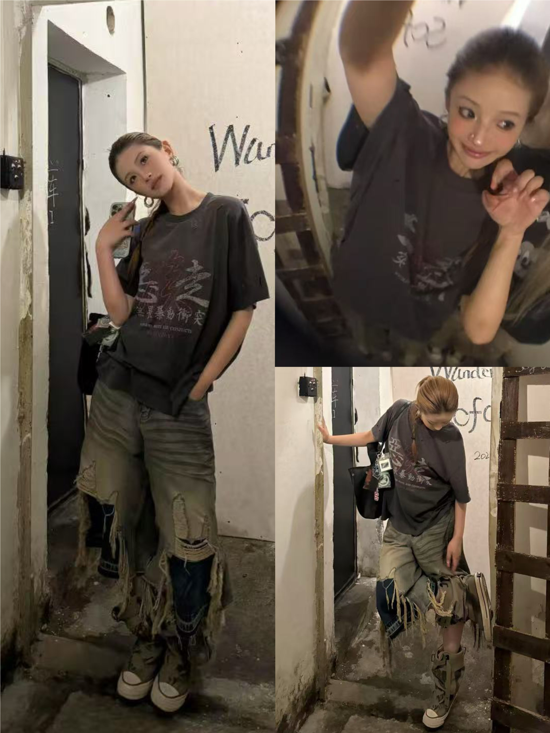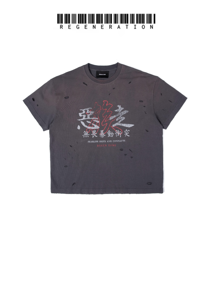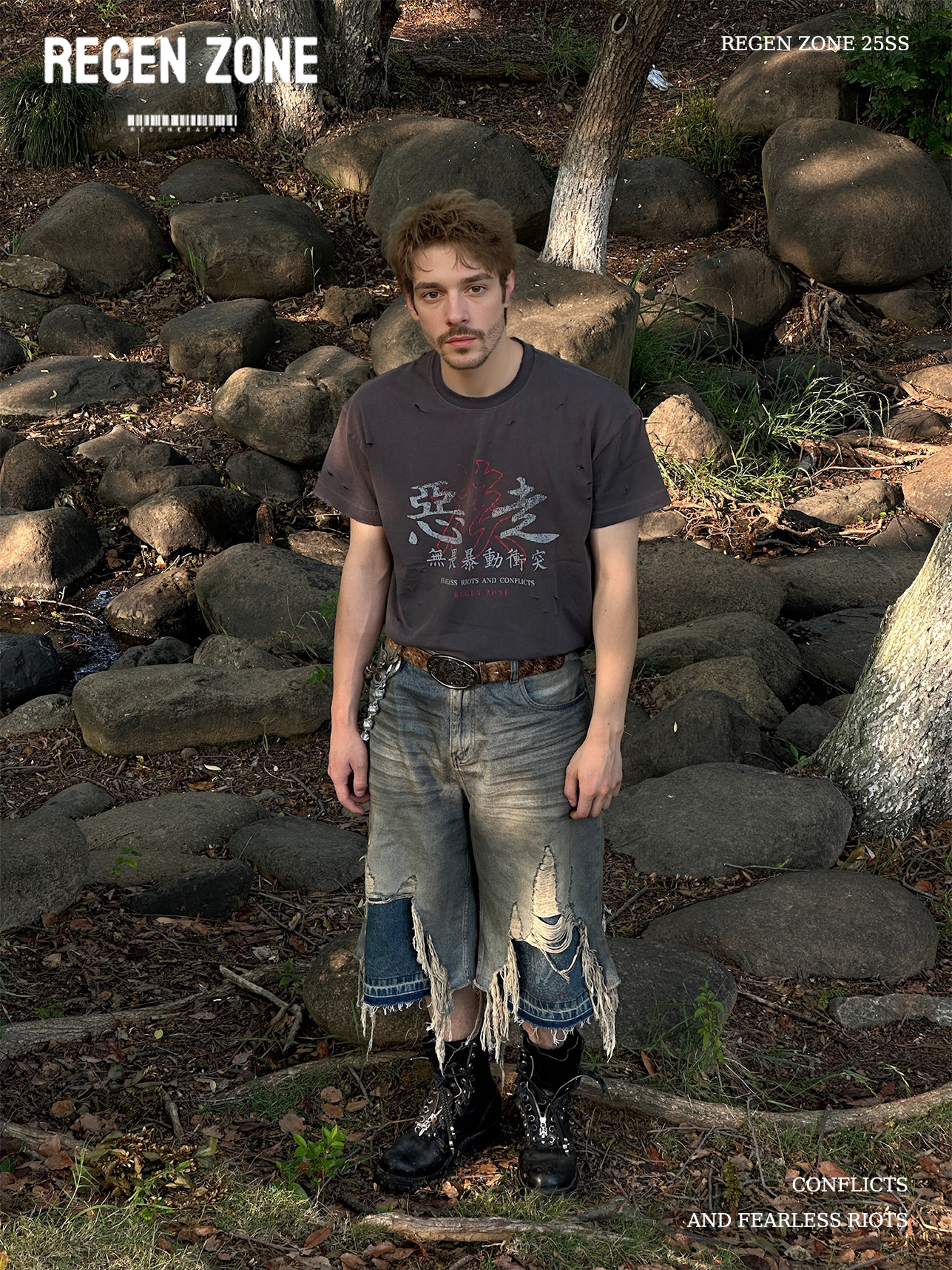 Washed Graphic Letter Damage Short Sleeve T-shirt WN19712