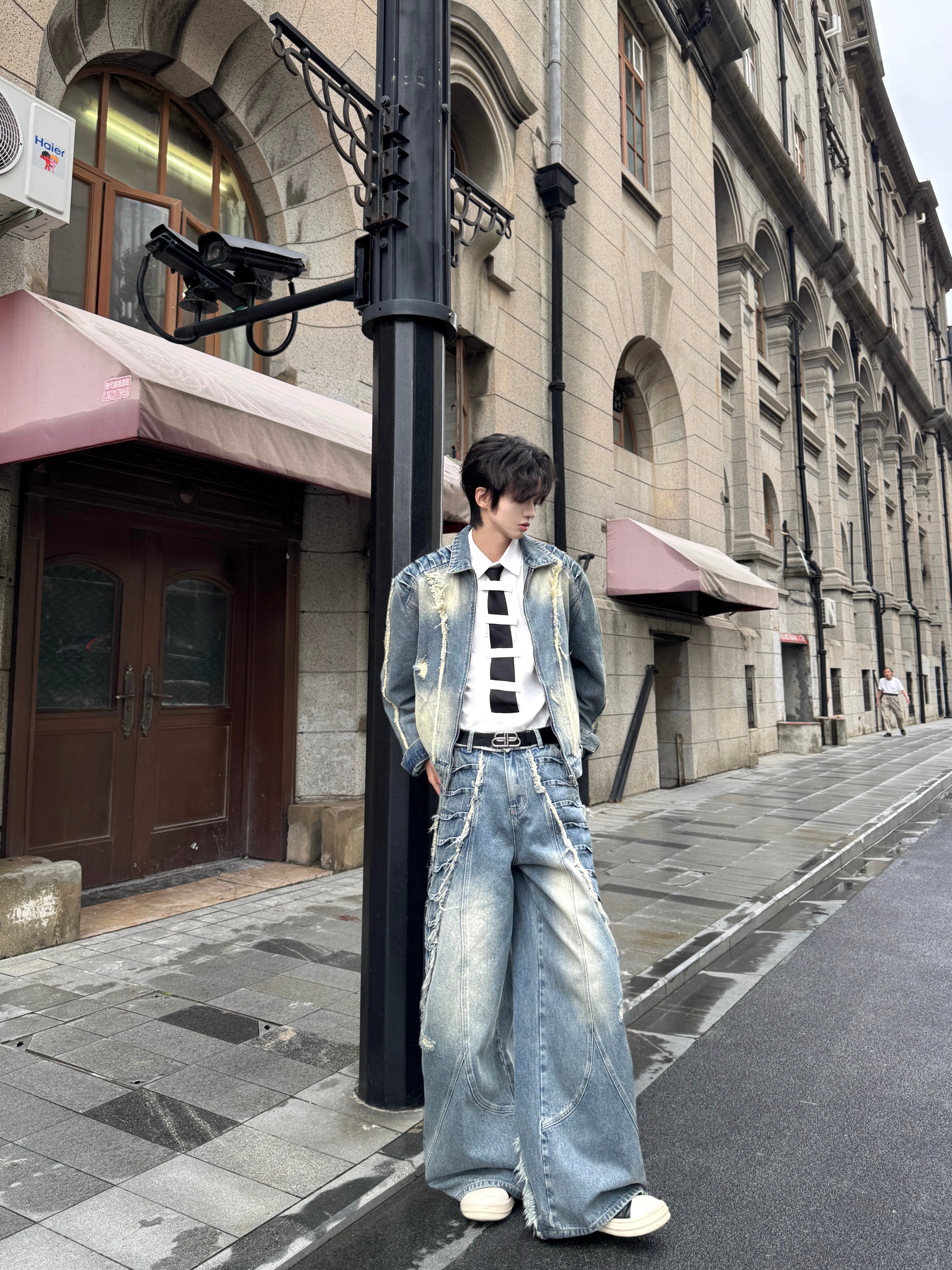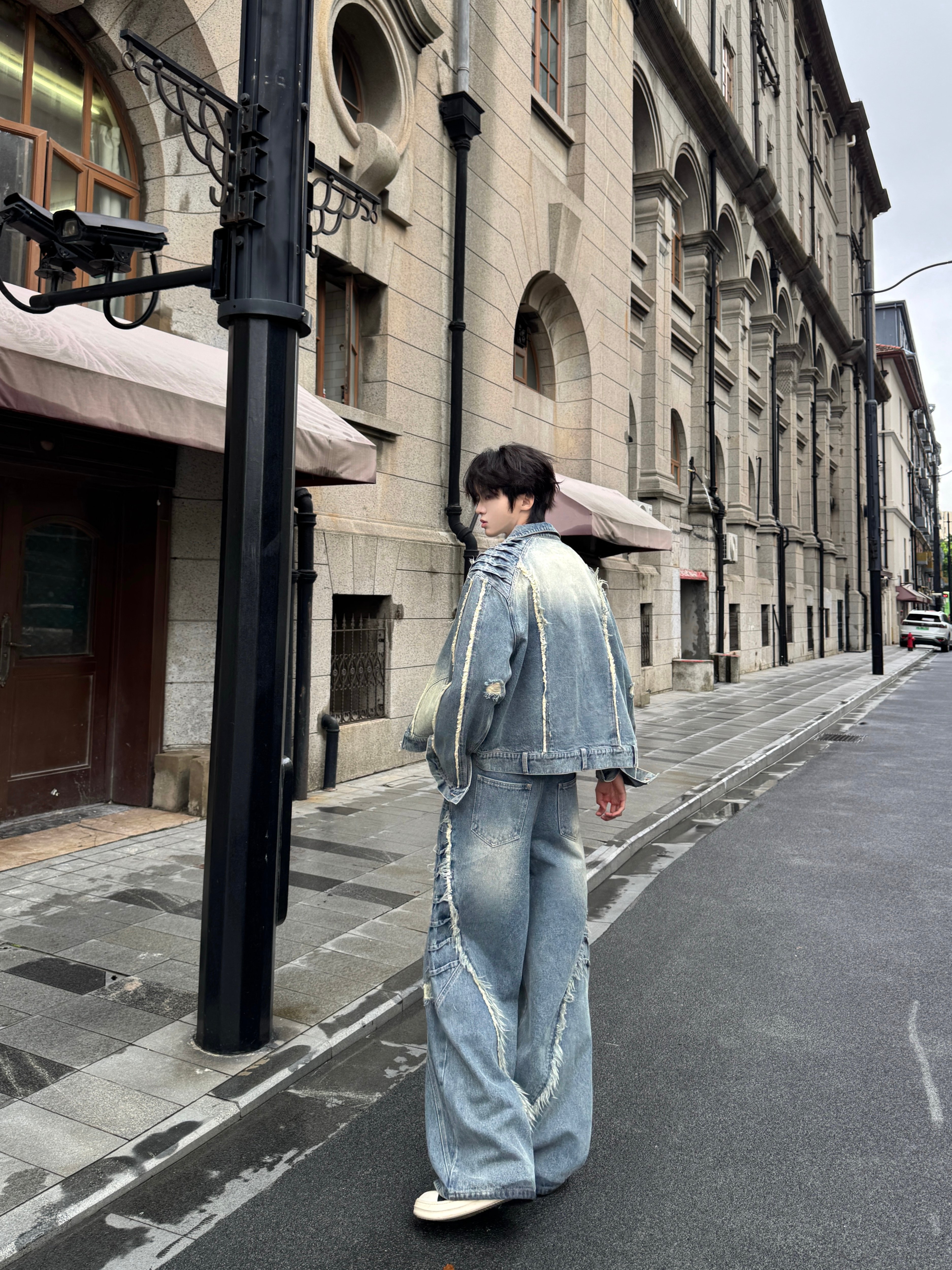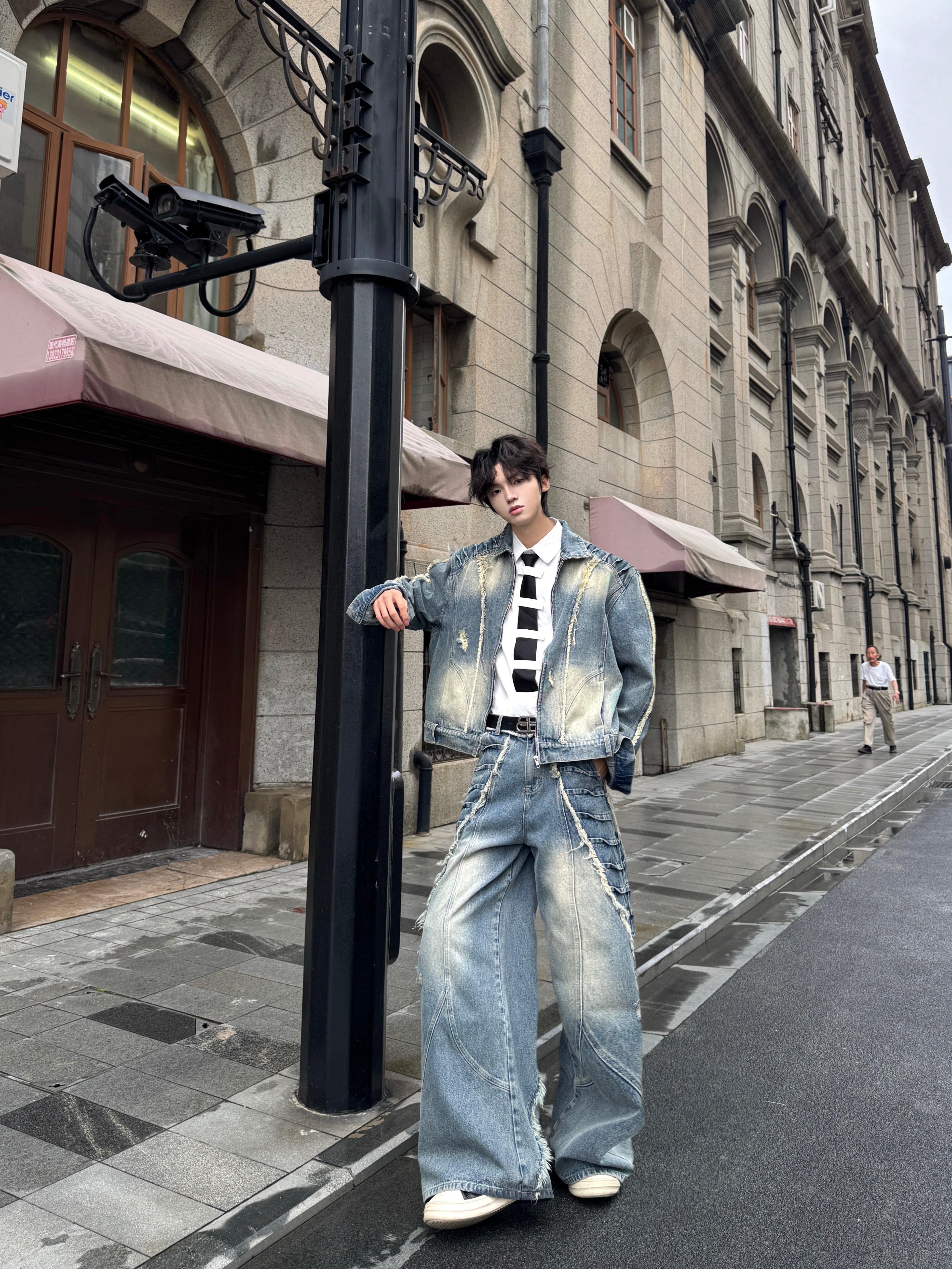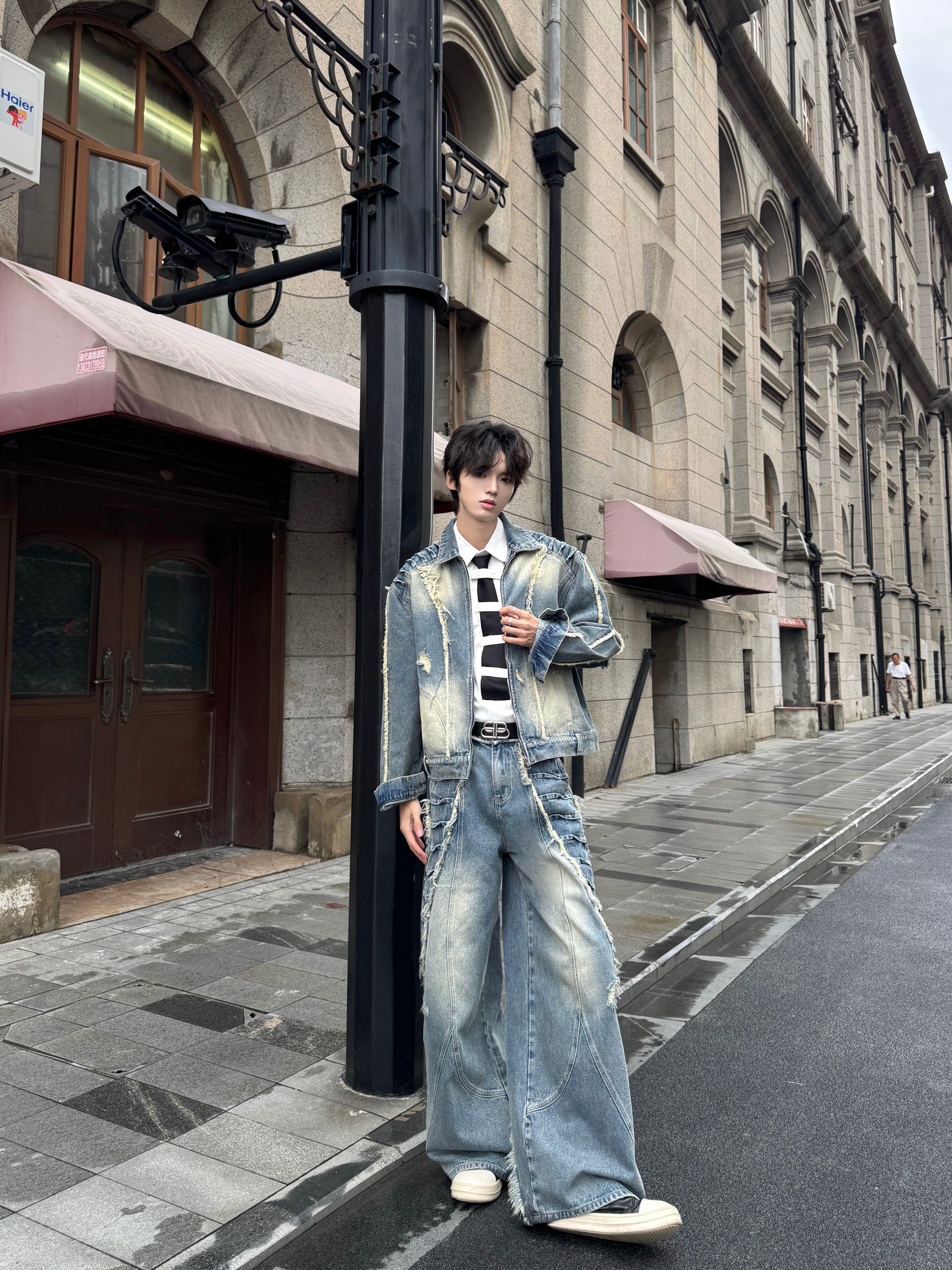 Fringe Damage Wash Denim Jacket & Wide Leg Denim Jeans Setup WN20756