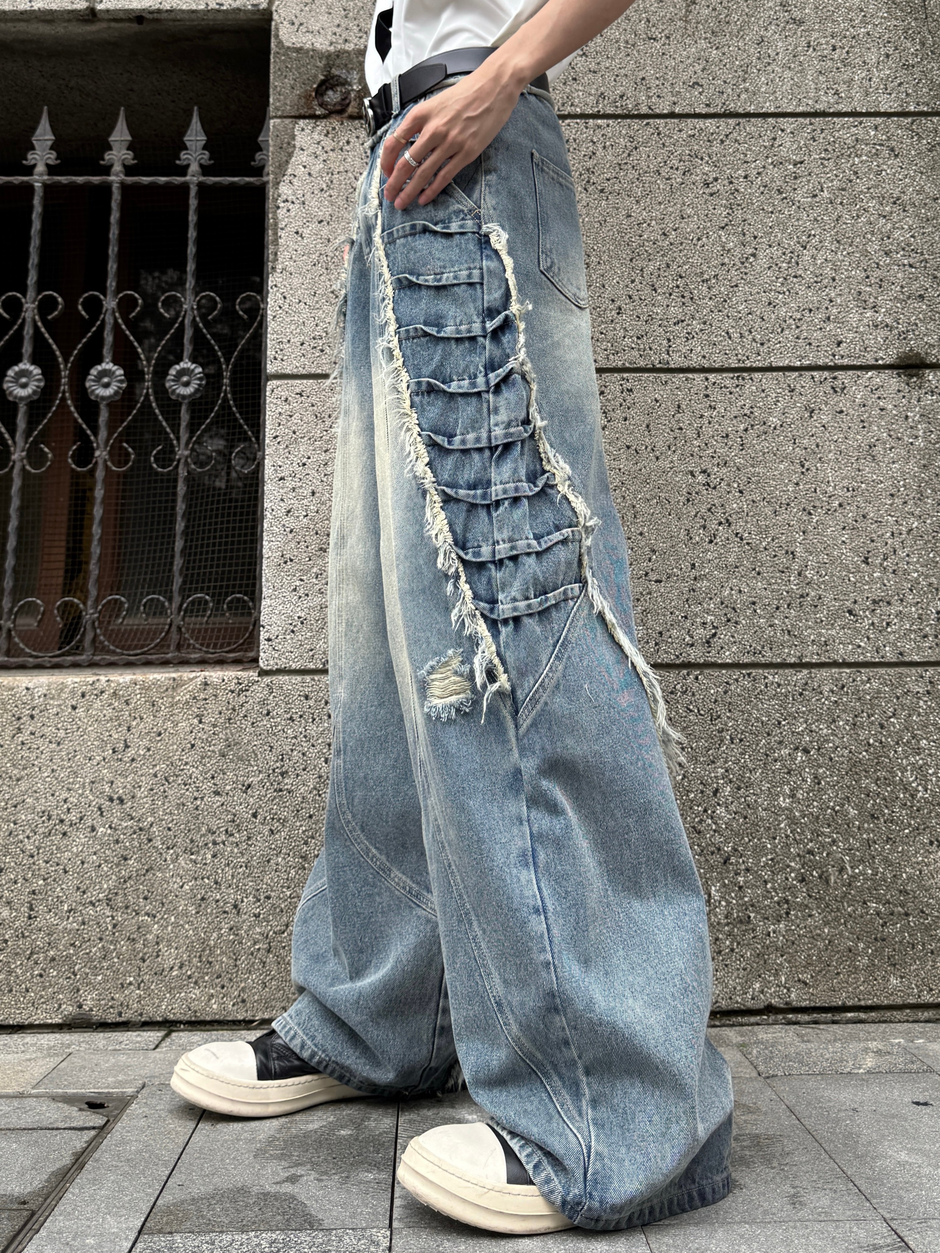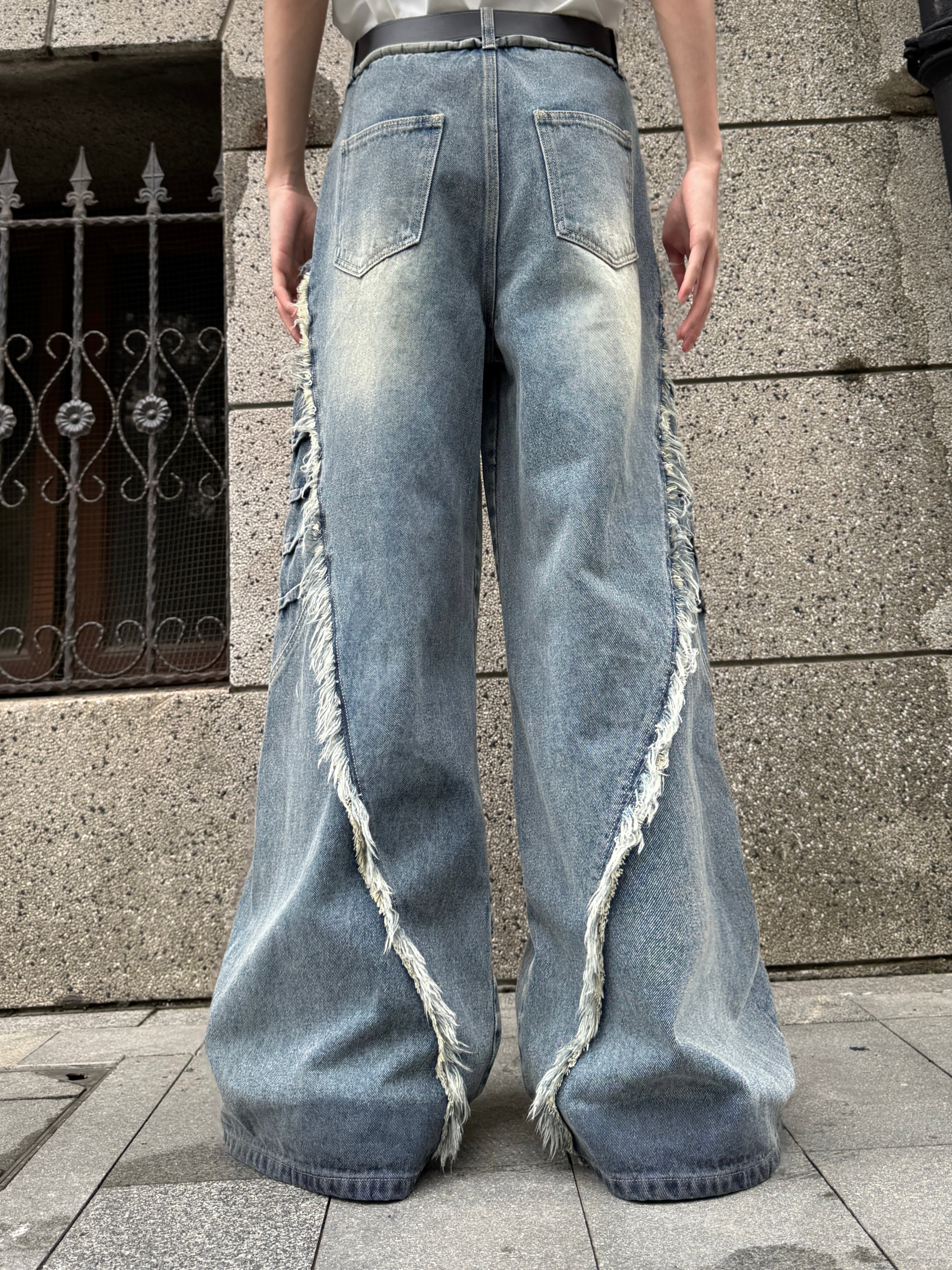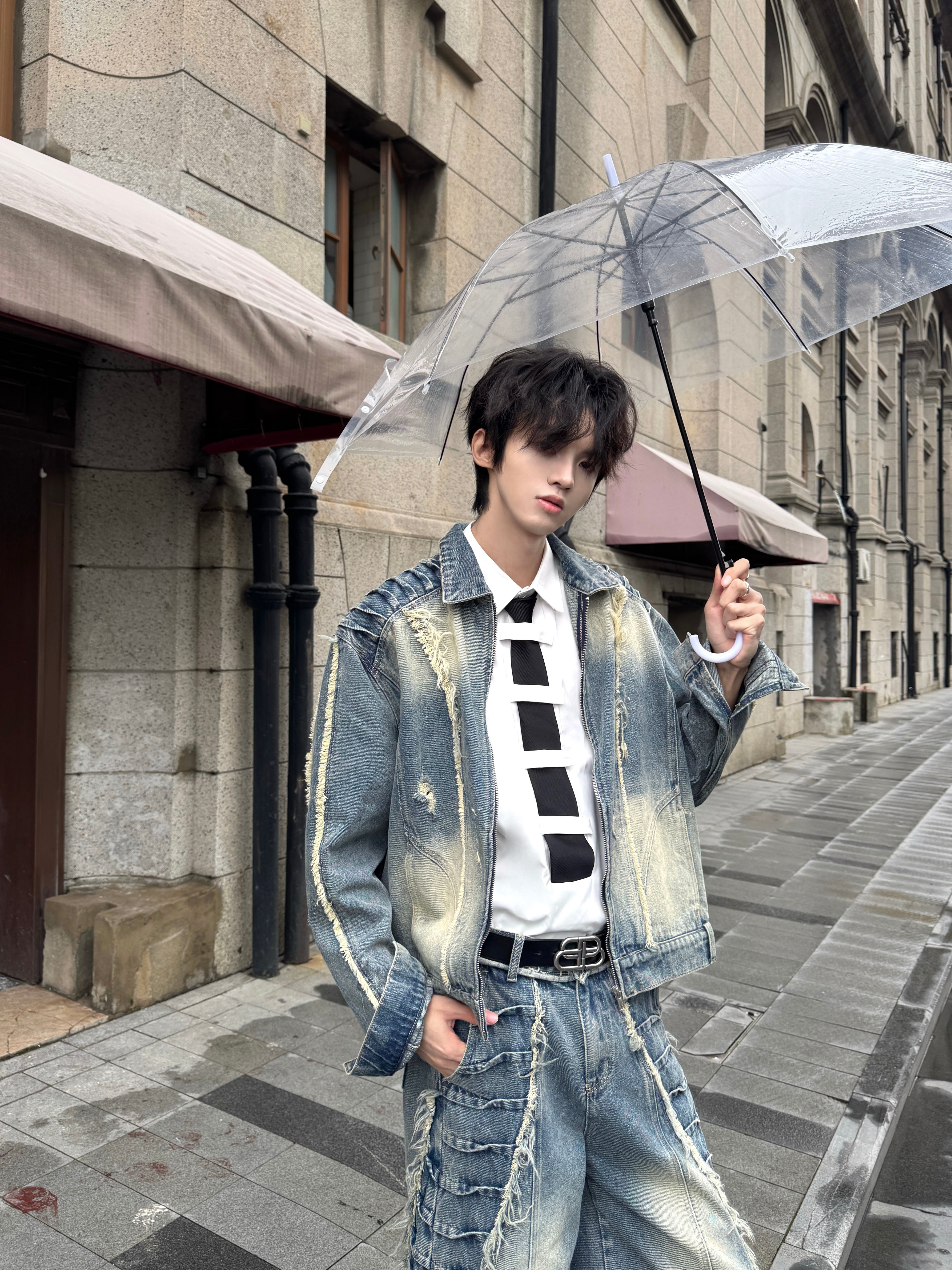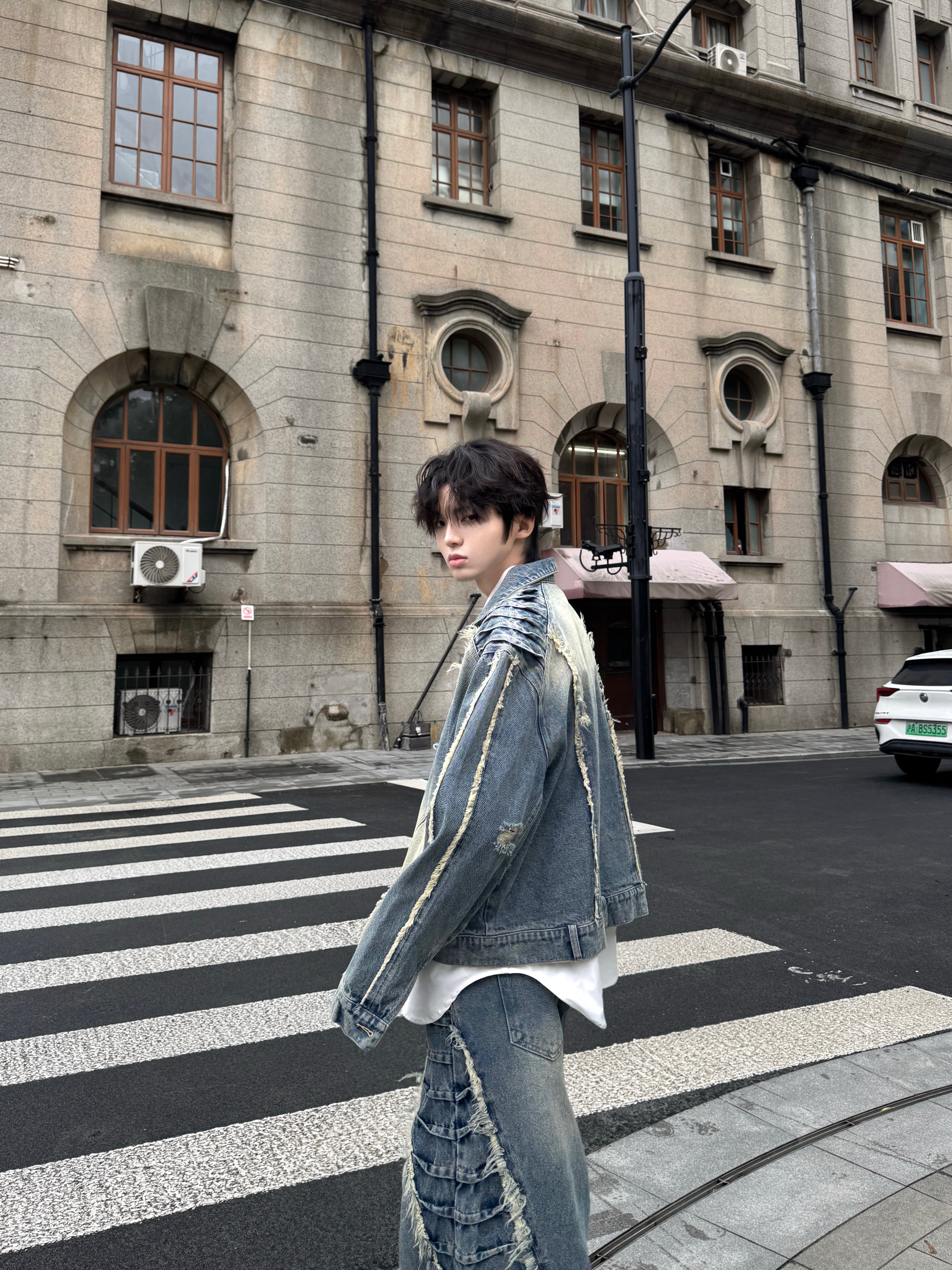 Fringe Damage Wash Denim Jacket & Wide Leg Denim Jeans Setup WN20756