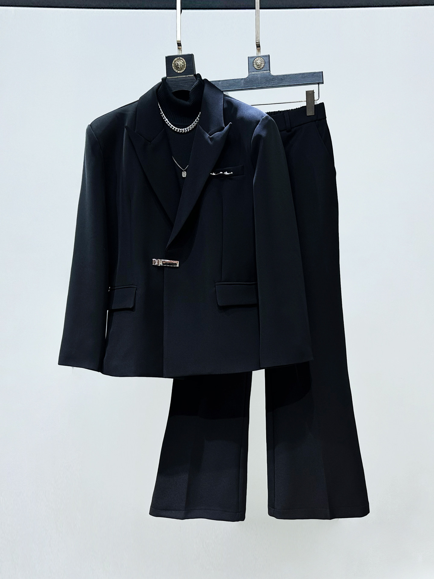 Metal Buckle Oversize Tailored Jacket & Flare Wide Leg Trousers Setup WN23935