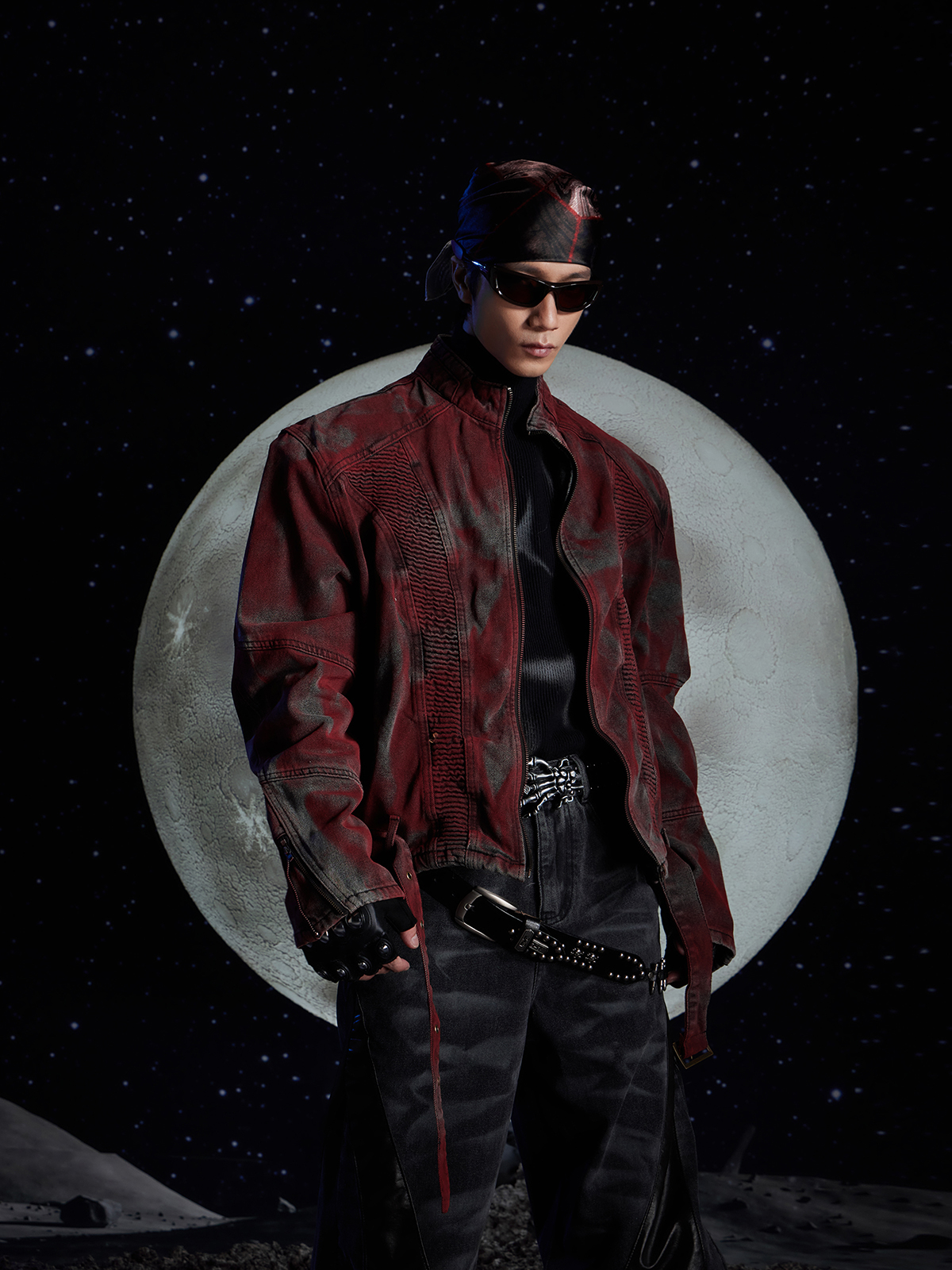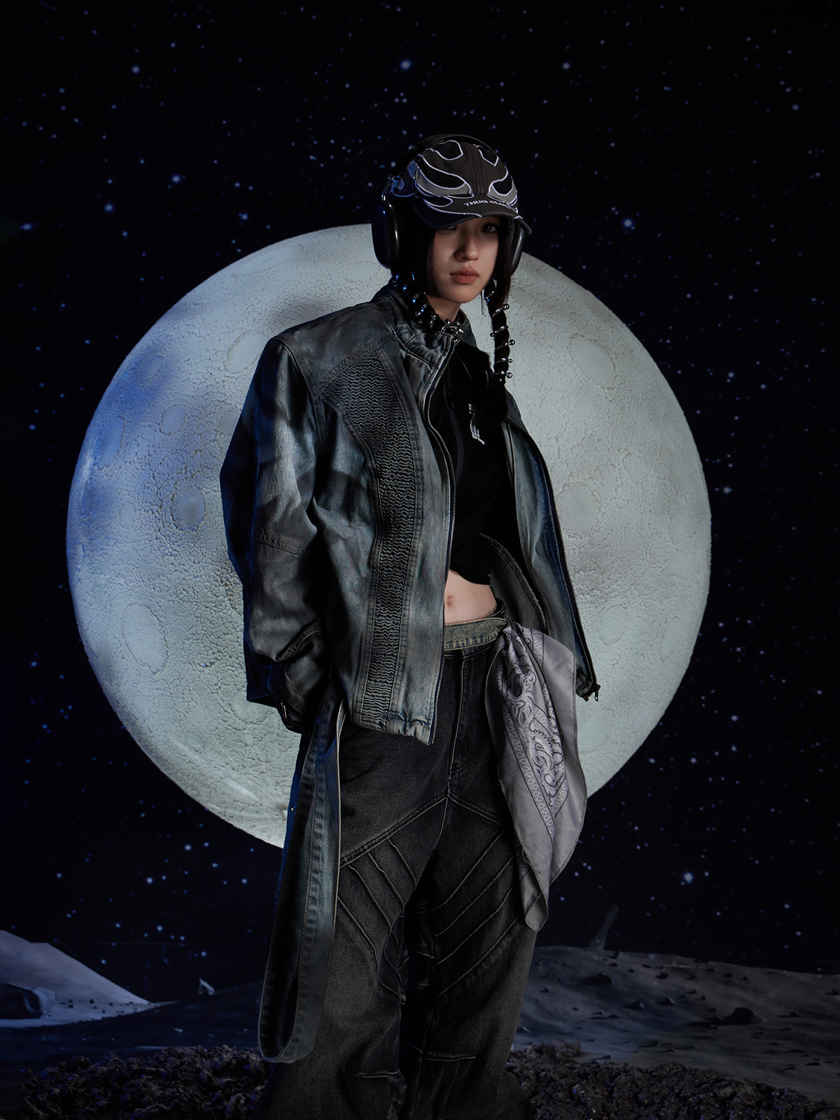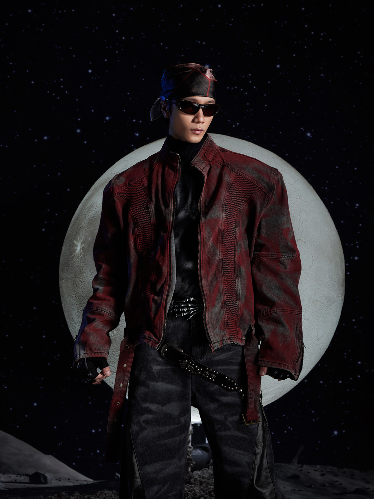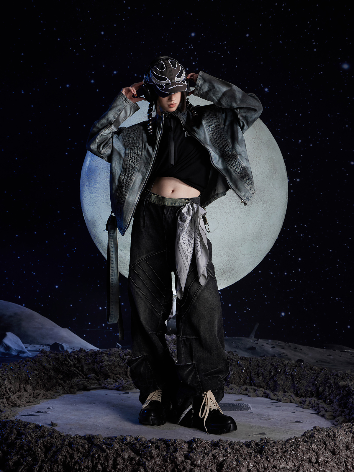 Wrinkled Patchwork Washed Strap Zipper Short Jacket WN13499