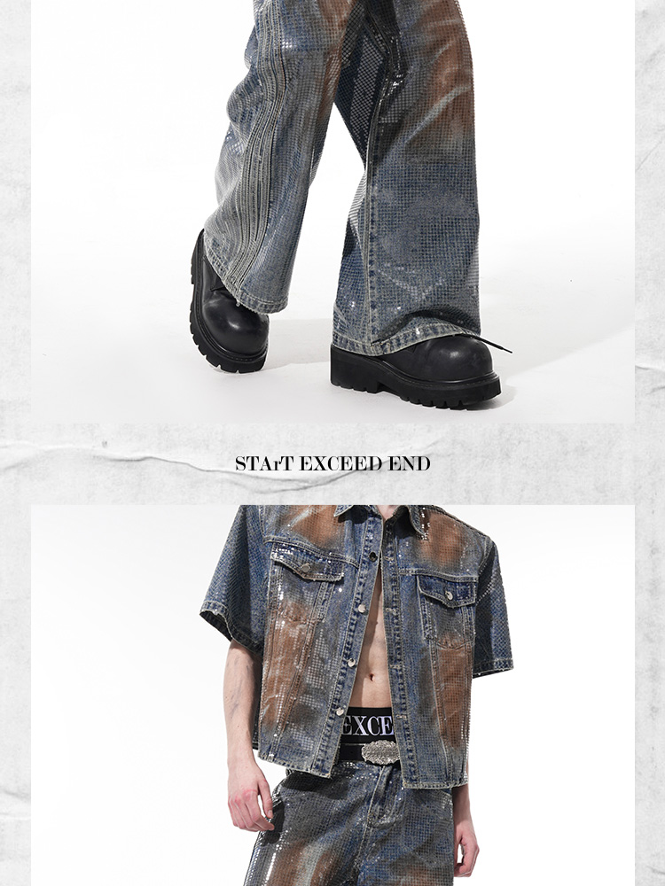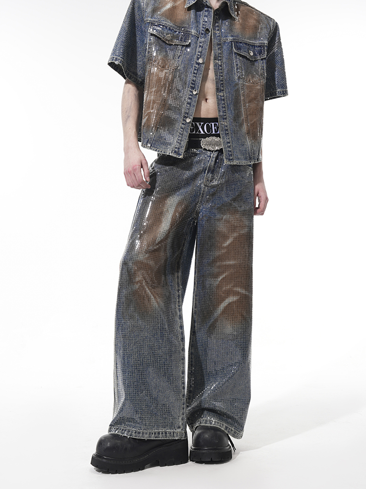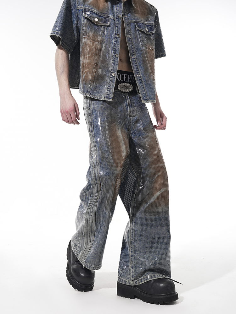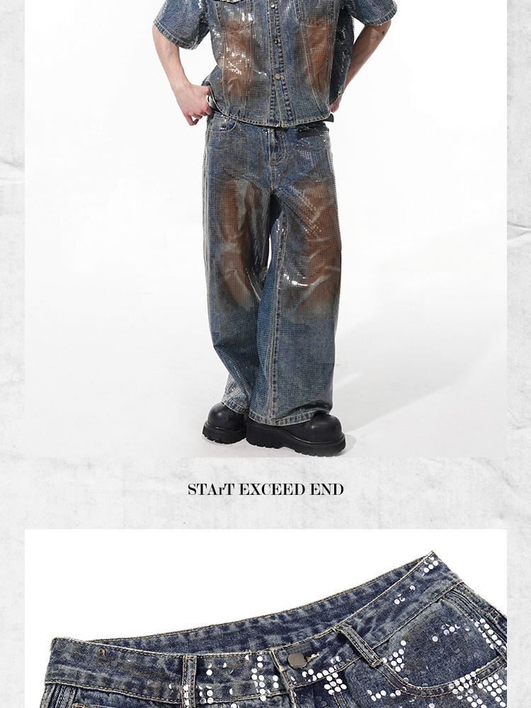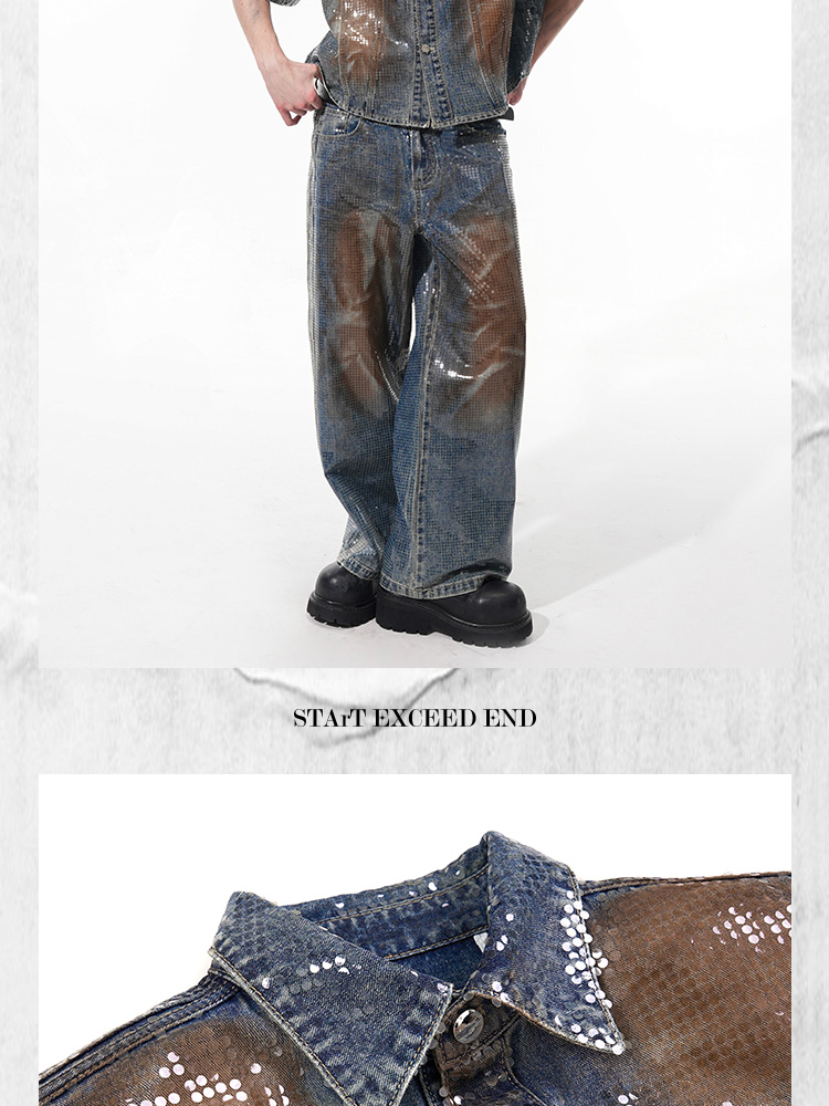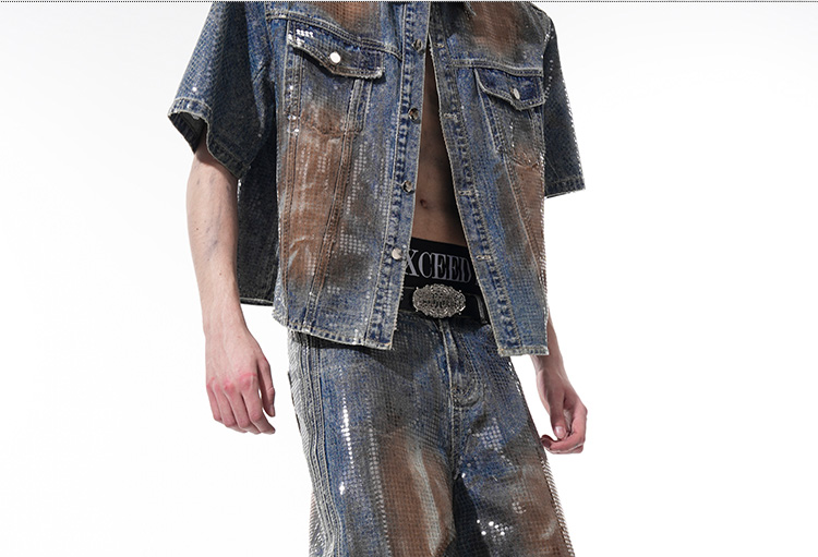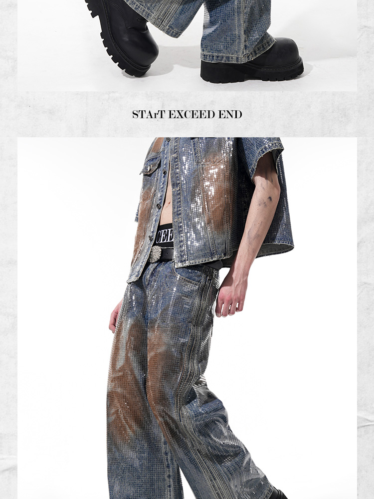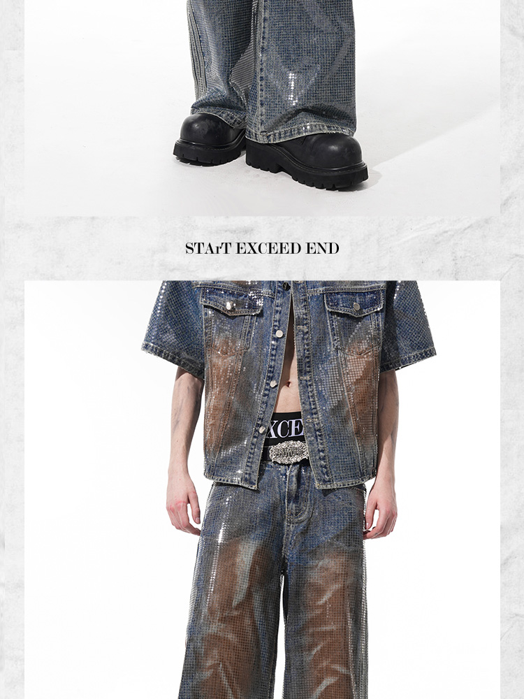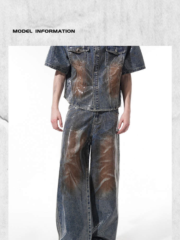 Hot Stamping Sequin Shoulder-pad Denim Short Jacket & Denim Jeans Setup WN14862