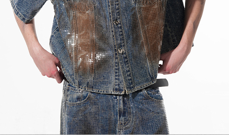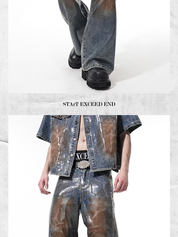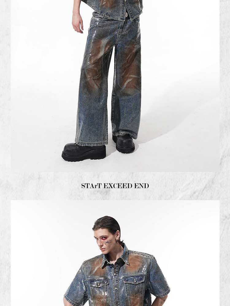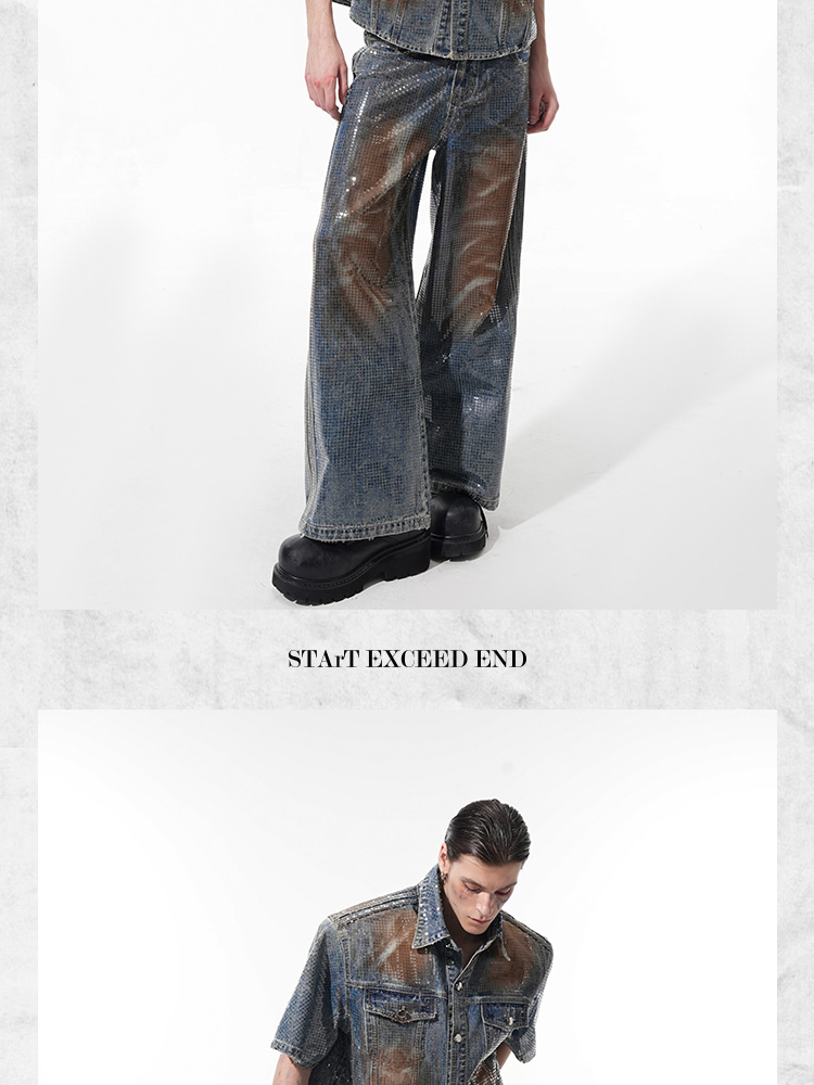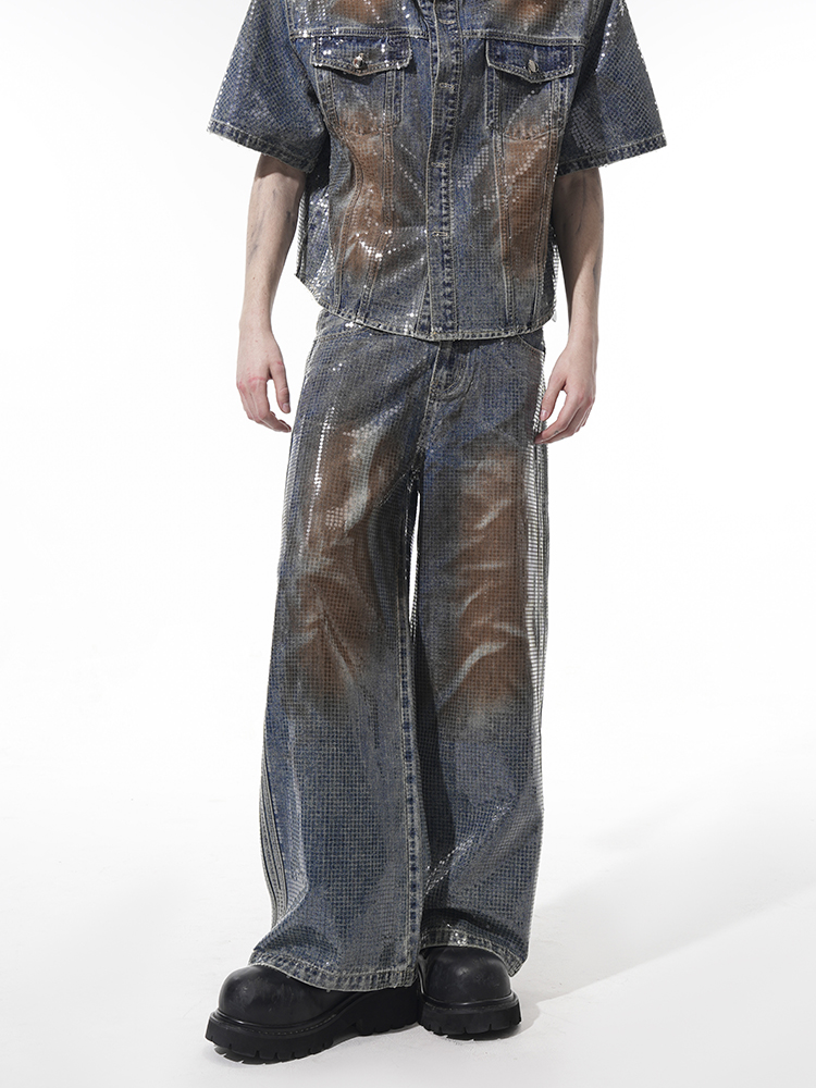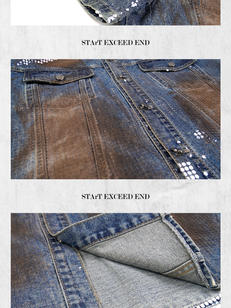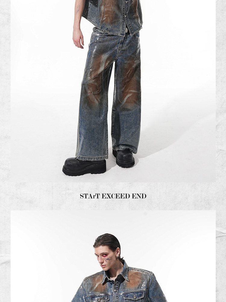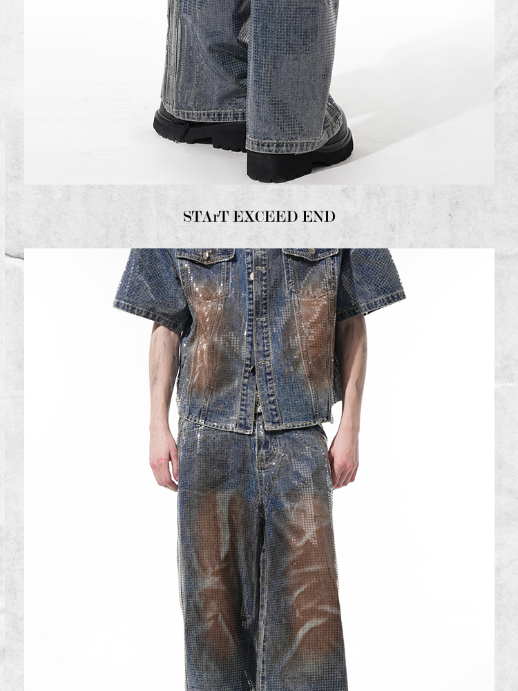 Hot Stamping Sequin Shoulder-pad Denim Short Jacket & Denim Jeans Setup WN14862