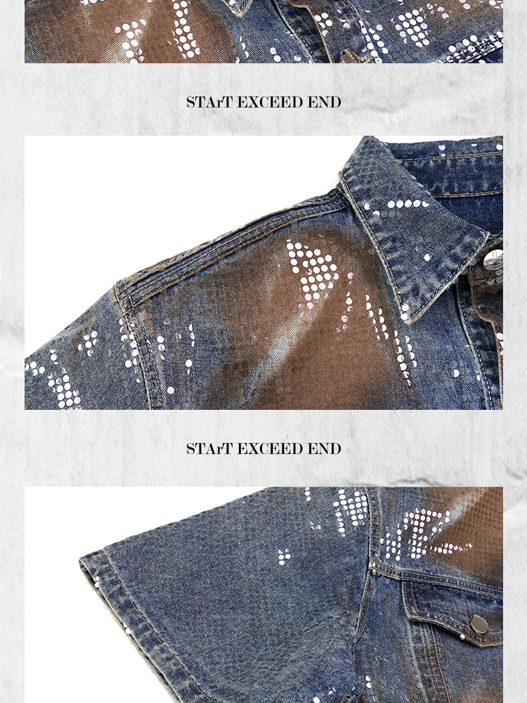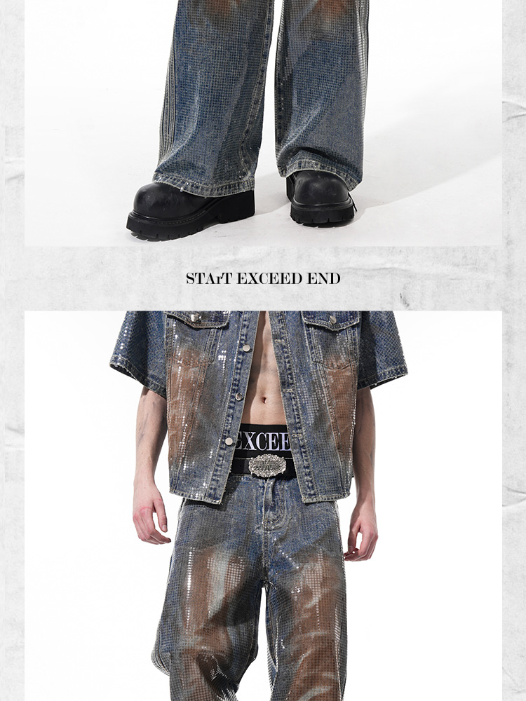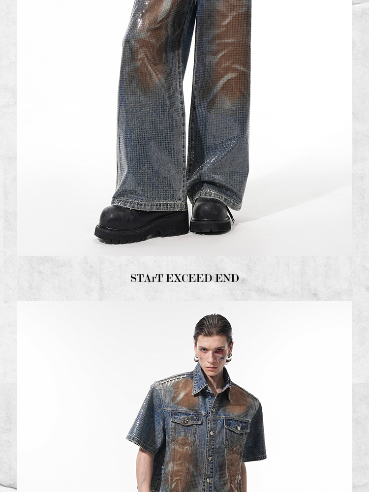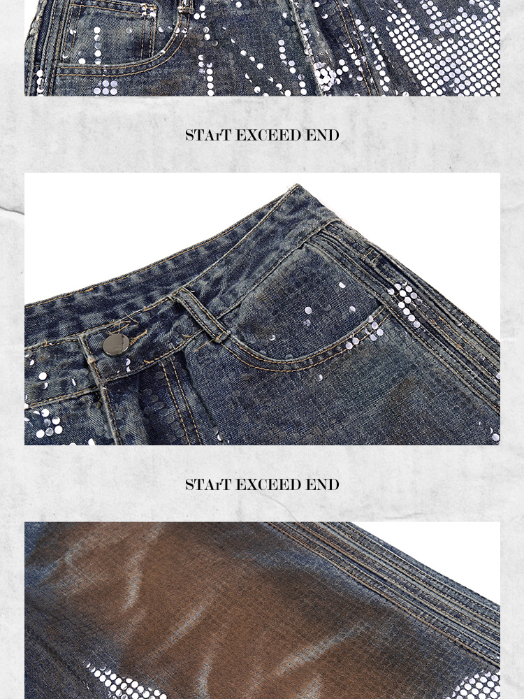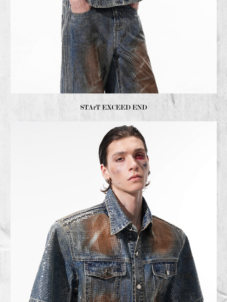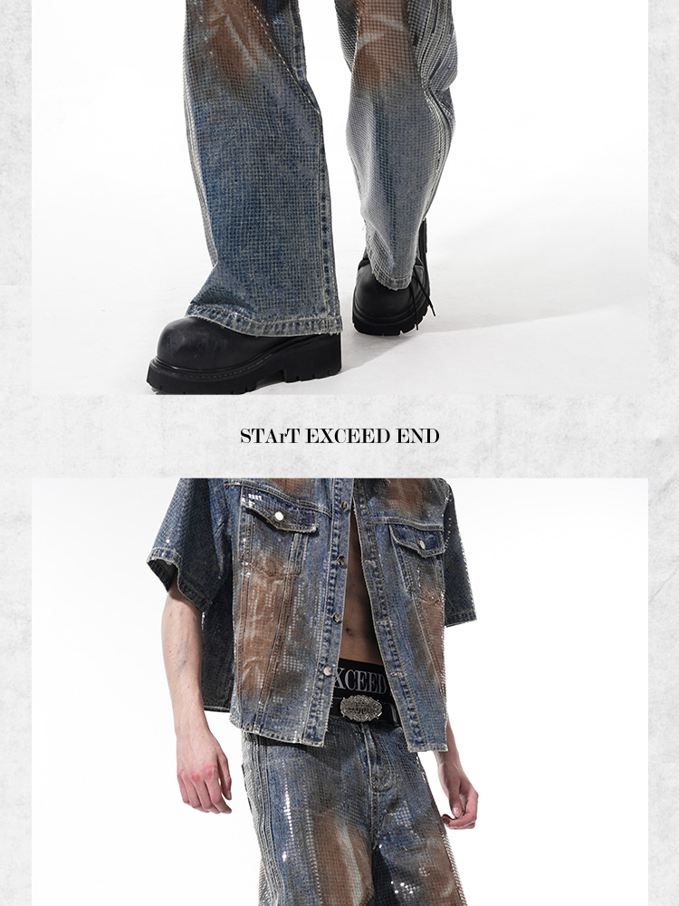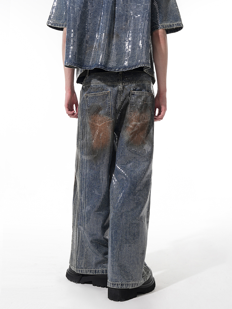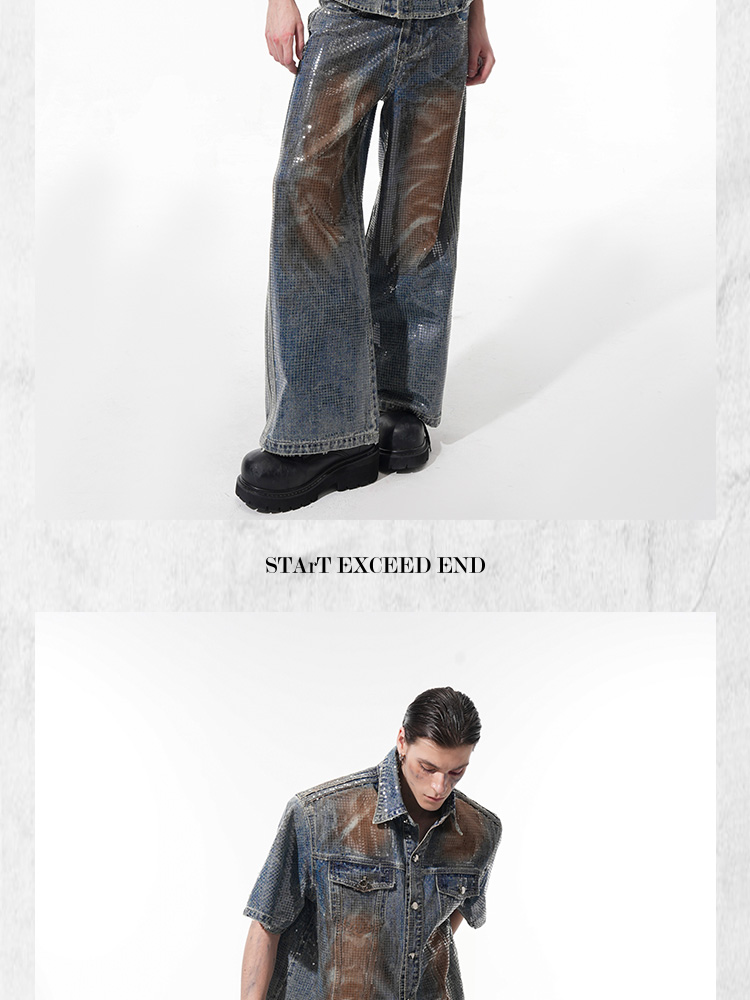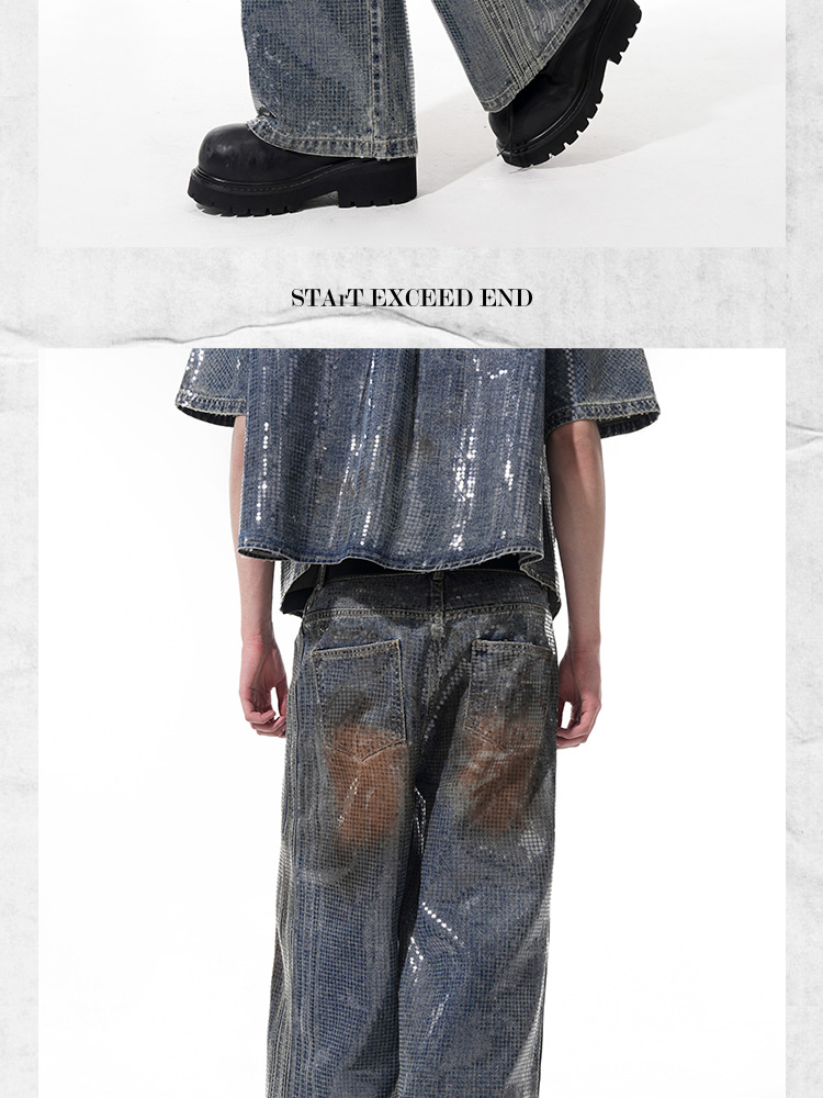 Hot Stamping Sequin Shoulder-pad Denim Short Jacket & Denim Jeans Setup WN14862