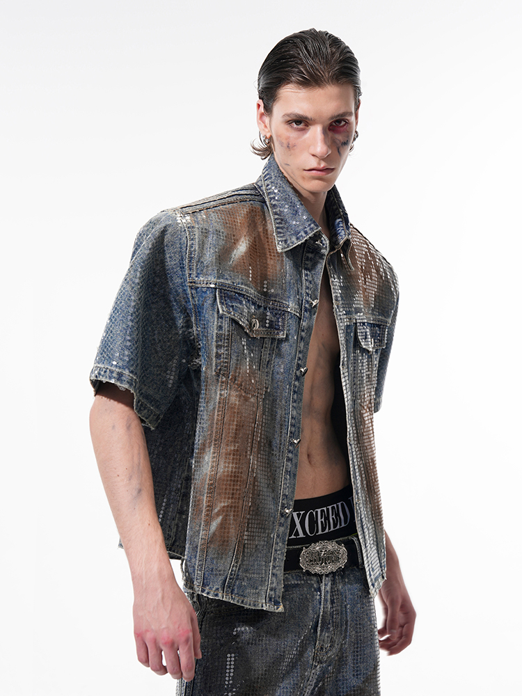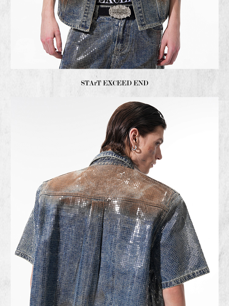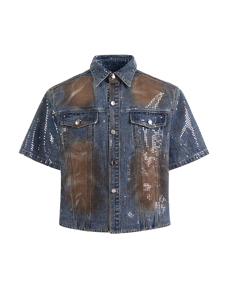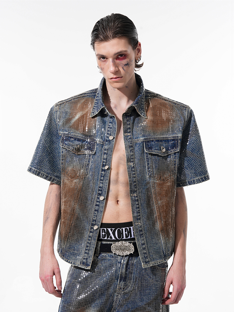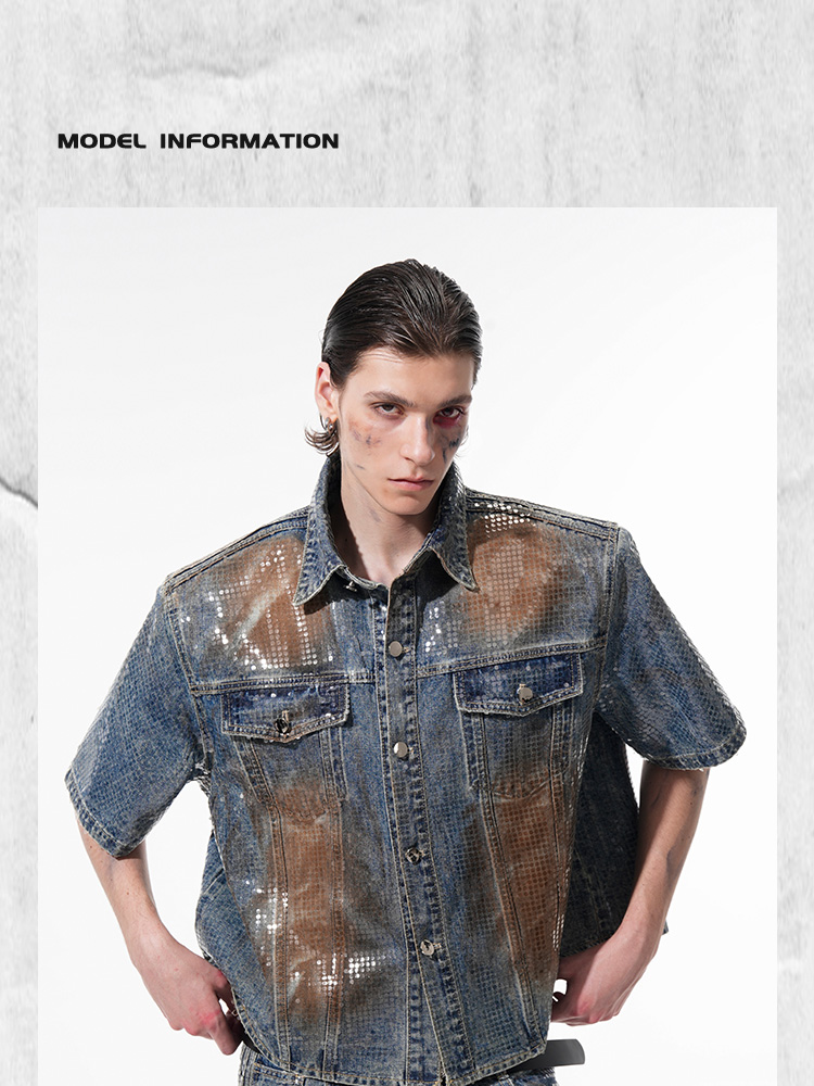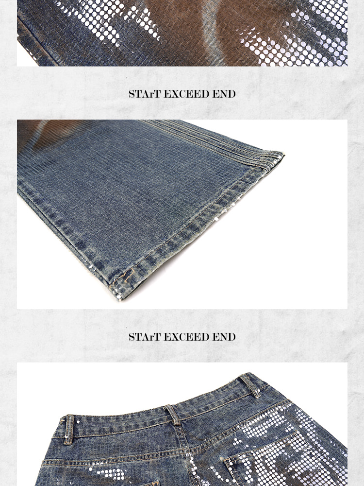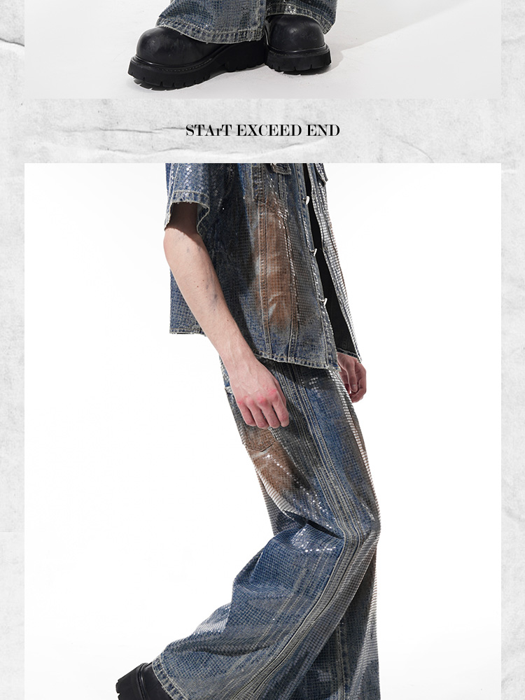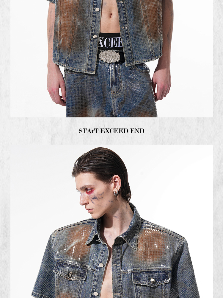 Hot Stamping Sequin Shoulder-pad Denim Short Jacket & Denim Jeans Setup WN14862
