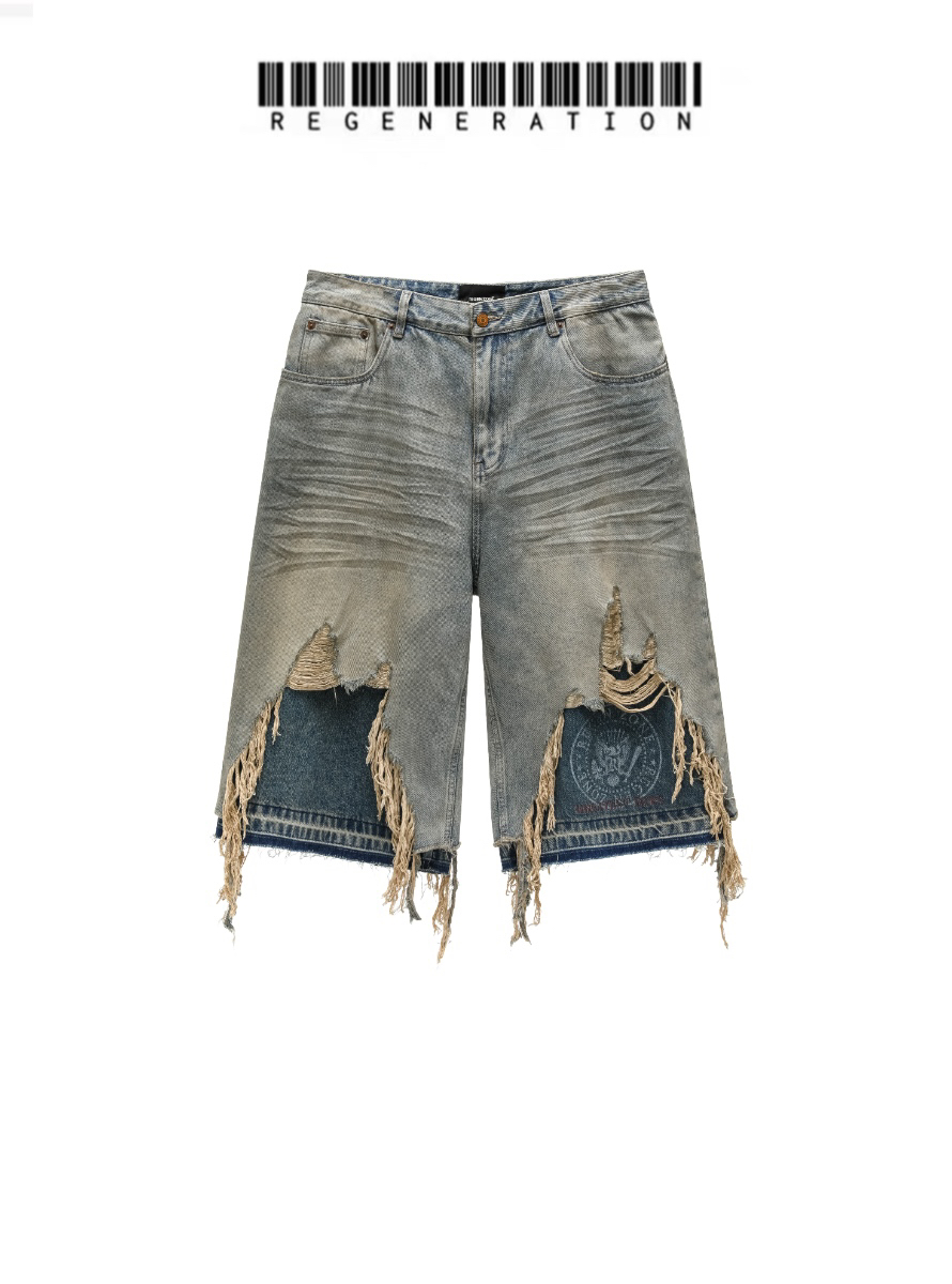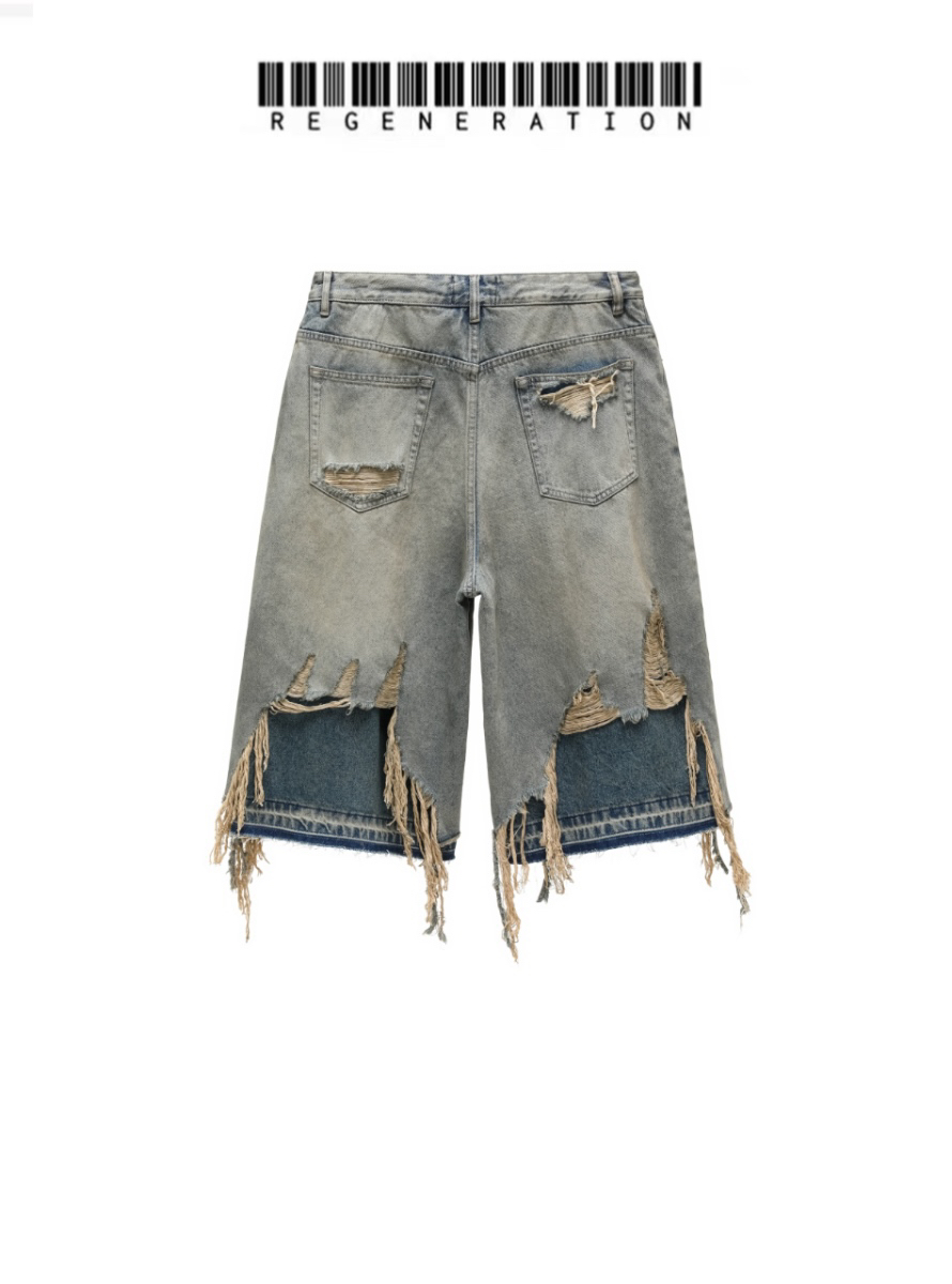 Washed Whisker Patchwork Half Denim Jeans WN19687