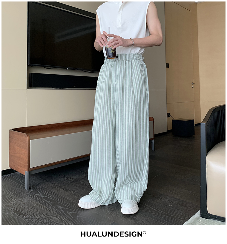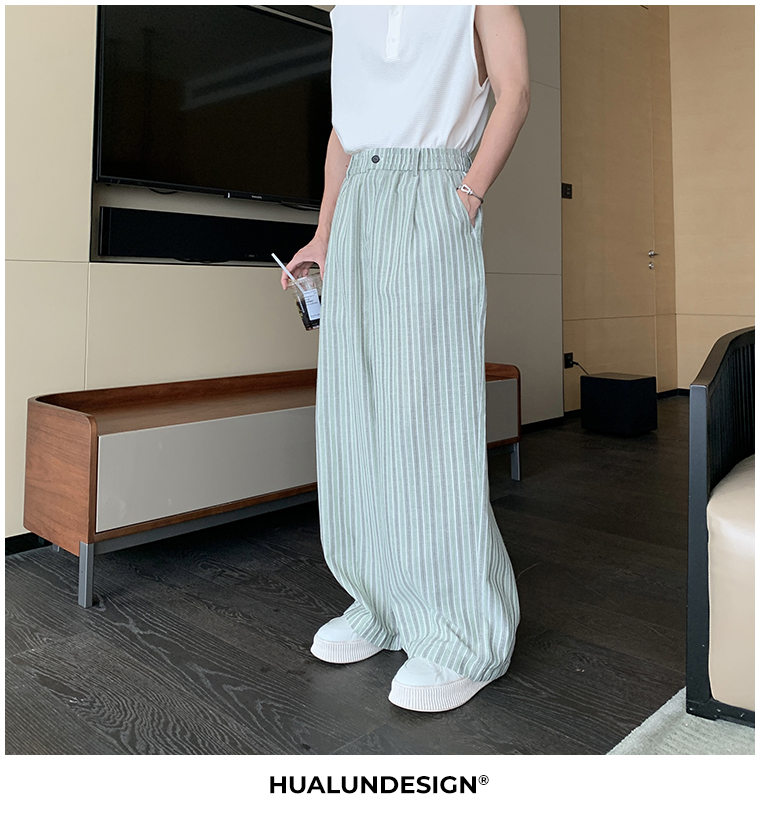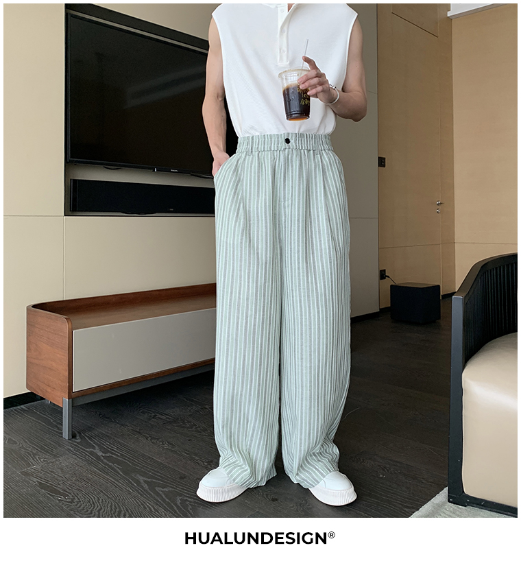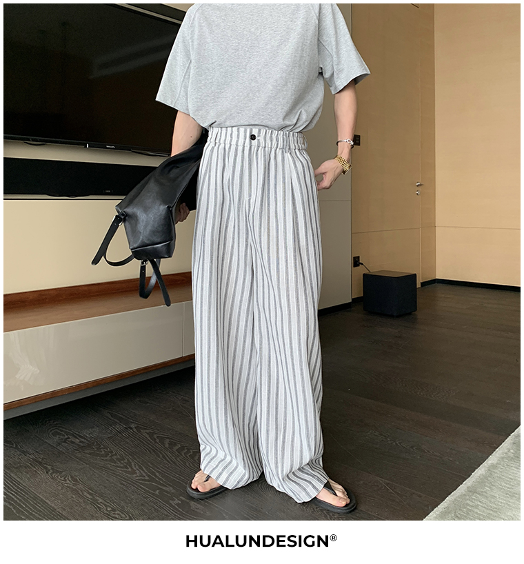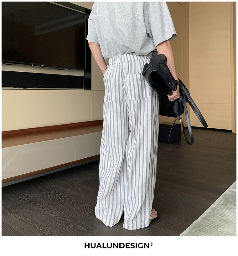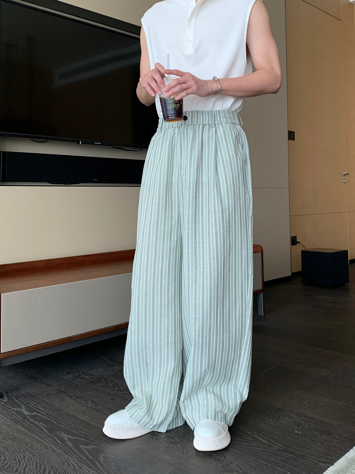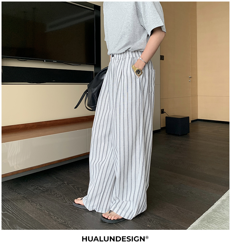 Striped Cotton Elastic Waist Wide Leg Straight Pants WN20442