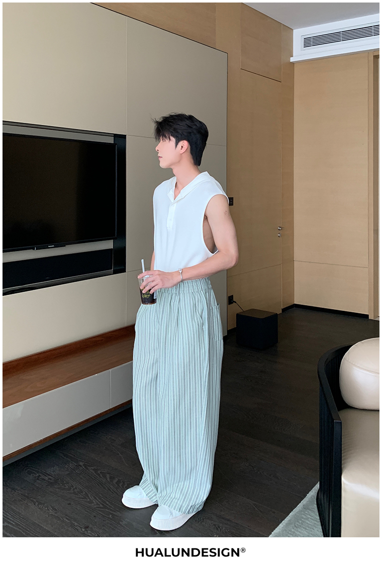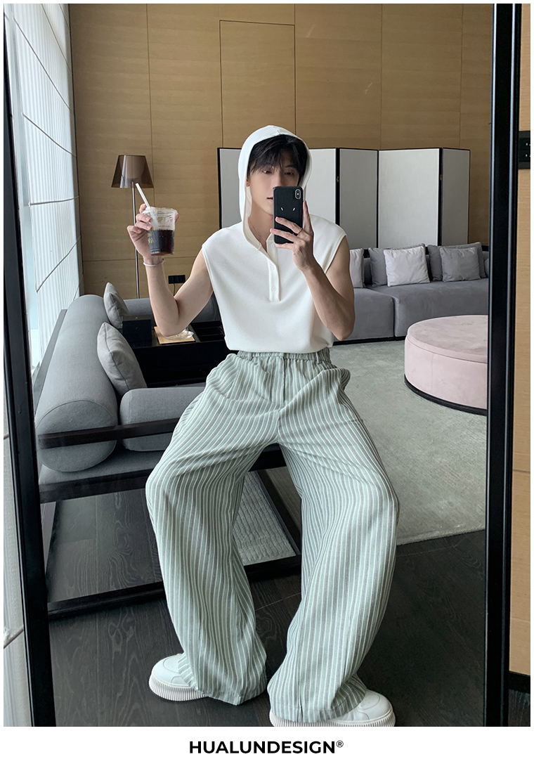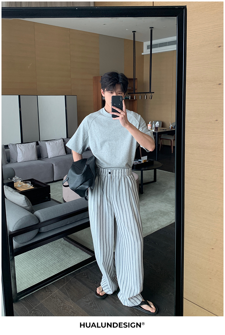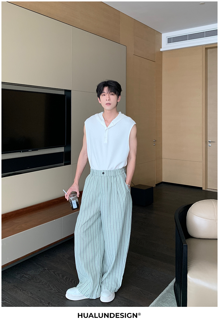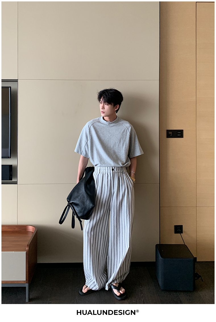 Striped Cotton Elastic Waist Wide Leg Straight Pants WN20442
