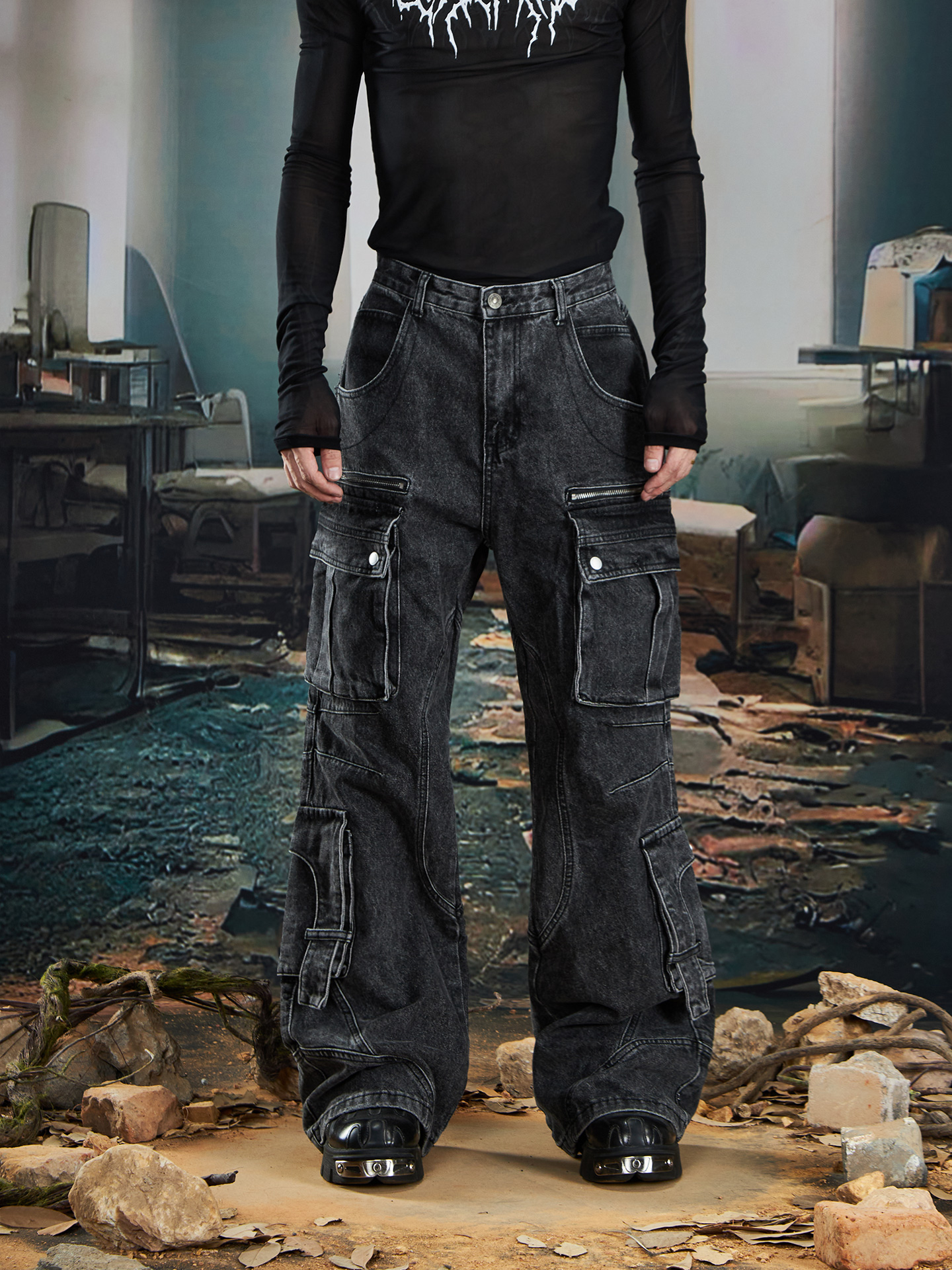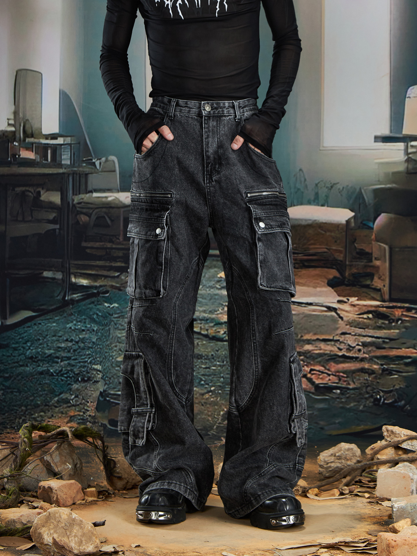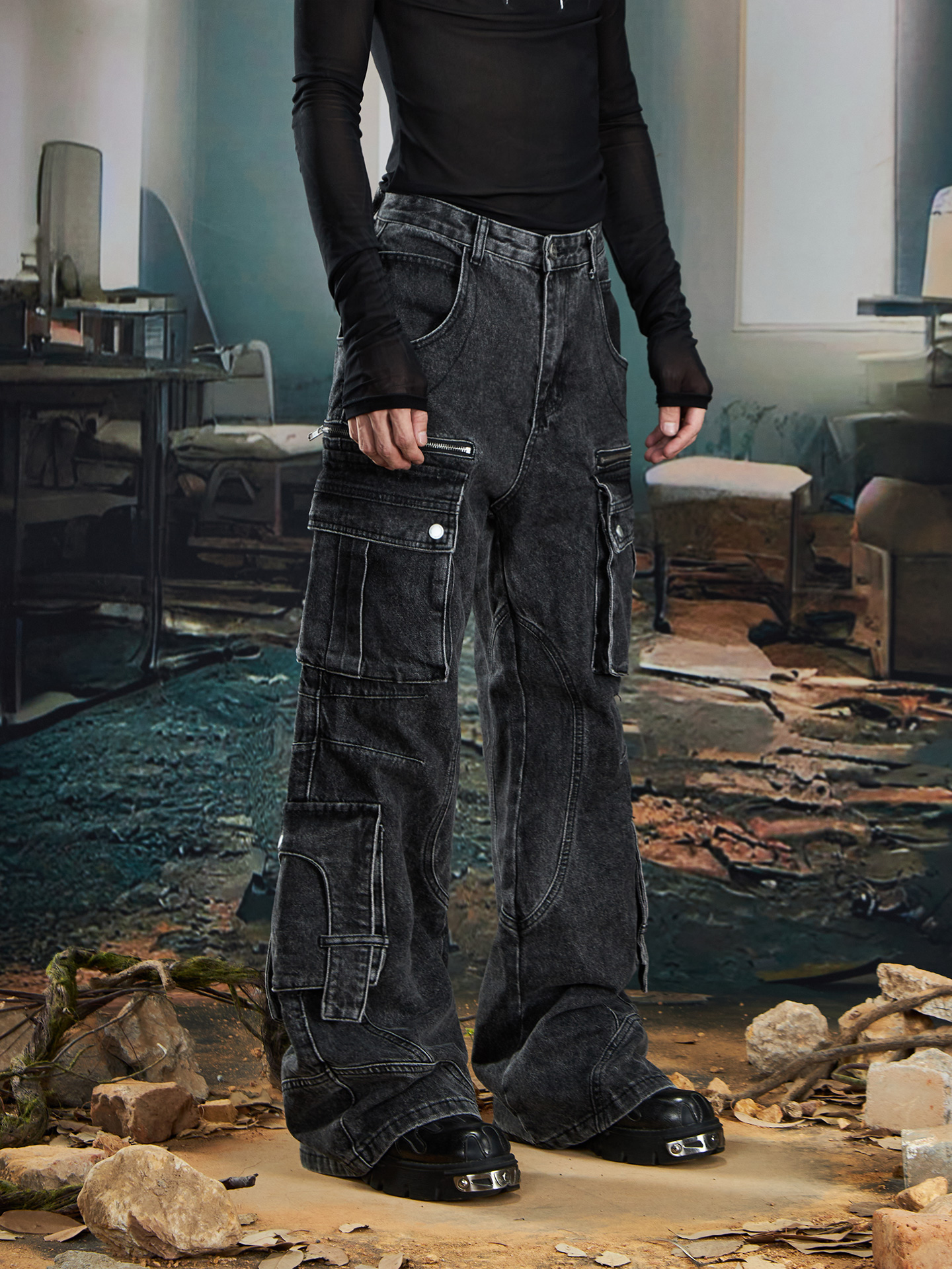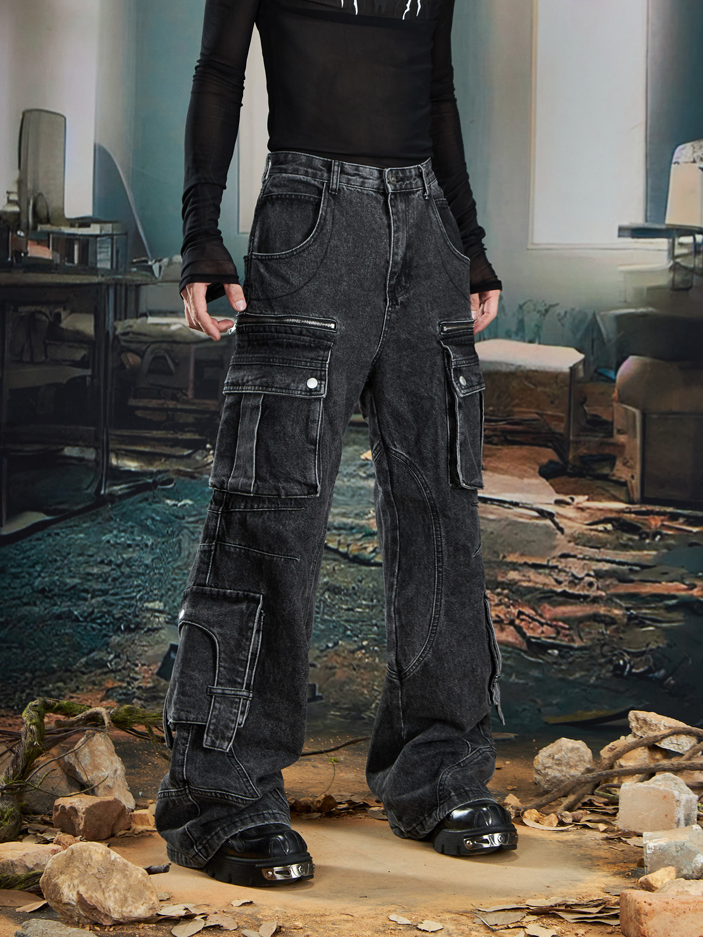 Multi-Pocket Washed Deconstructed 3D Cut Straight Cargo Denim Jeans WN20592