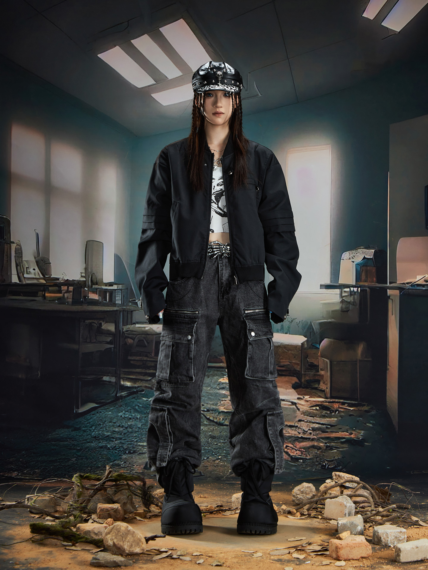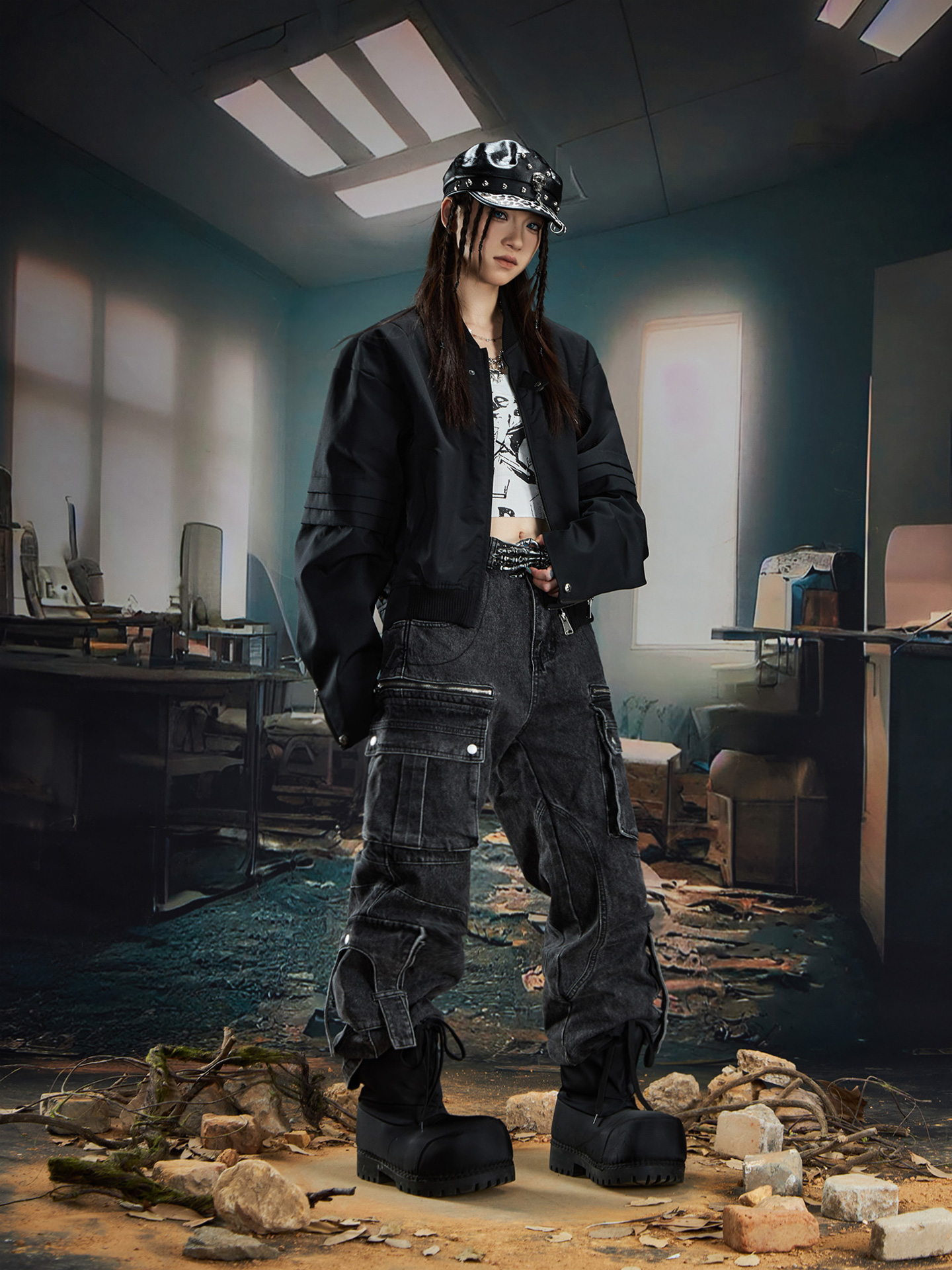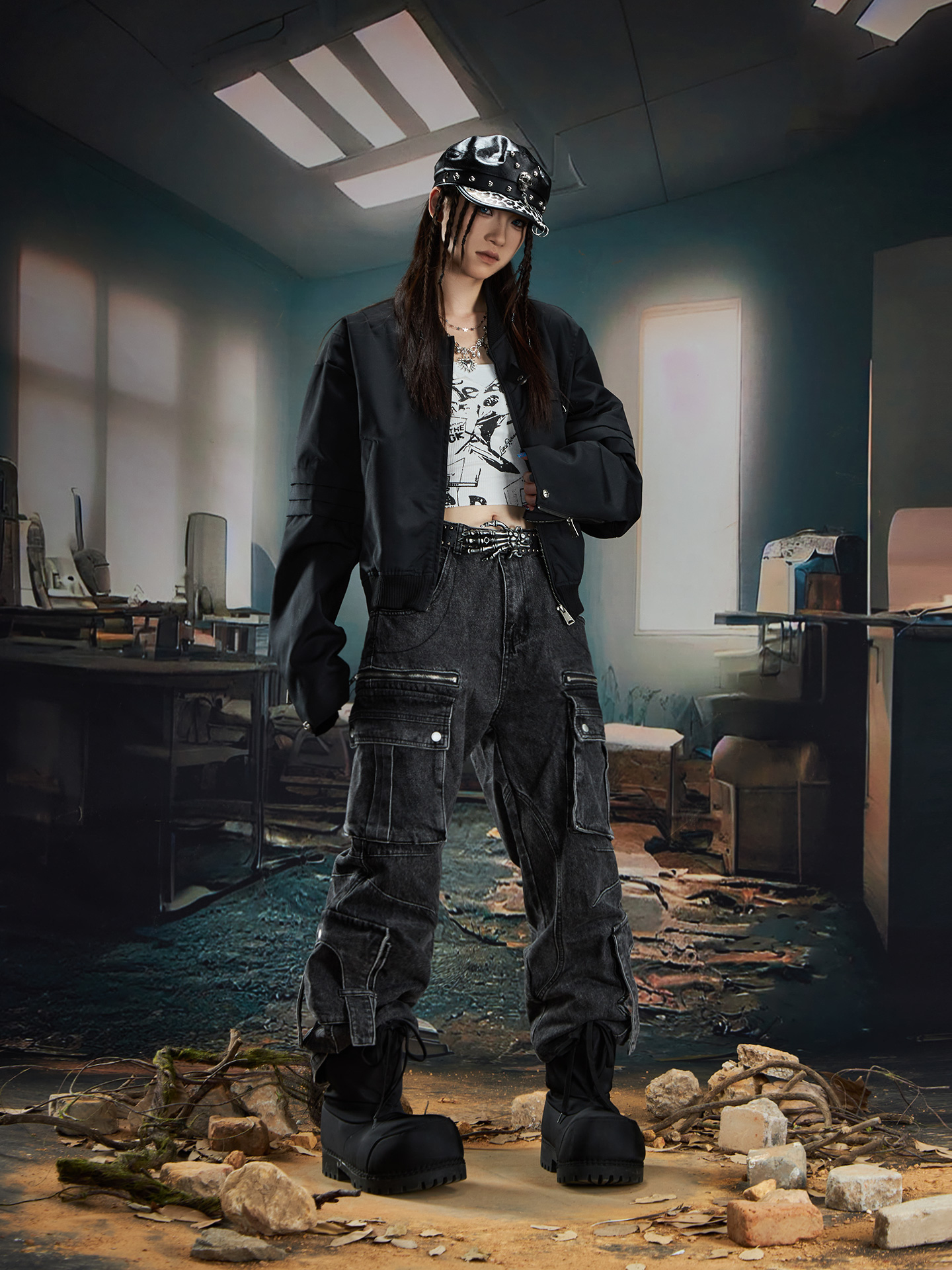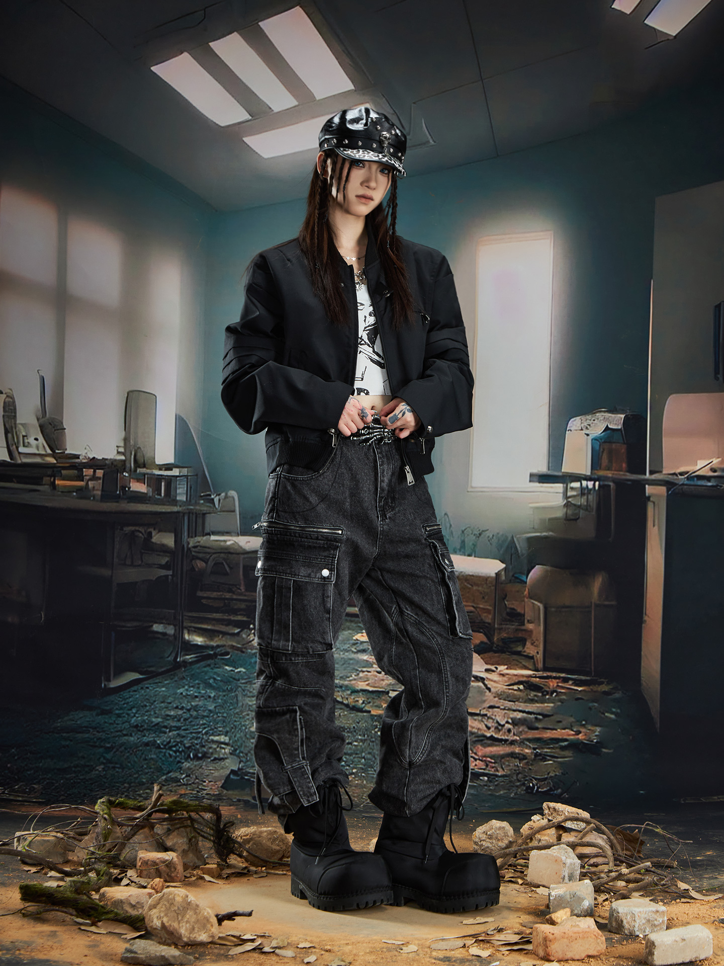 Multi-Pocket Washed Deconstructed 3D Cut Straight Cargo Denim Jeans WN20592