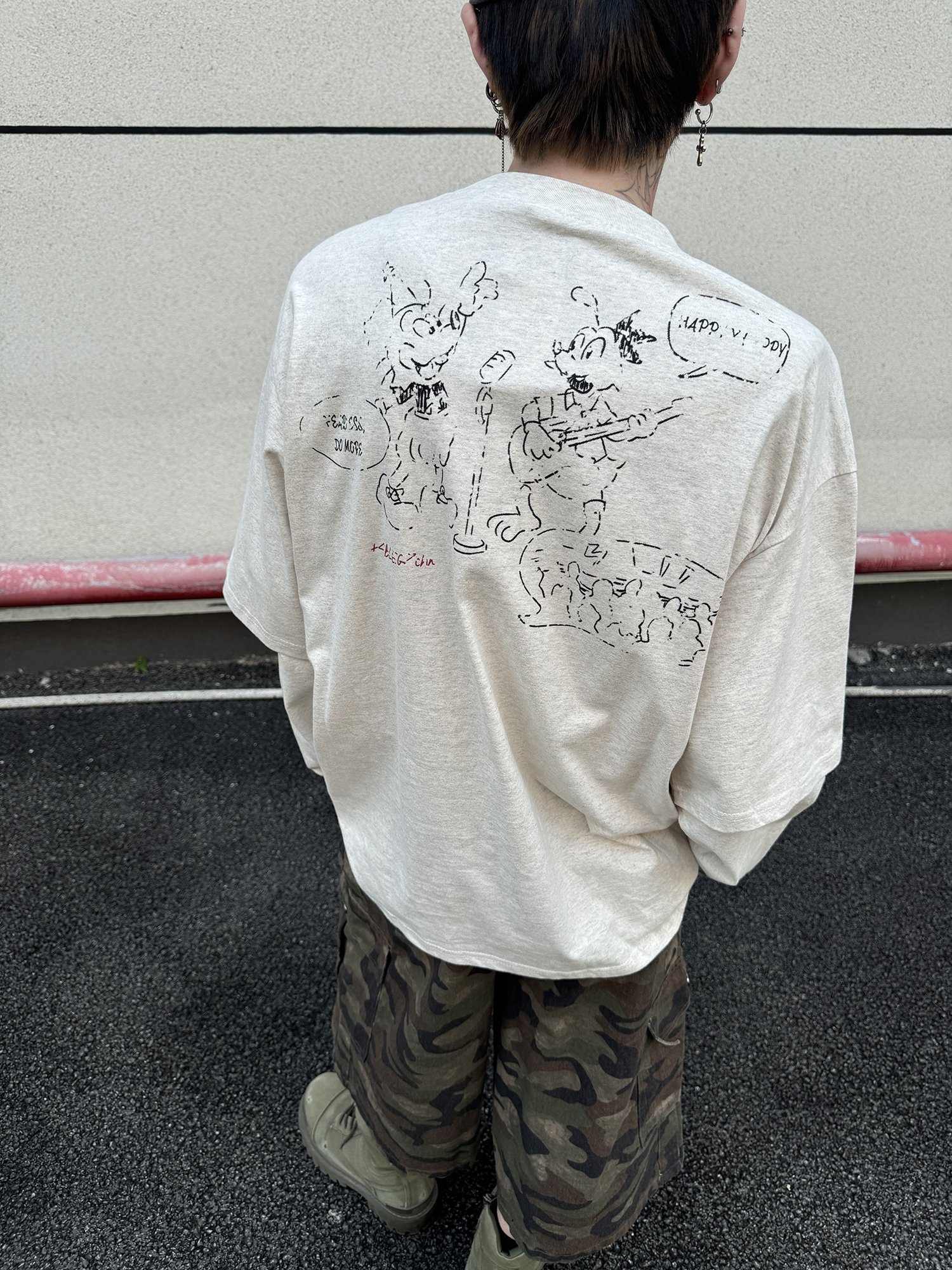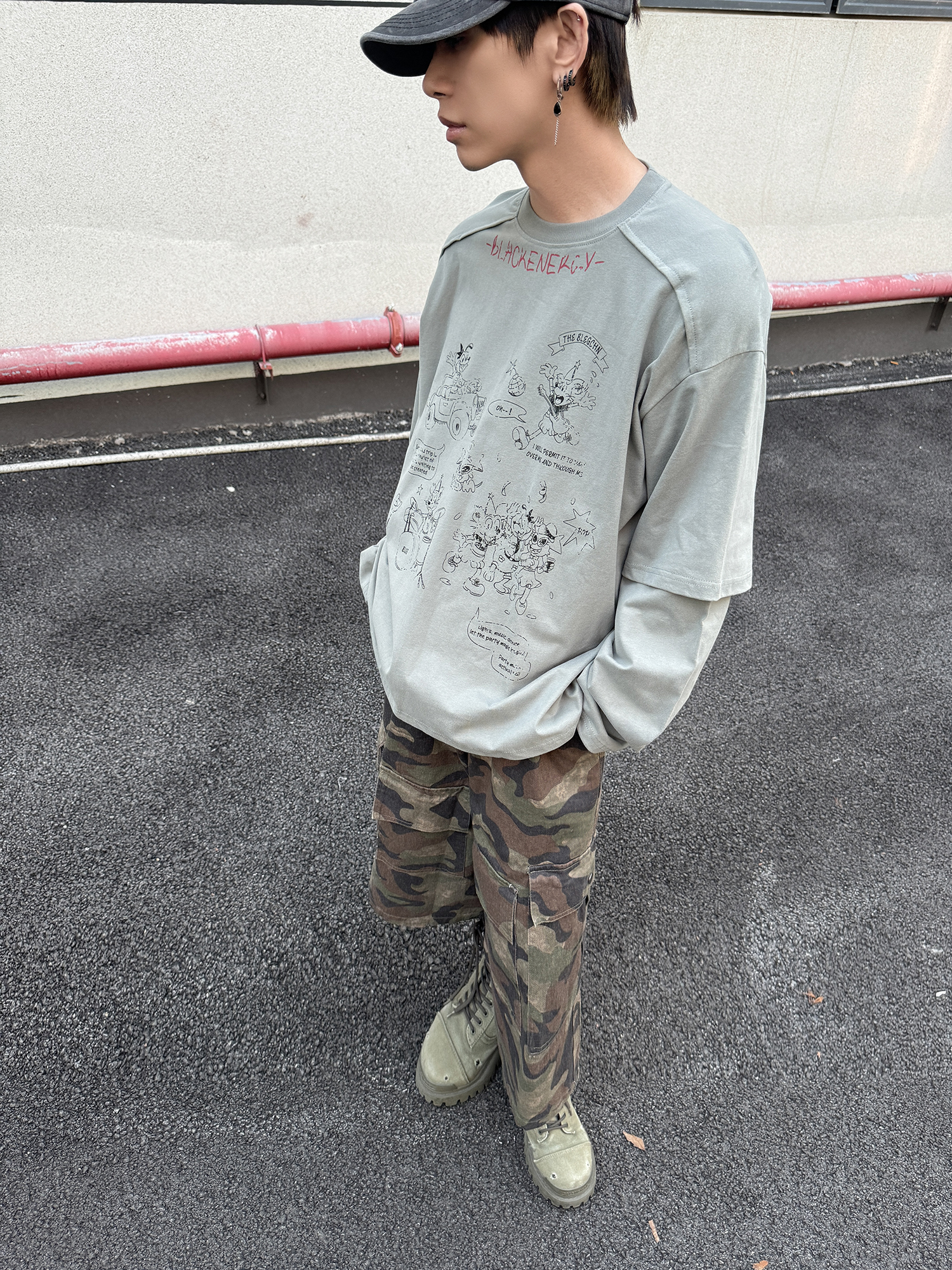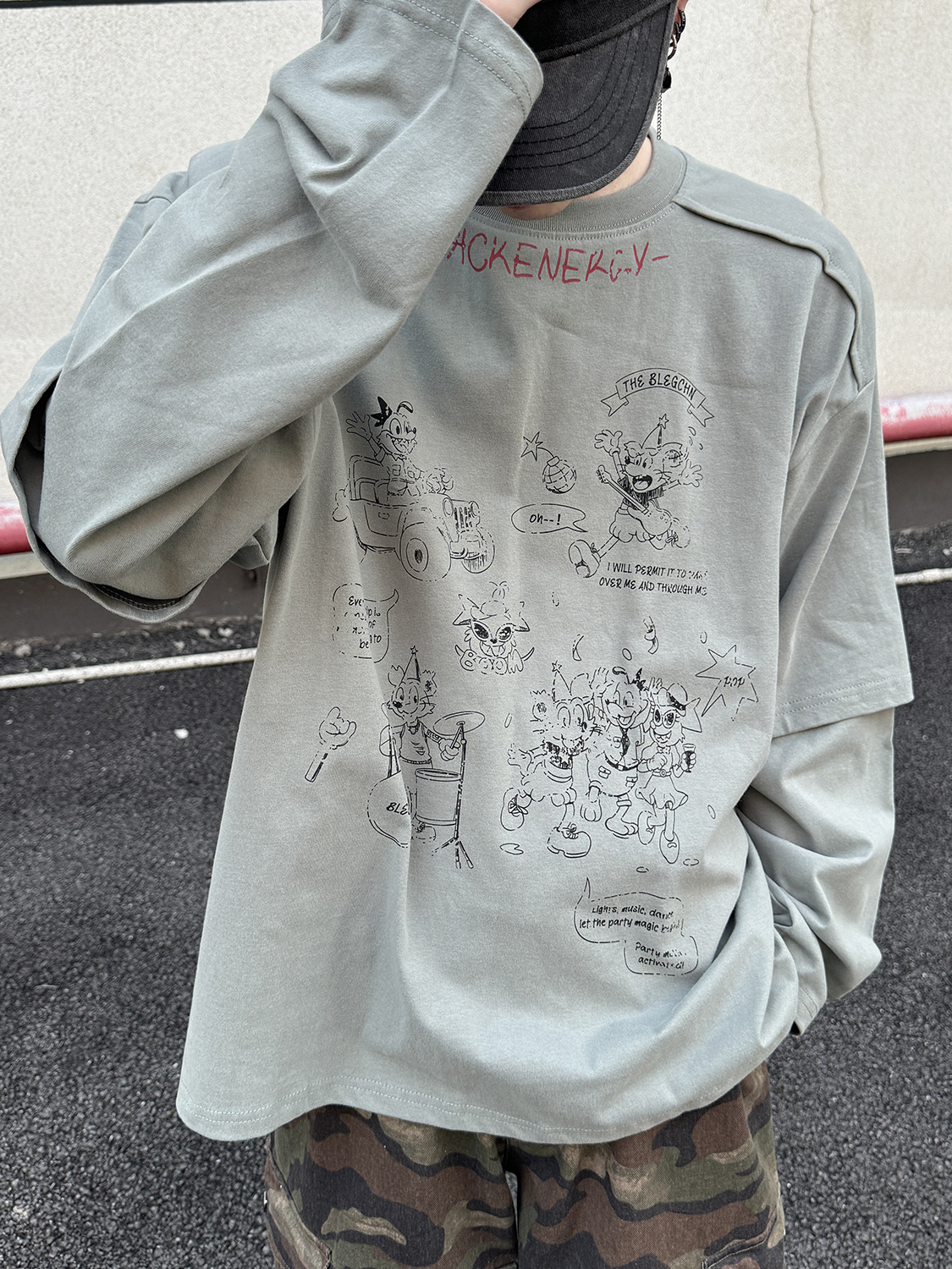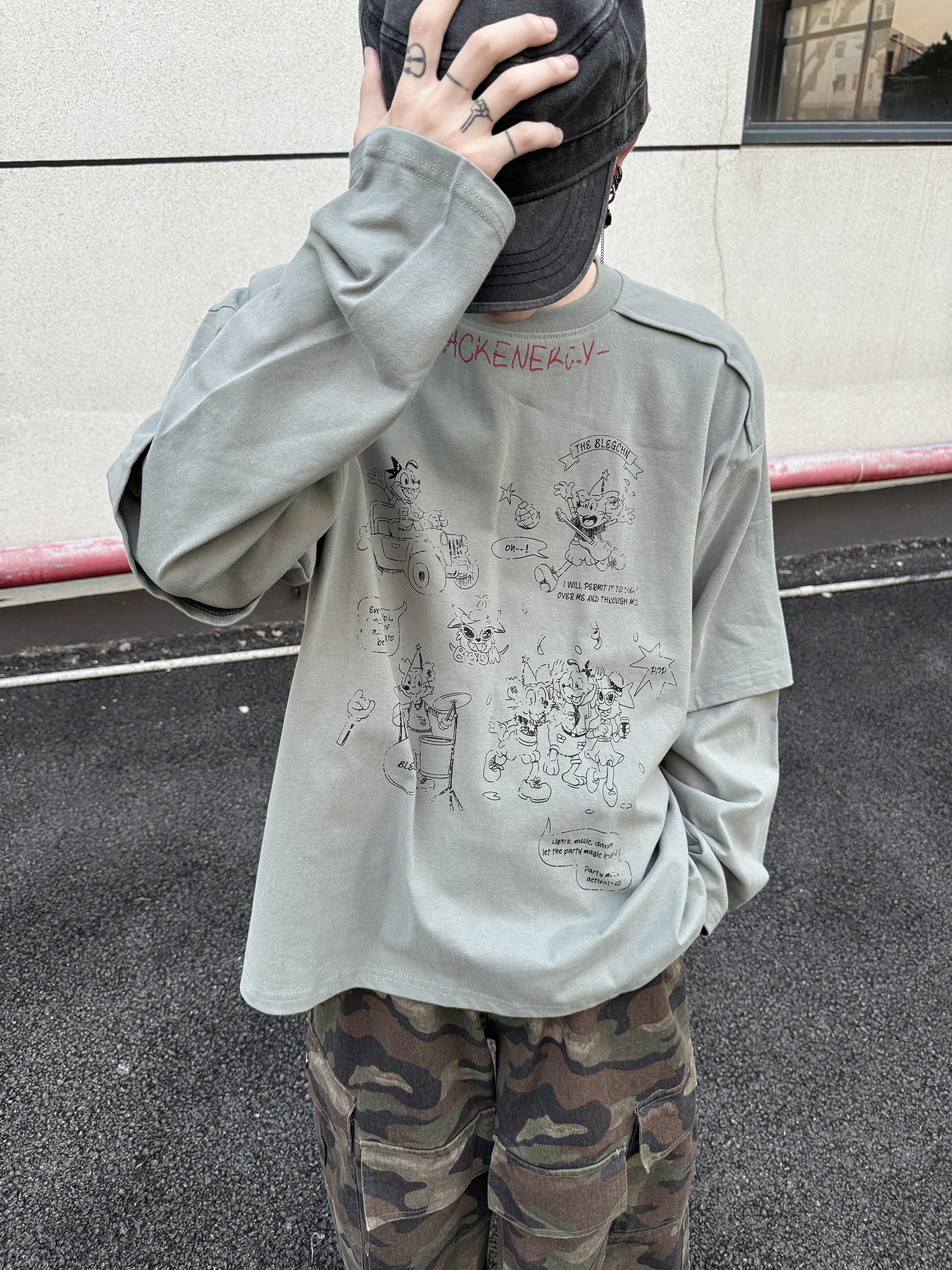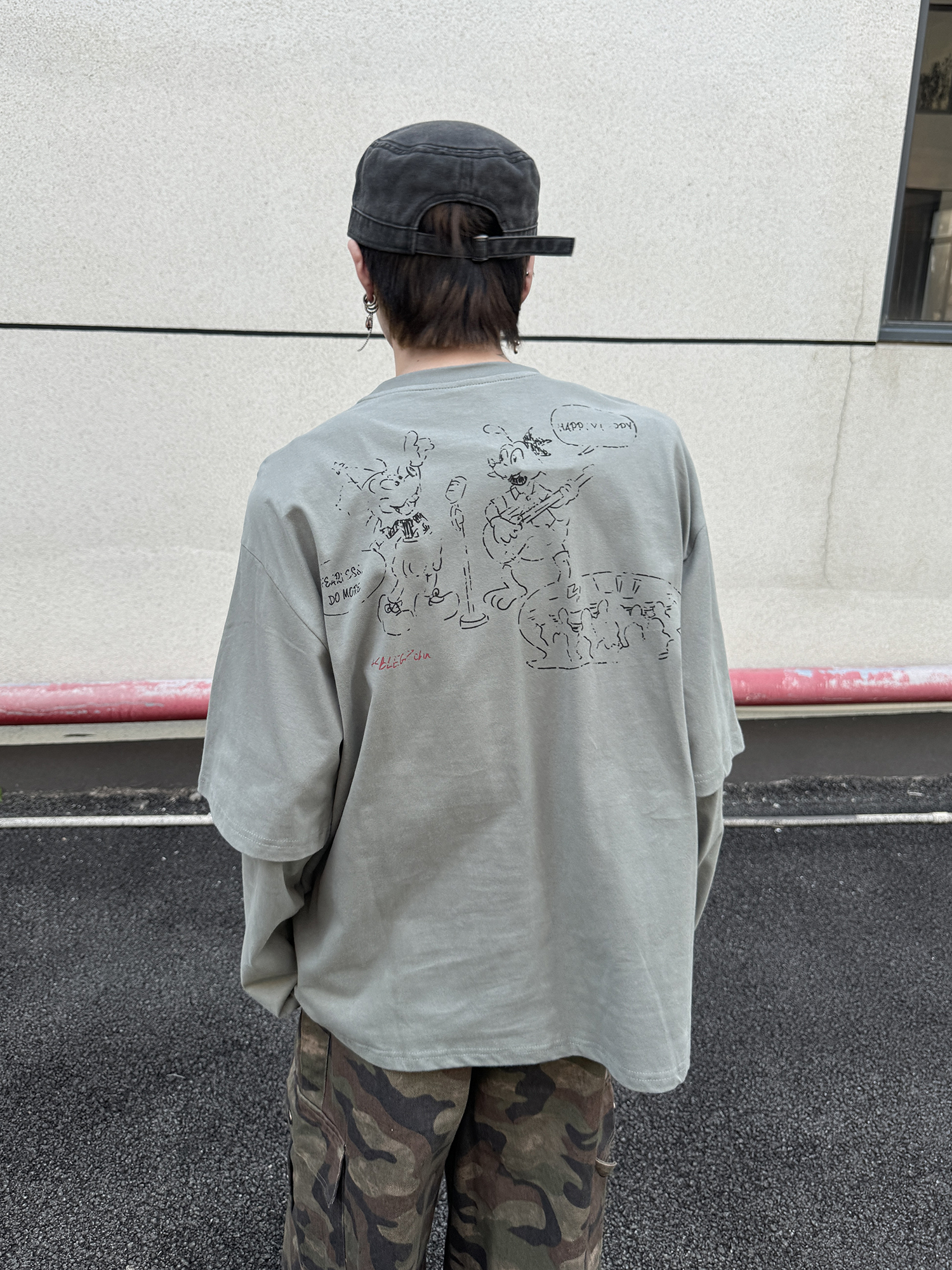 Fake Layered Back Graffiti Print Oversize Long Sleeve T-Shirt WN21154