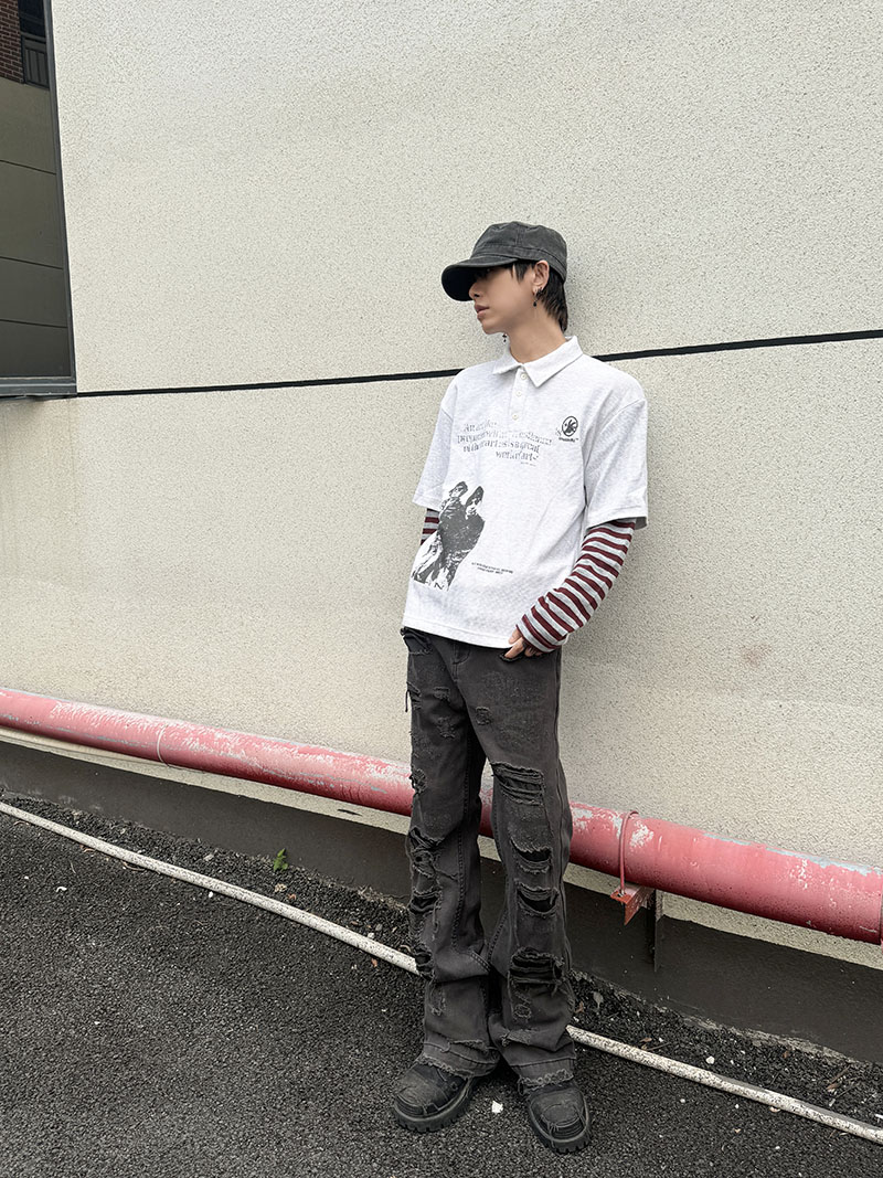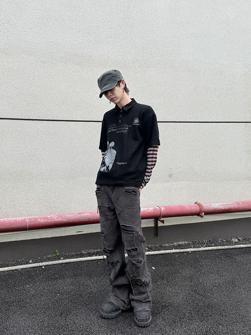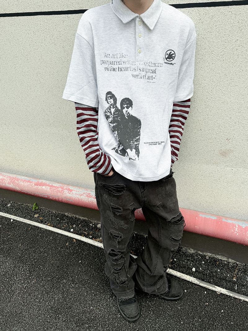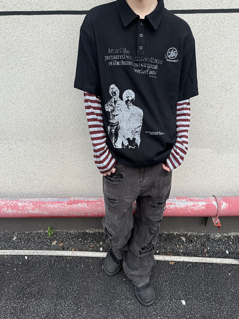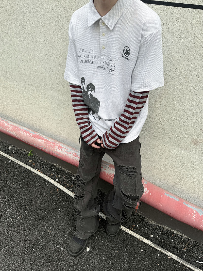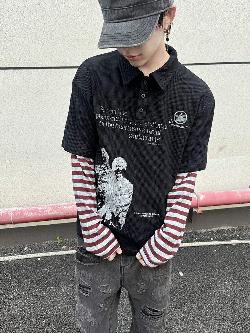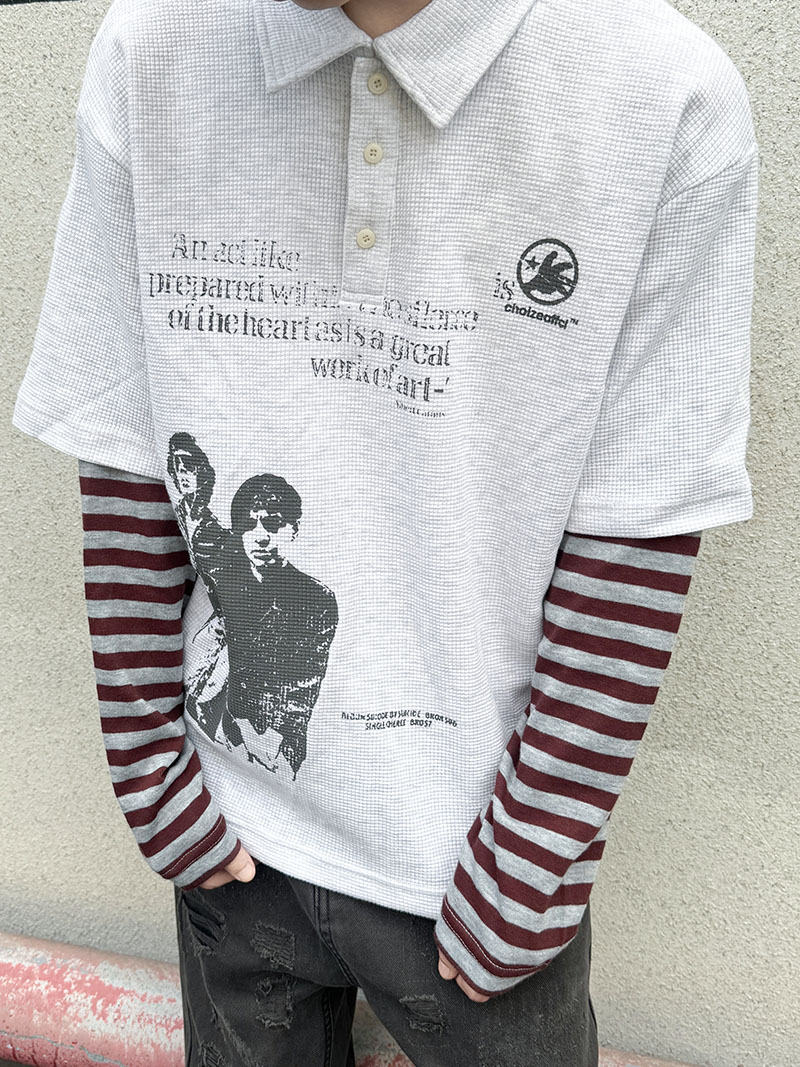 Fake Layered Stripe Long Sleeve Polo Shirt WN21159