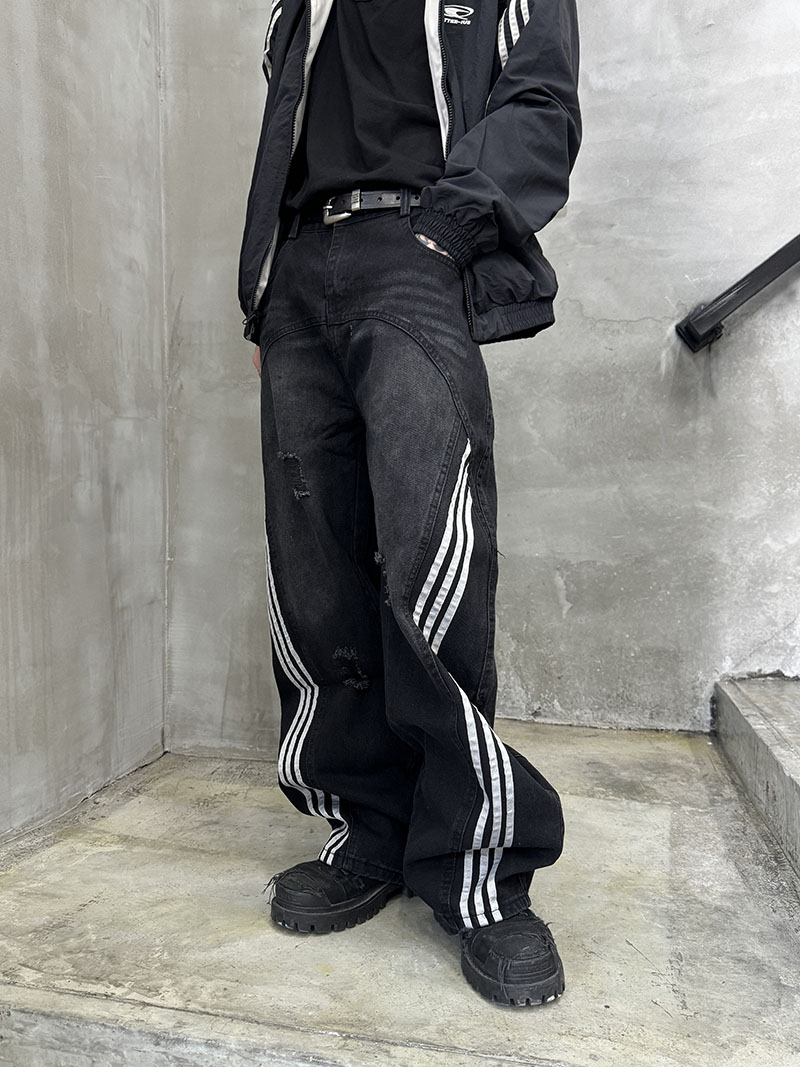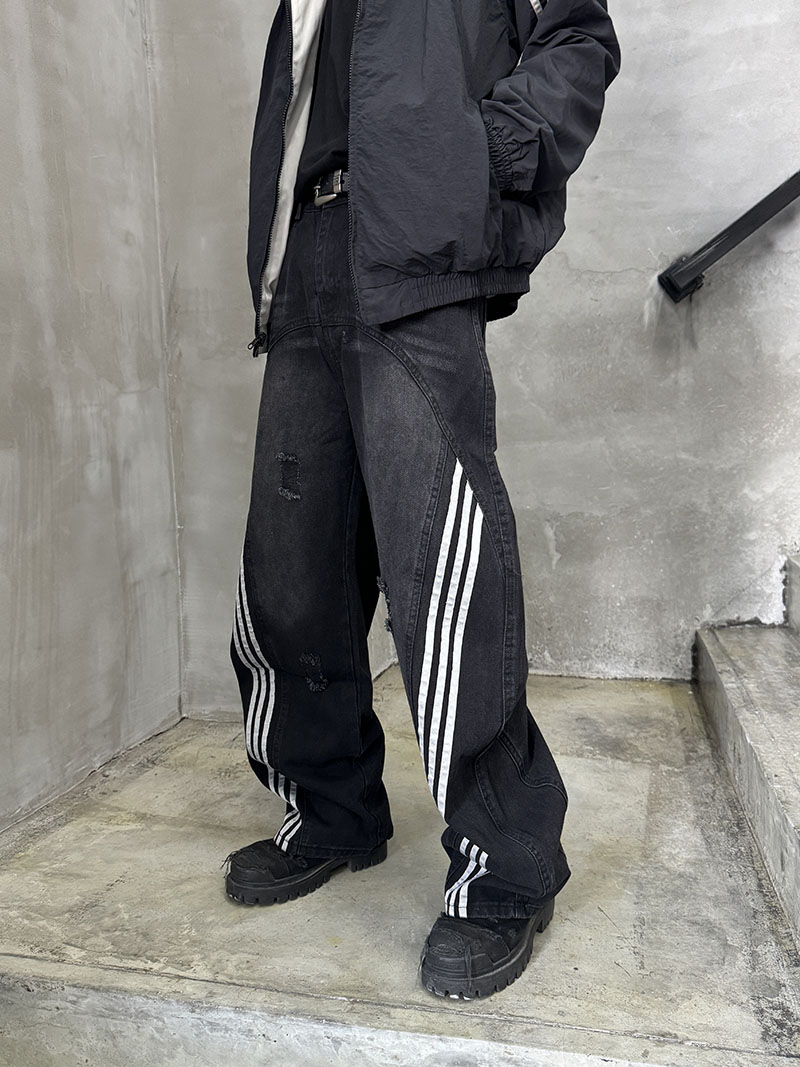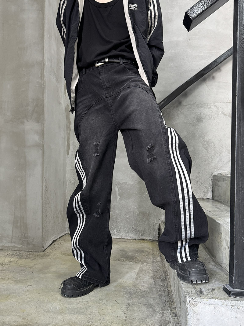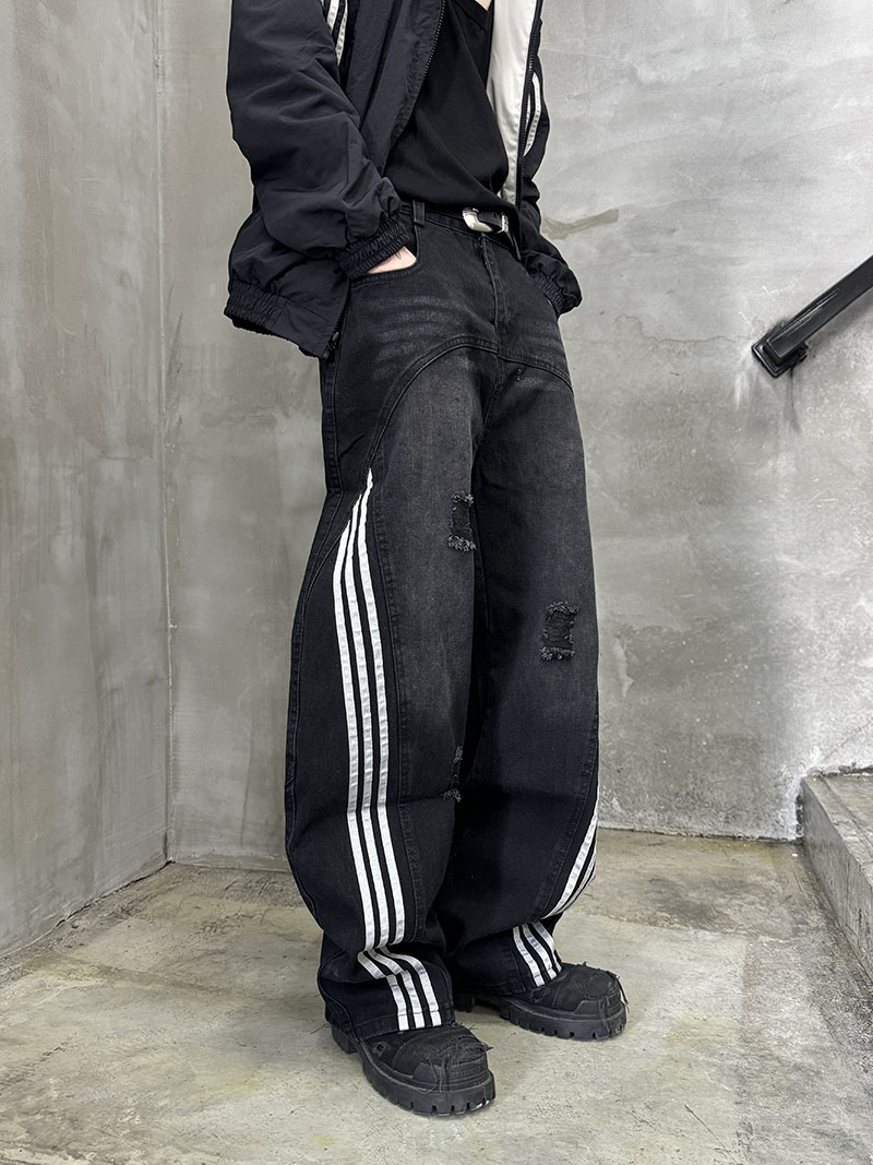 Damage Side Stripe Washed Wide Leg Denim Jeans WN21174