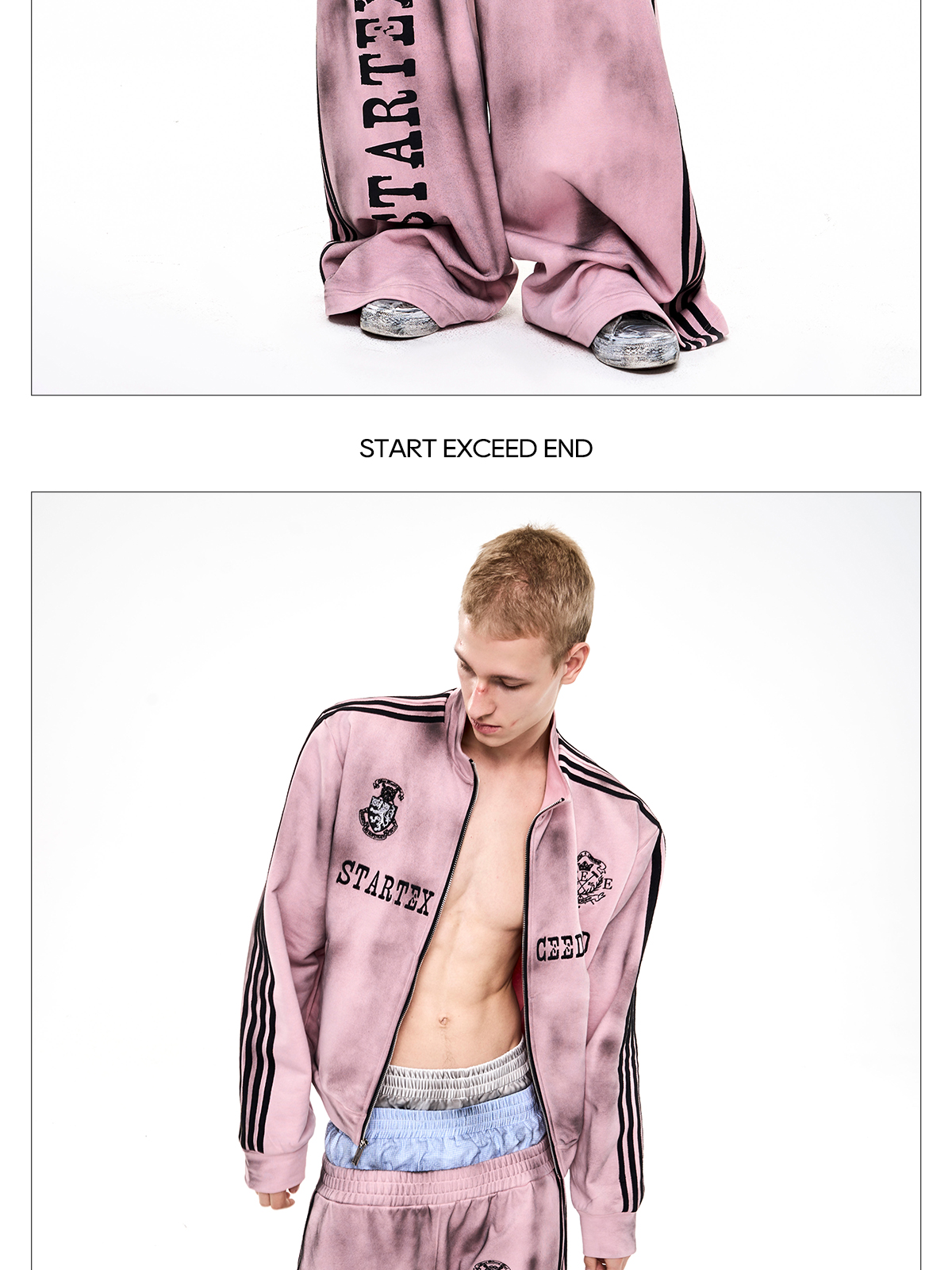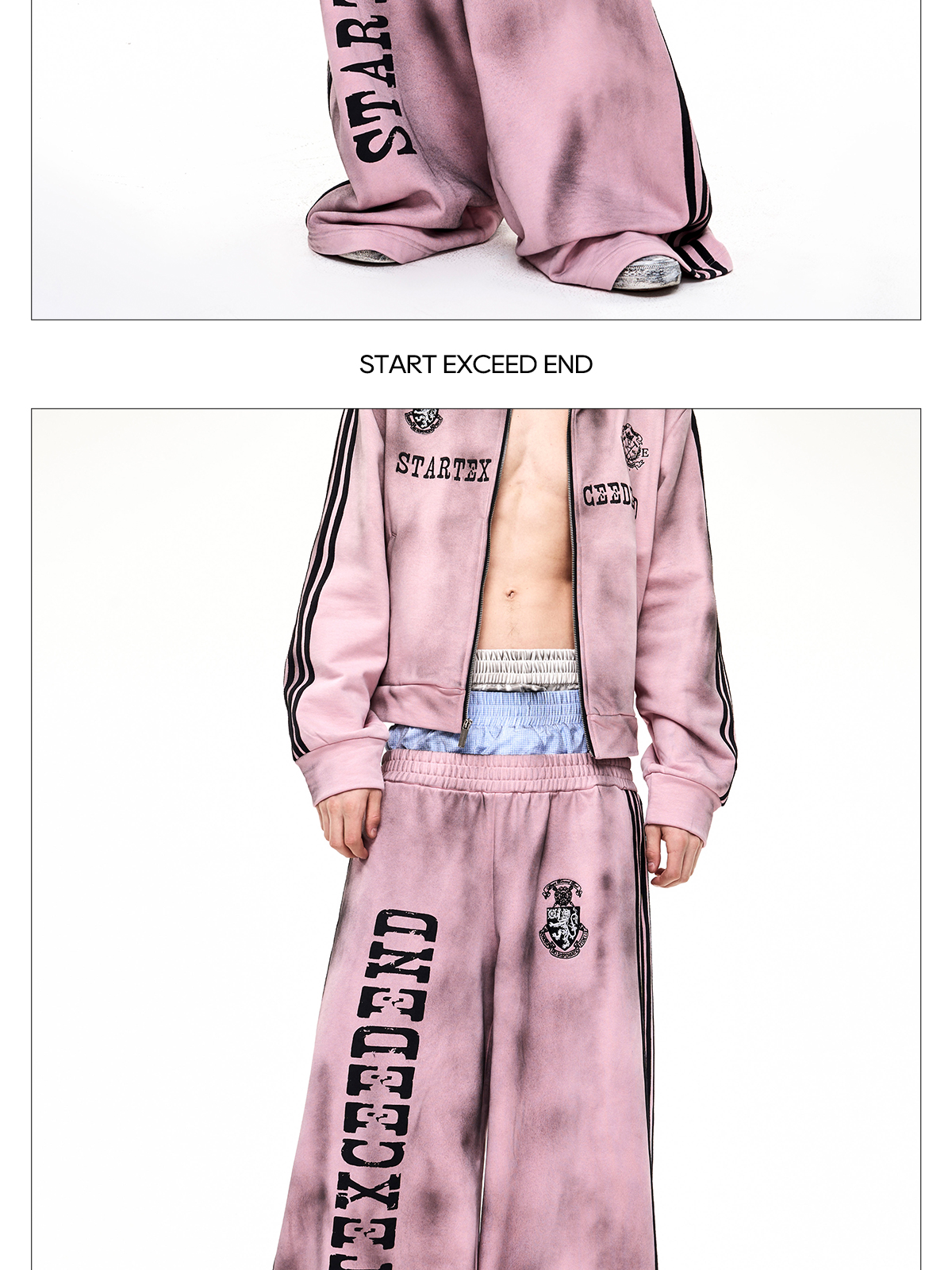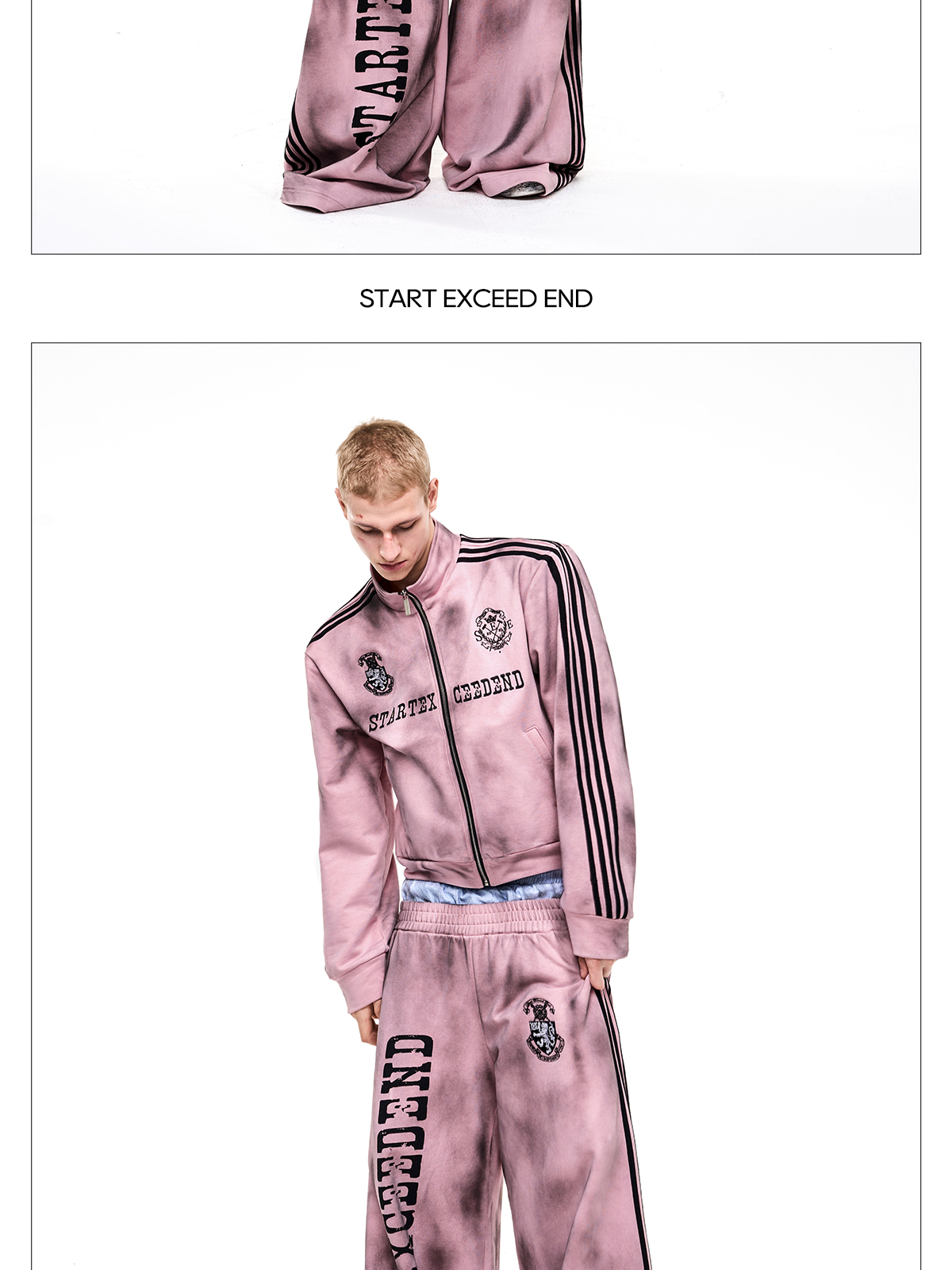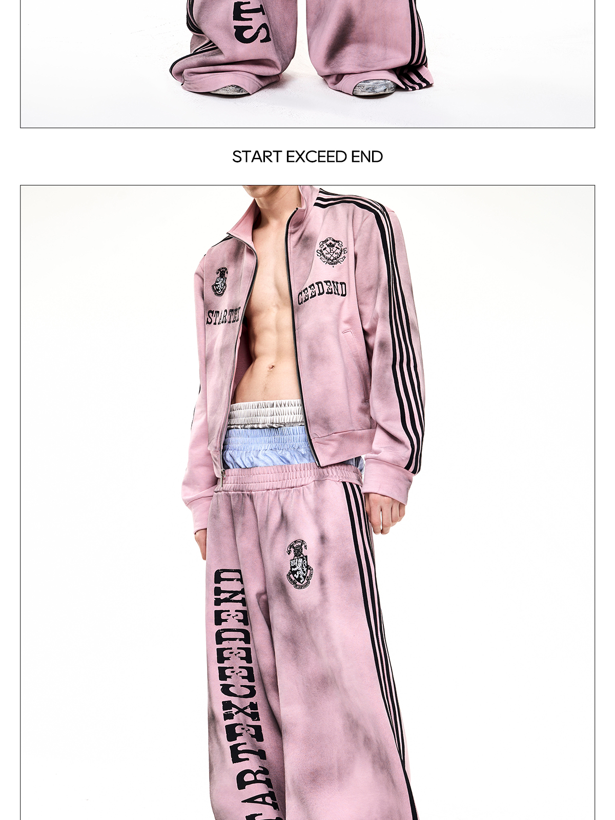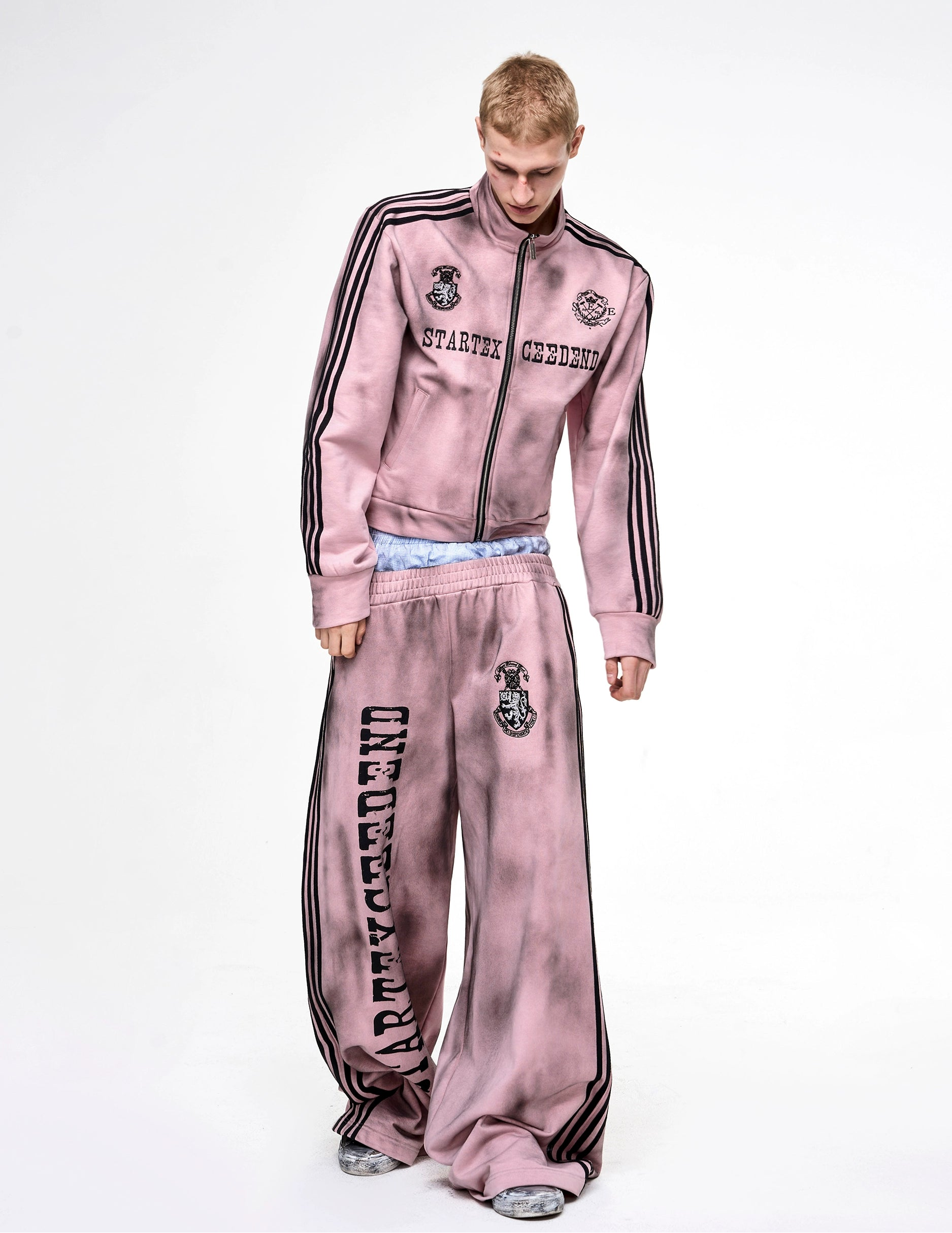 Four-Bar Spray Damage Stand Neck Zopper Jacket & Wide Leg Pants Set WN21811