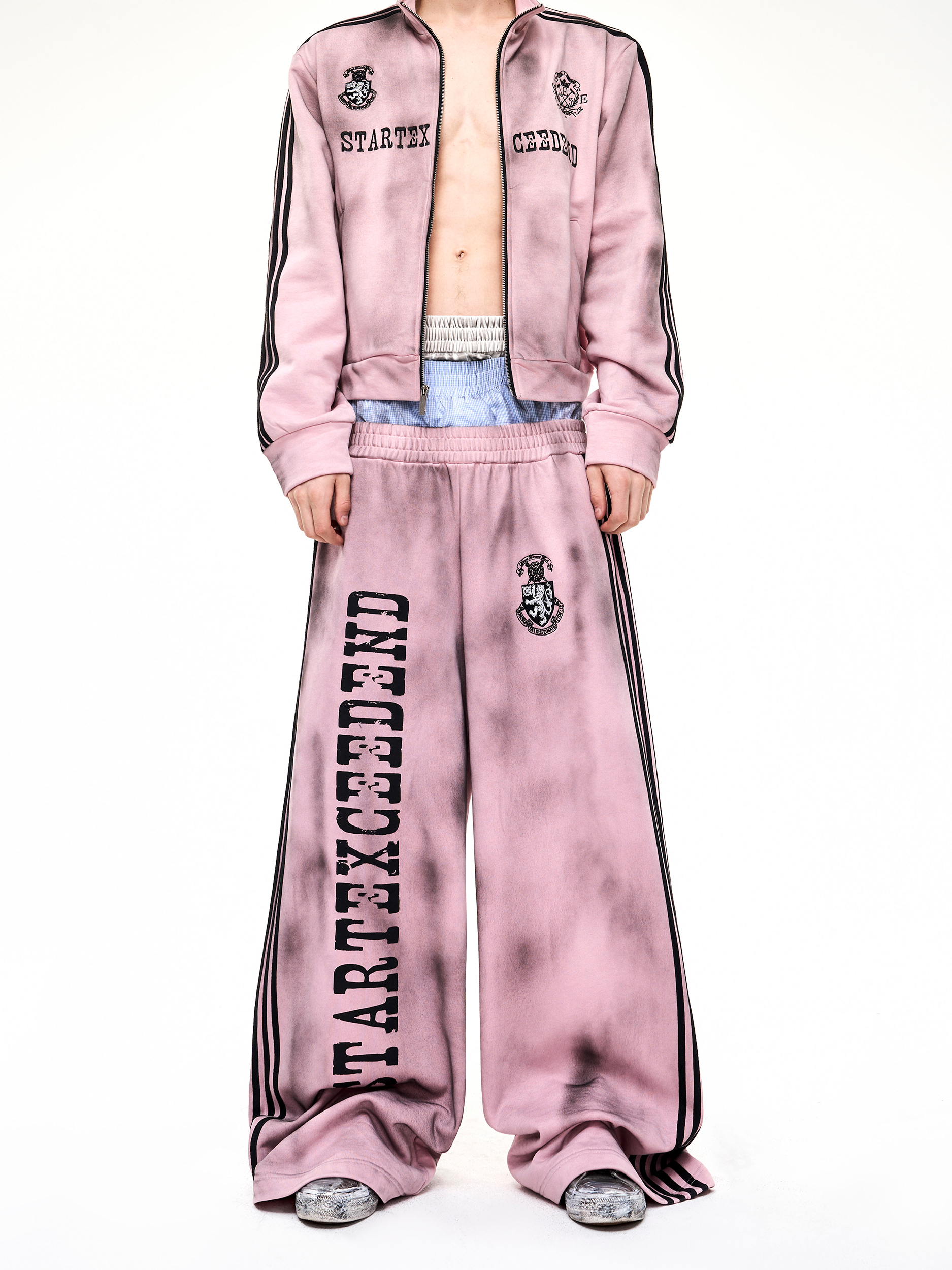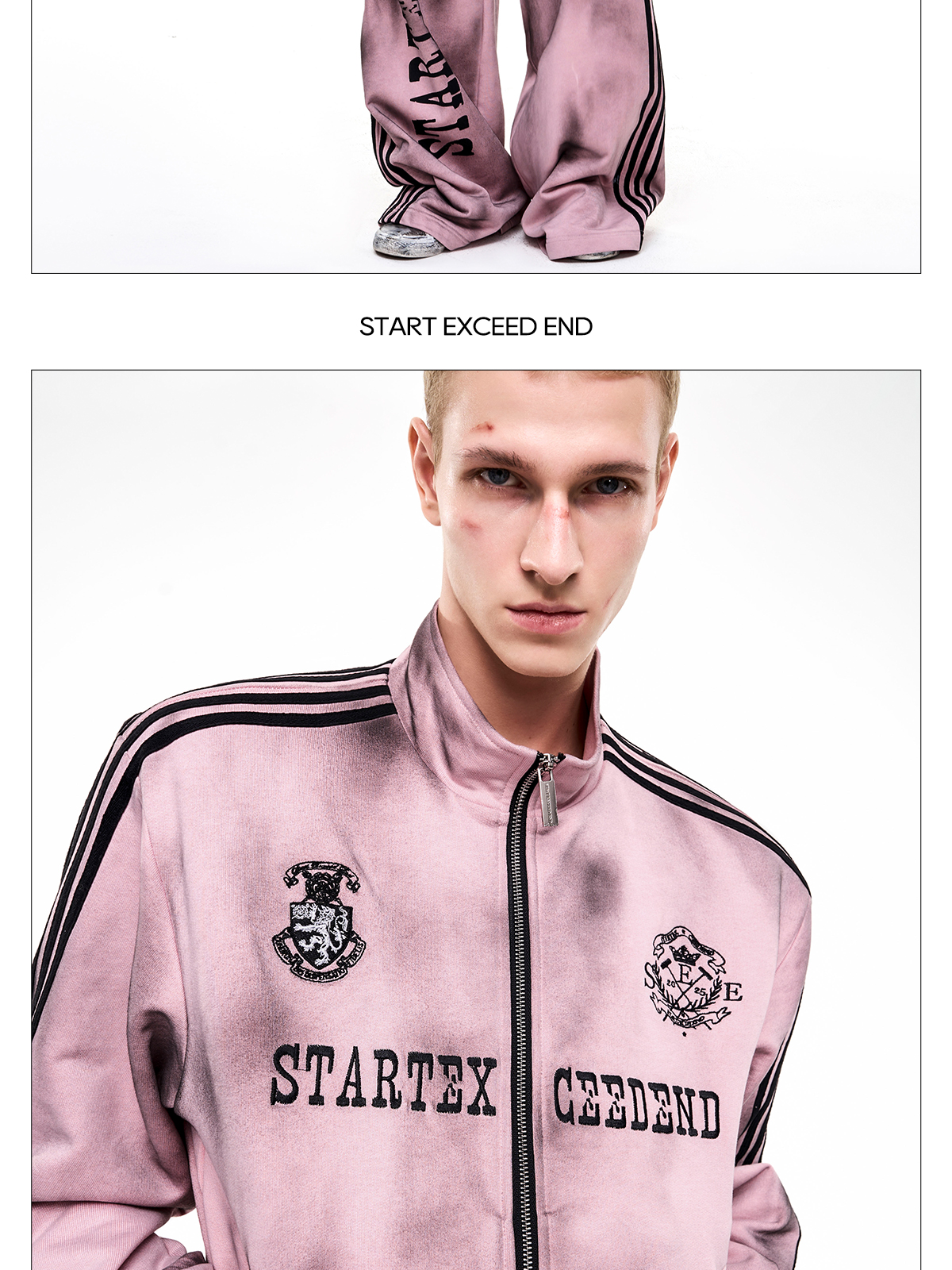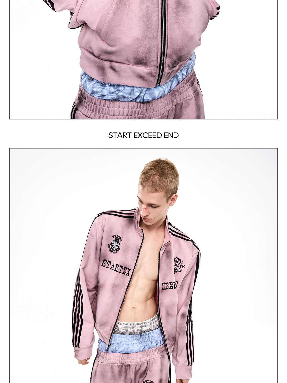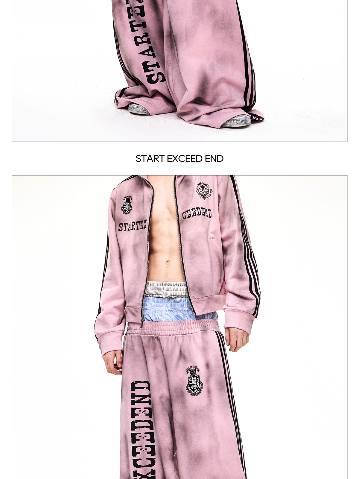 Four-Bar Spray Damage Stand Neck Zopper Jacket & Wide Leg Pants Set WN21811