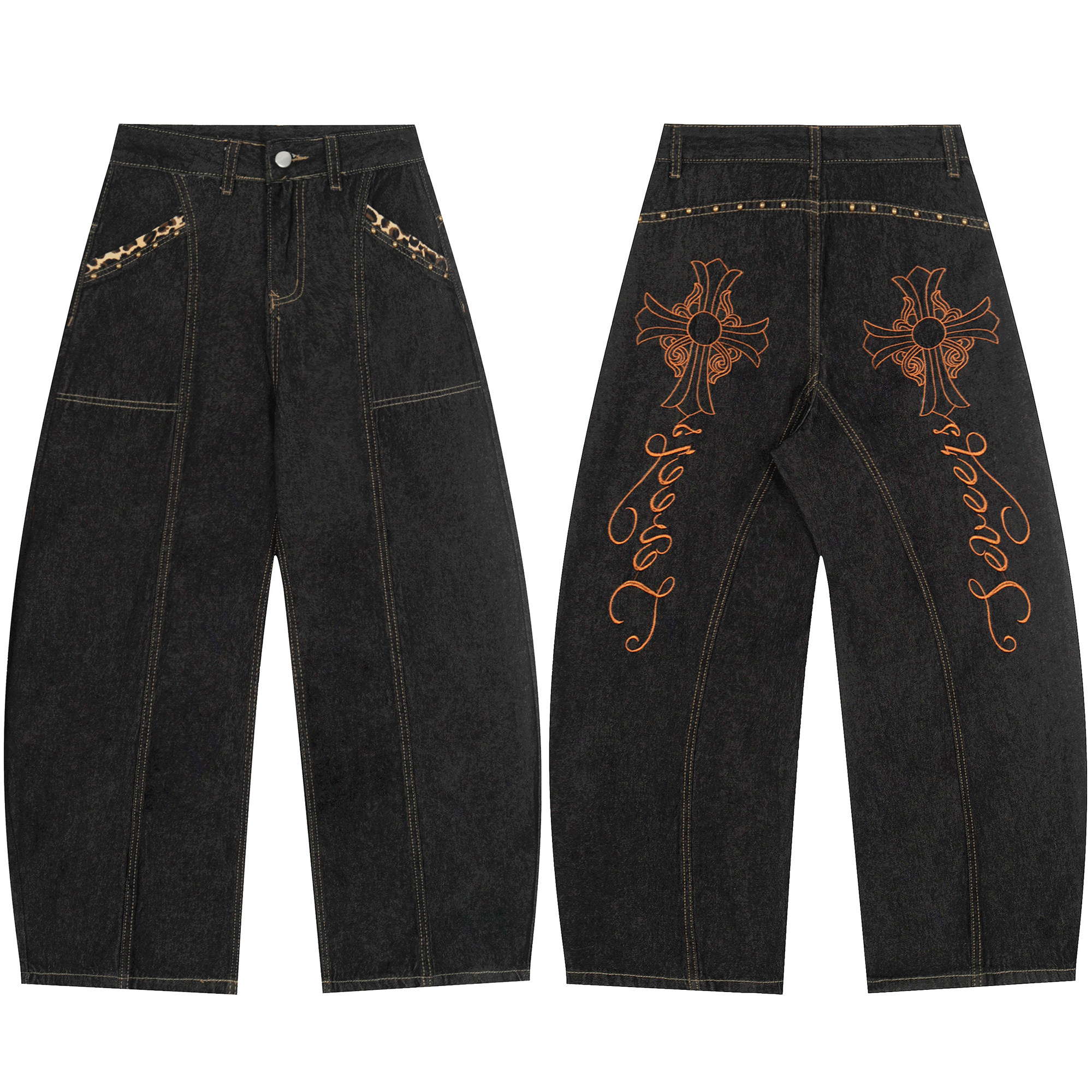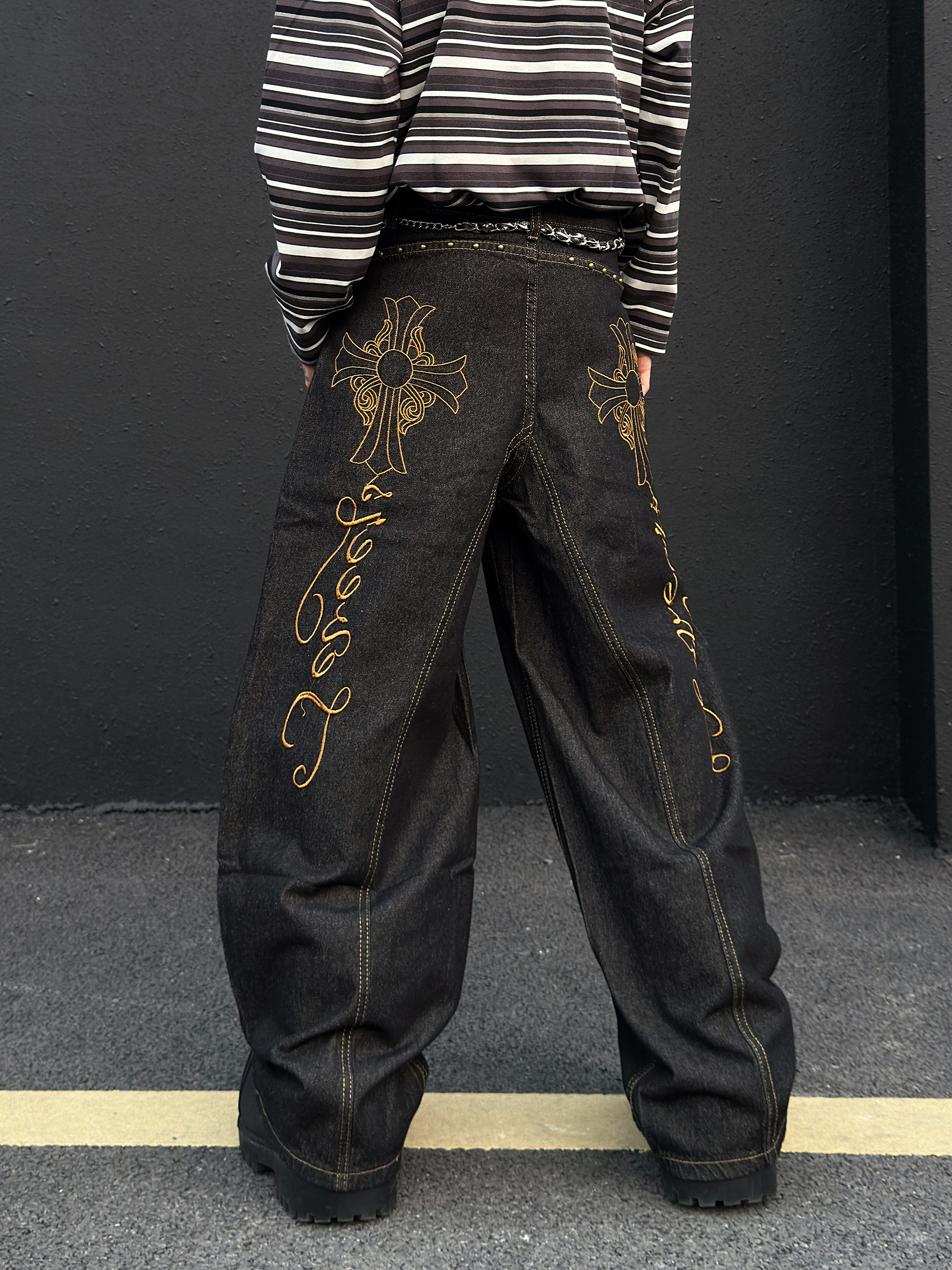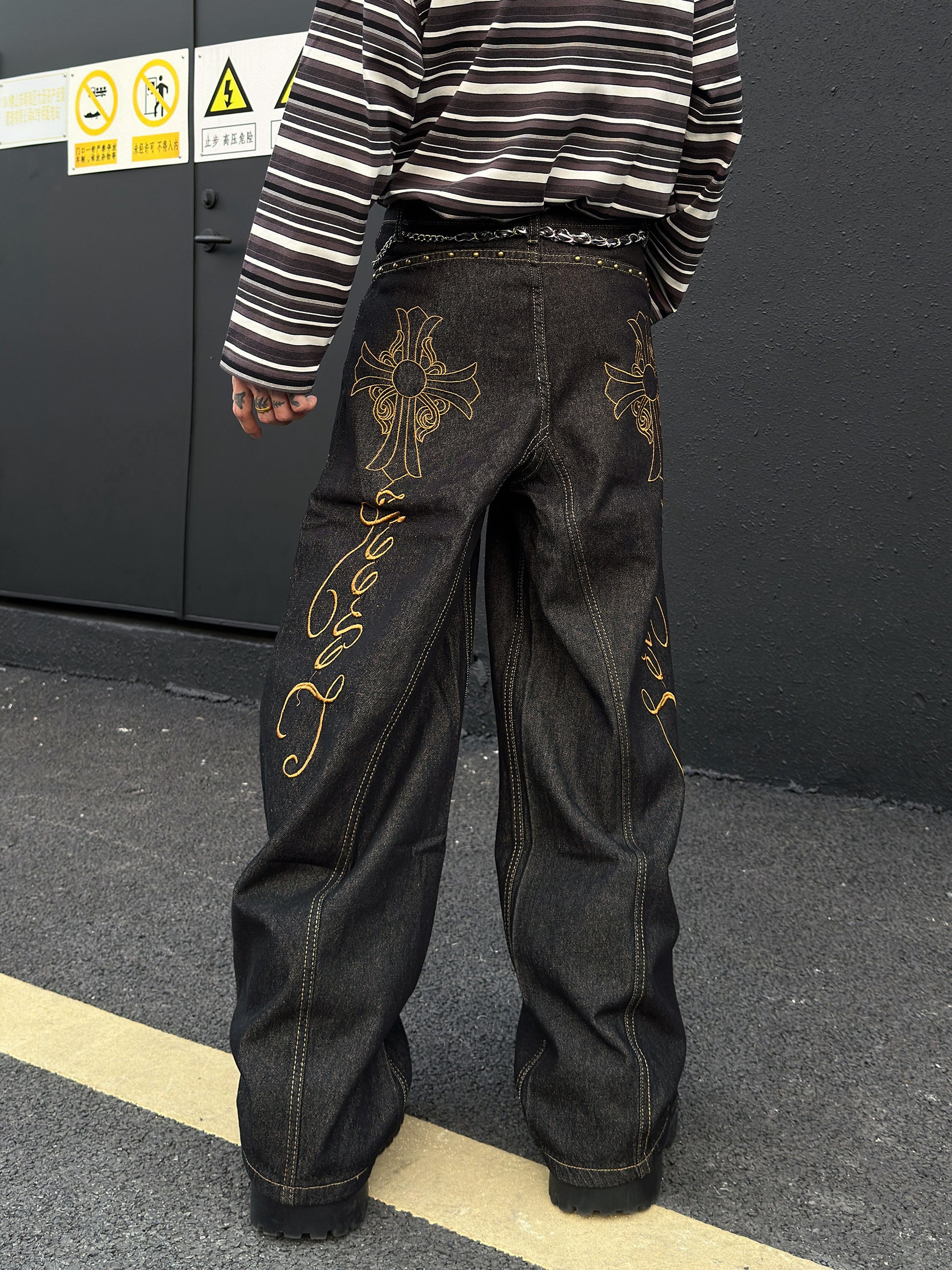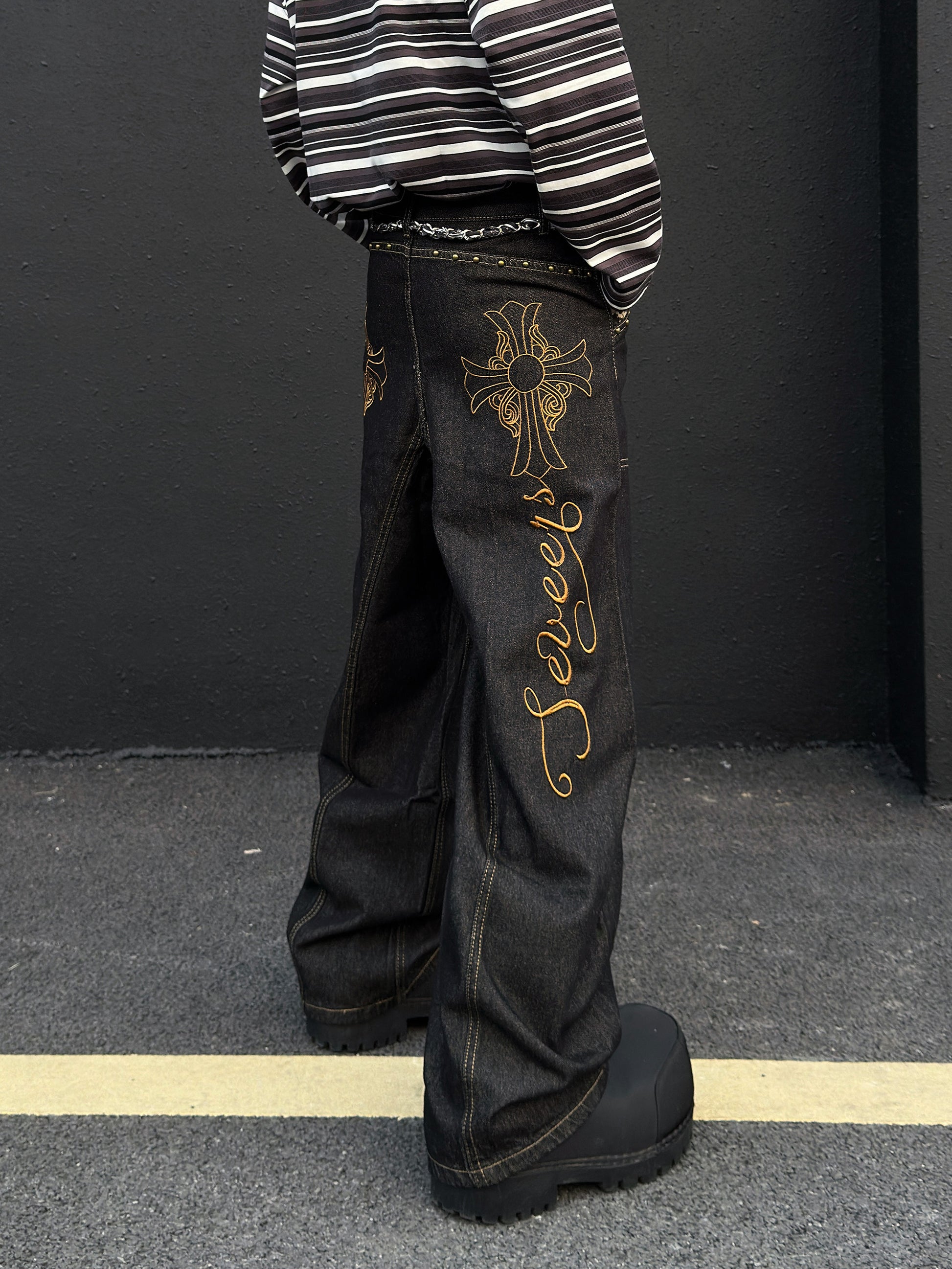 Cross Embroidery Wash Curved Cut Wide Leg Denim Jeans WN23023