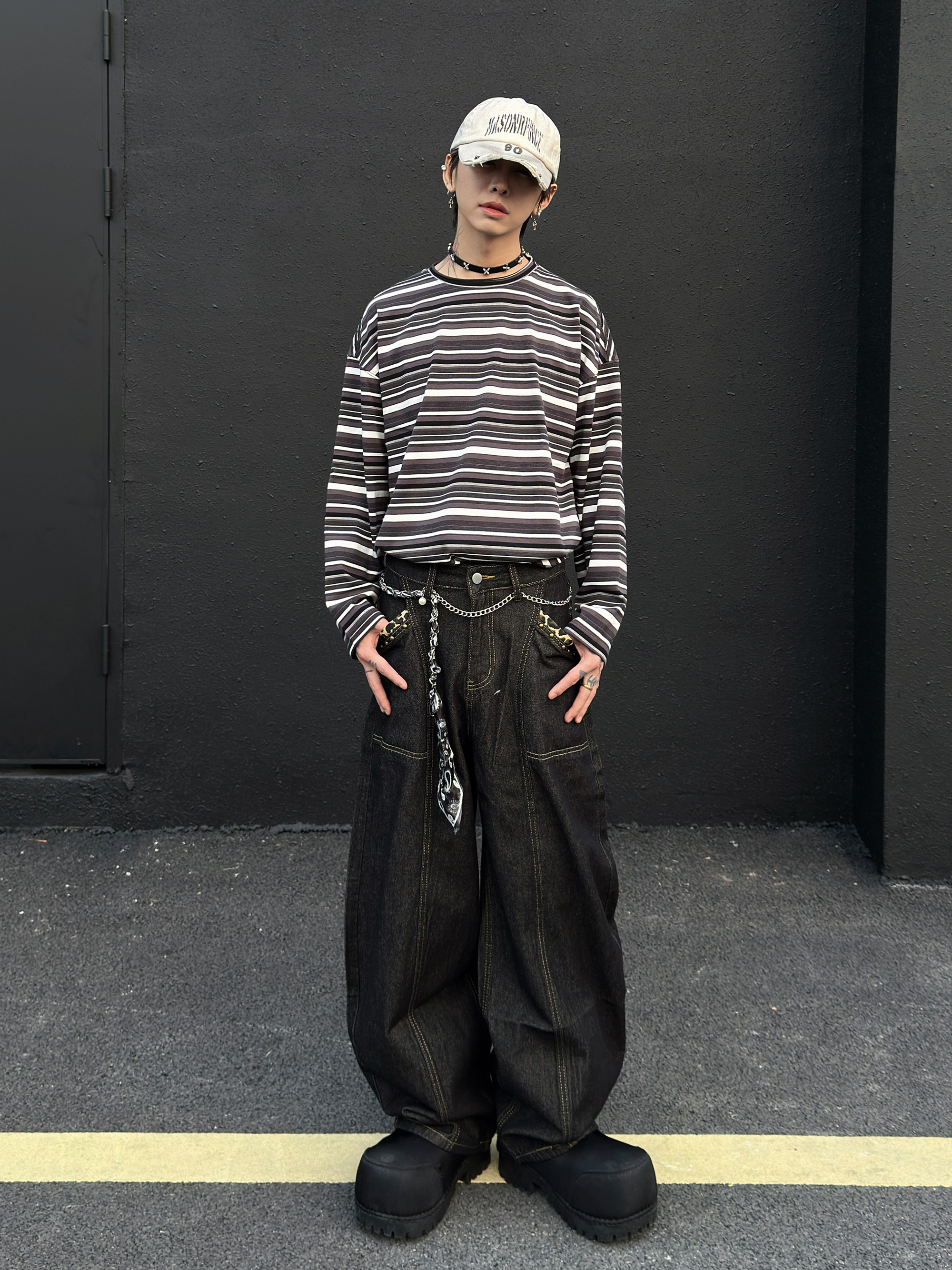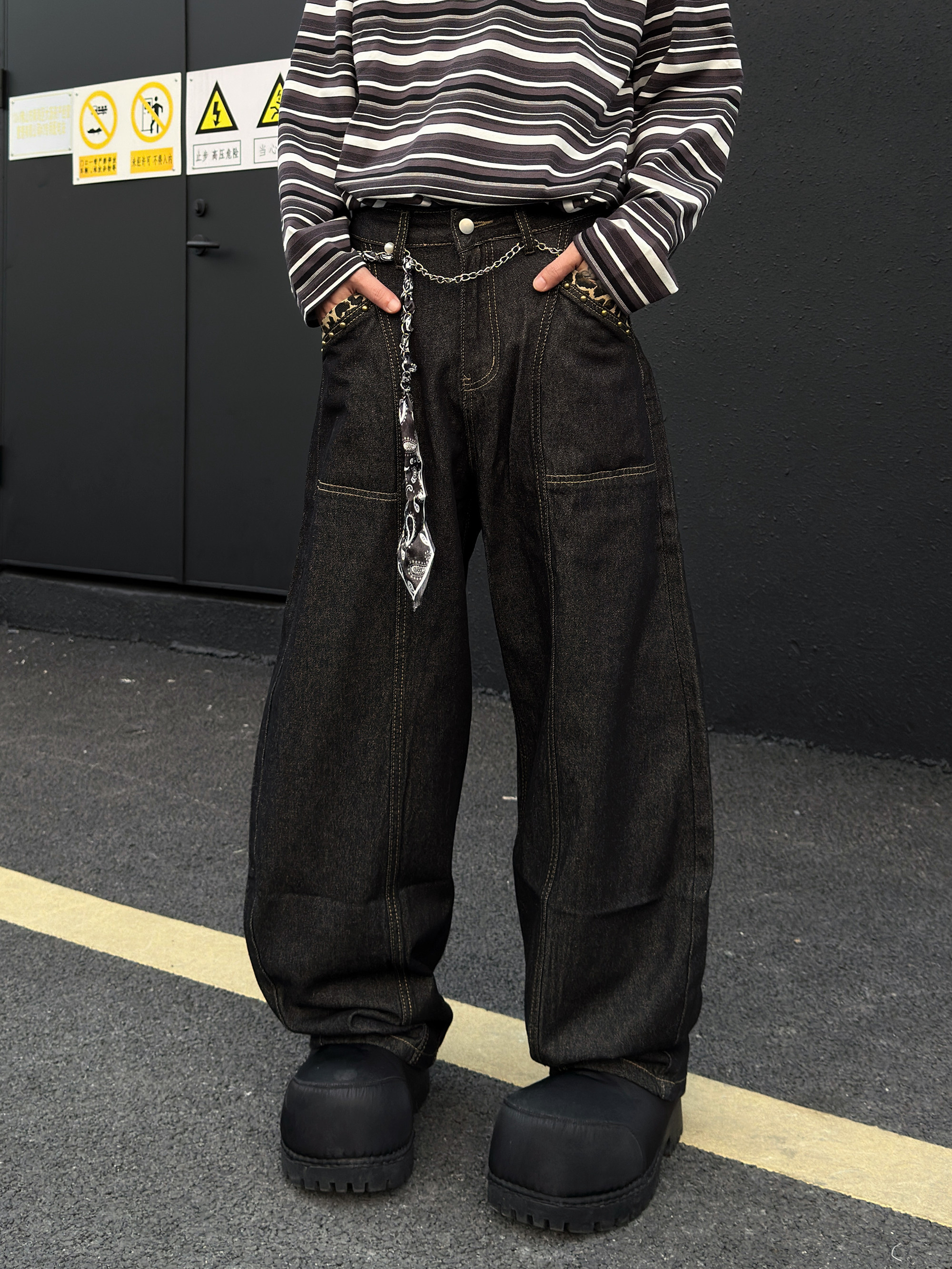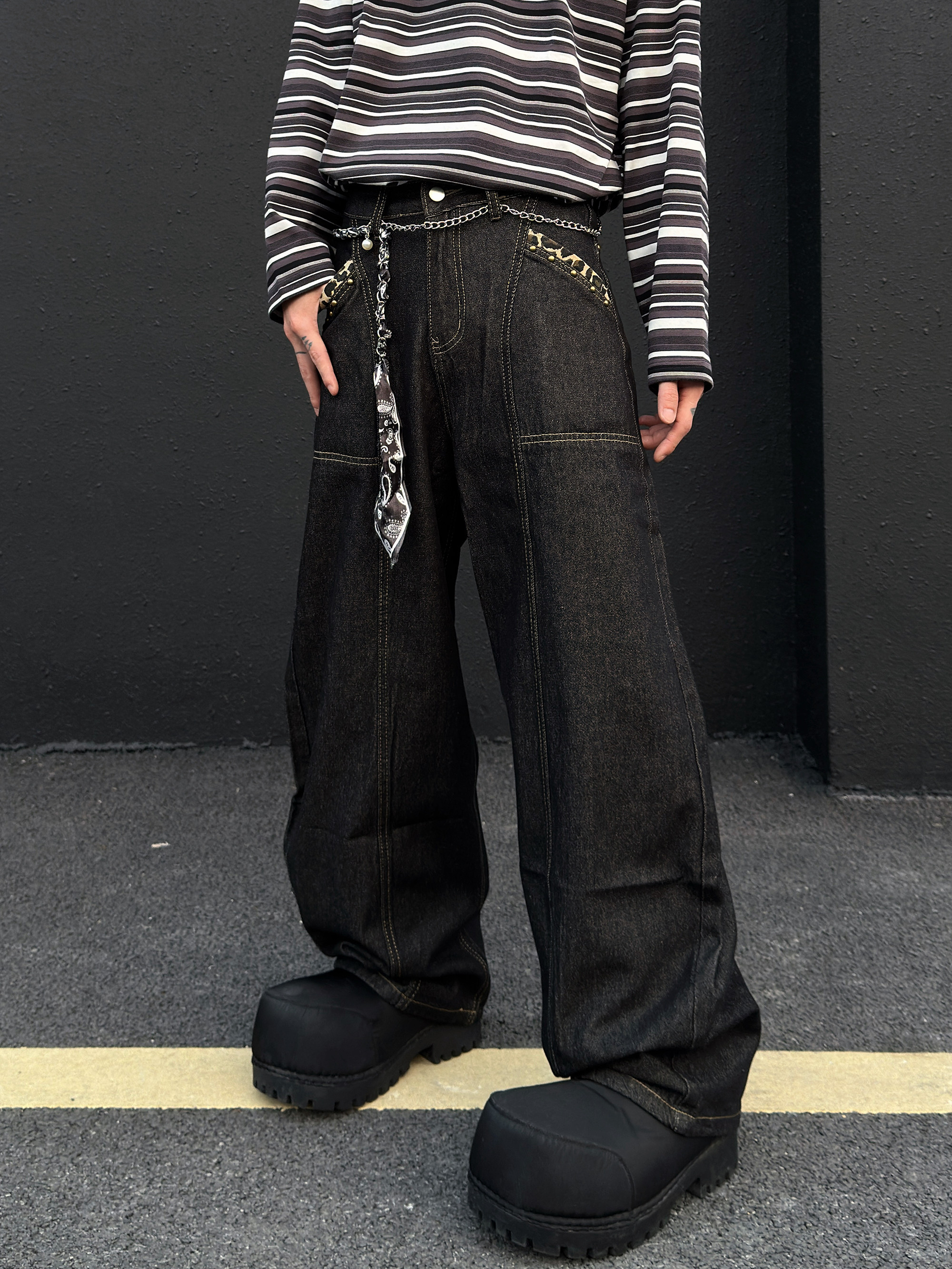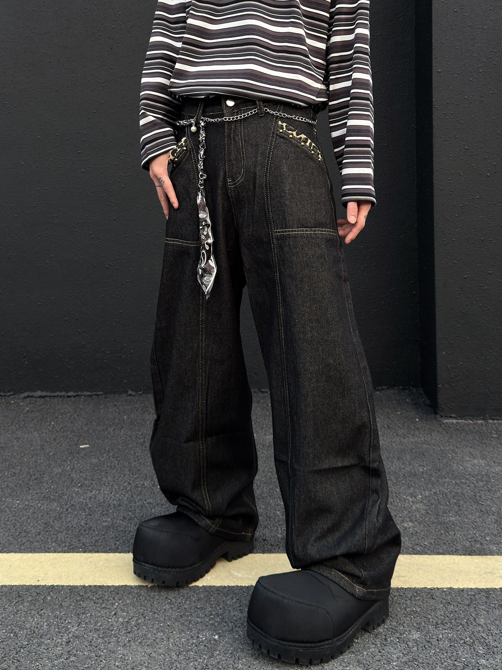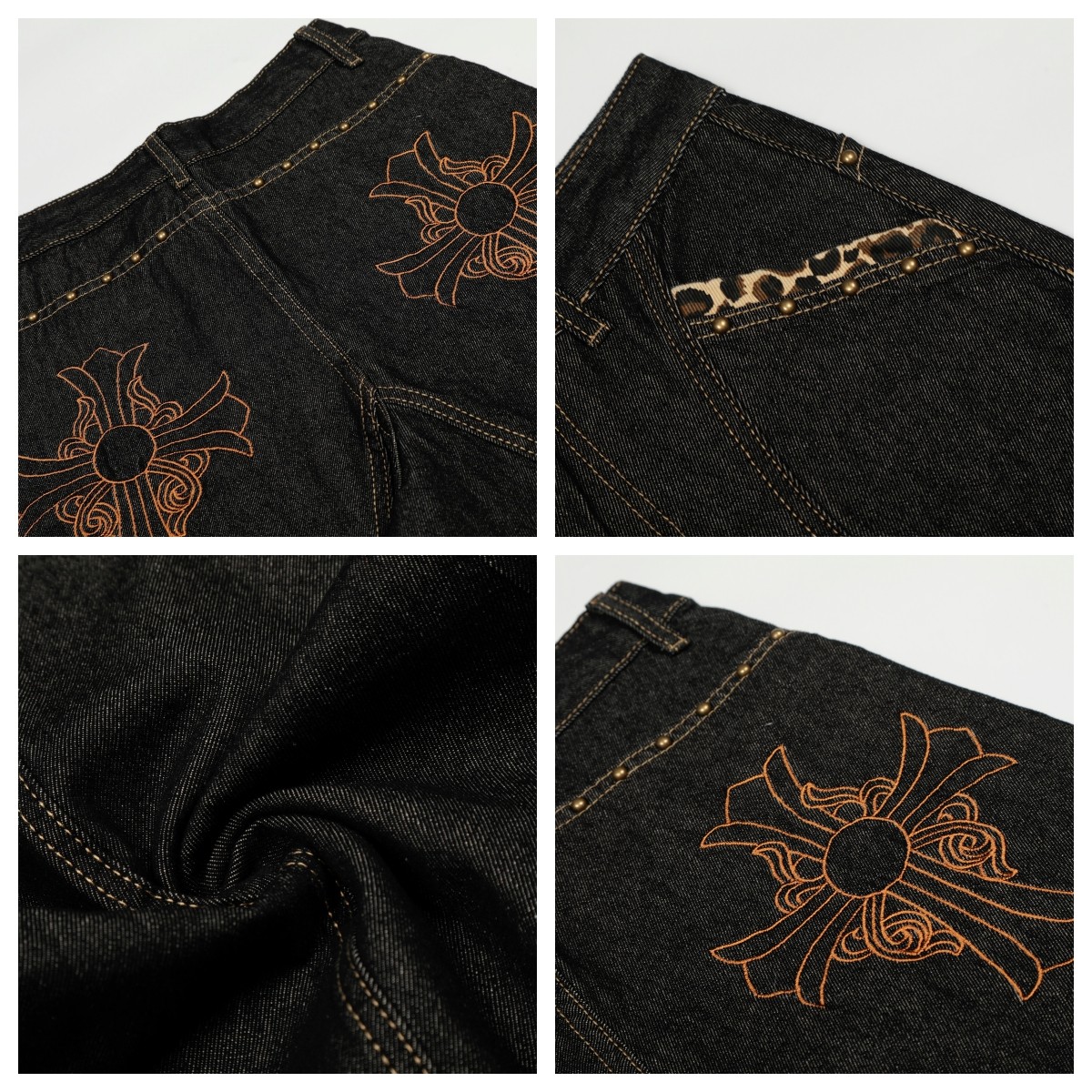 Cross Embroidery Wash Curved Cut Wide Leg Denim Jeans WN23023