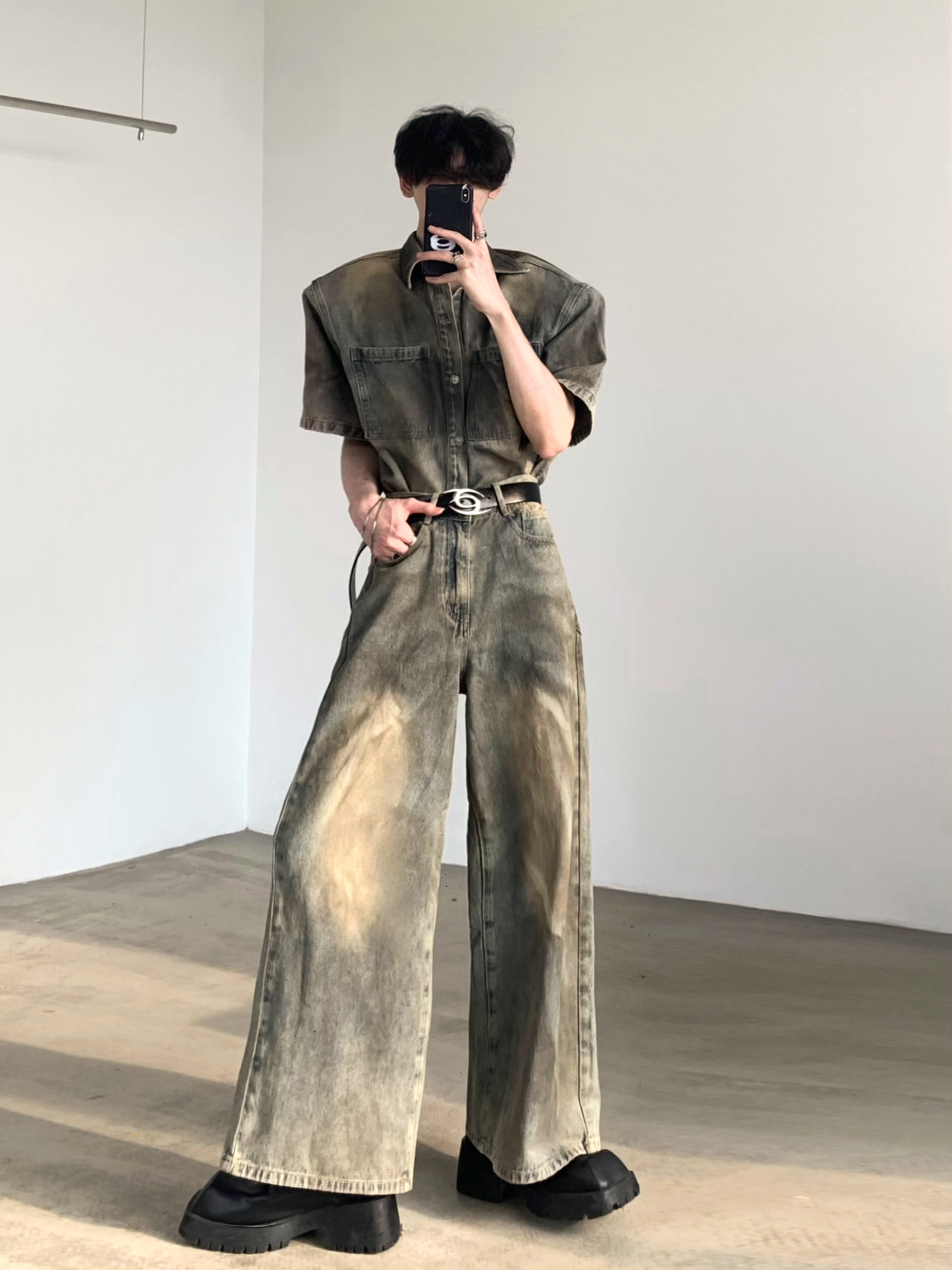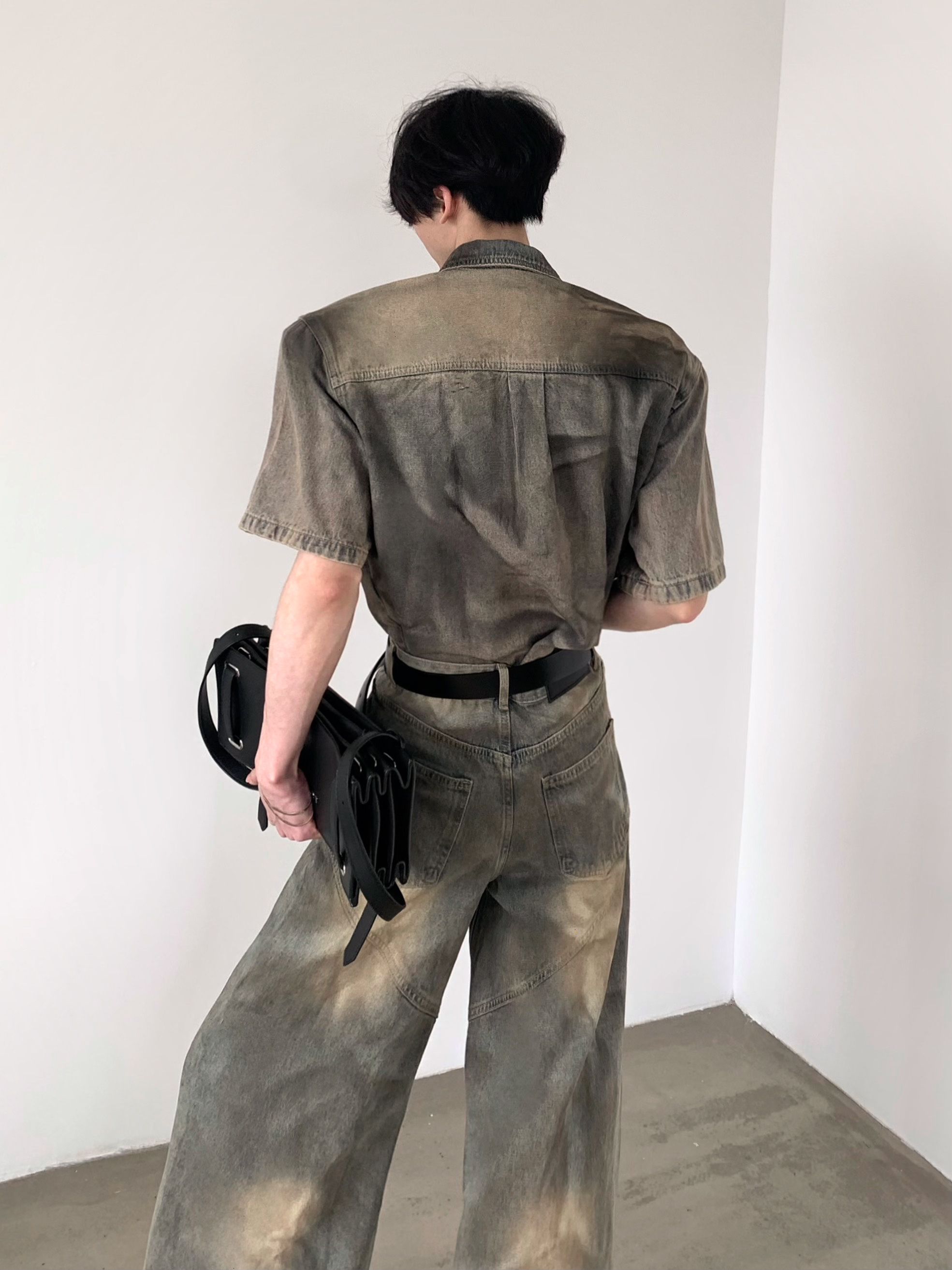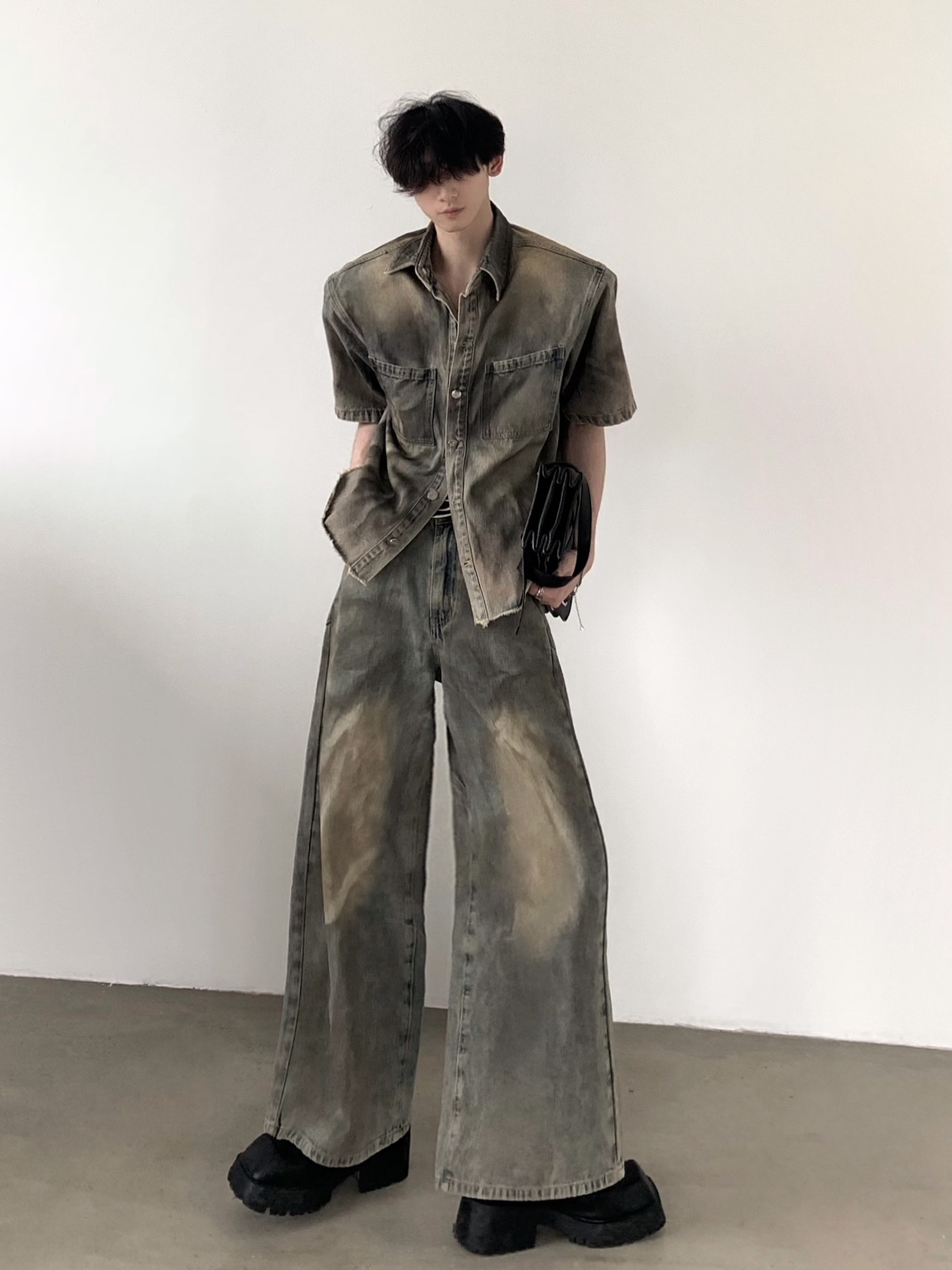 Washed Denim Short Sleeve Shirt & Wide-Leg Denim Jeans Setup WN7047