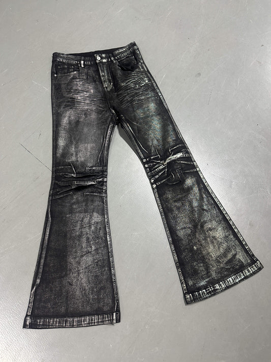 Foil Print Wax Coating Stretch Washed Flare Denim Jeans WN15779